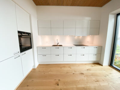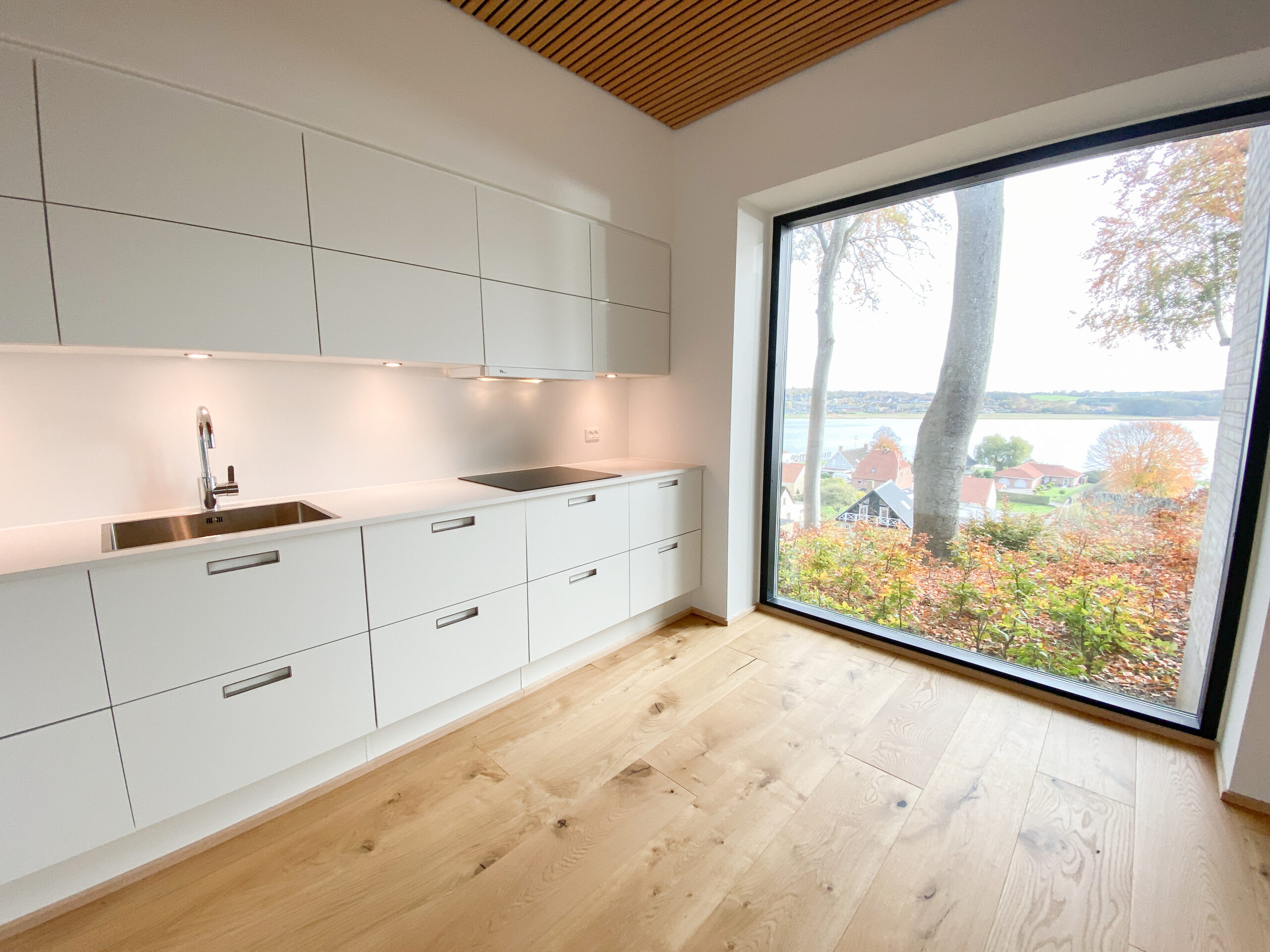 Indenfor møder du detaljer som herregårds-plankede gulve og lofter i egetræ, der elegant forbinder hjemmets indre med skovens natur. Køkkenet fra Svane i hvide elementer inviterer til madlavning og samvær, mens middagsbordet rammer samtaler mod udsigten som et levende maleri.