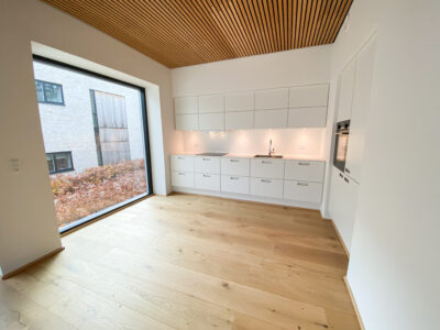 Indenfor møder du detaljer som herregårds-plankede gulve og lofter i egetræ, der elegant forbinder hjemmets indre med skovens natur. Køkkenet fra Svane i hvide elementer inviterer til madlavning og samvær, mens middagsbordet rammer samtaler mod udsigten som et levende maleri.