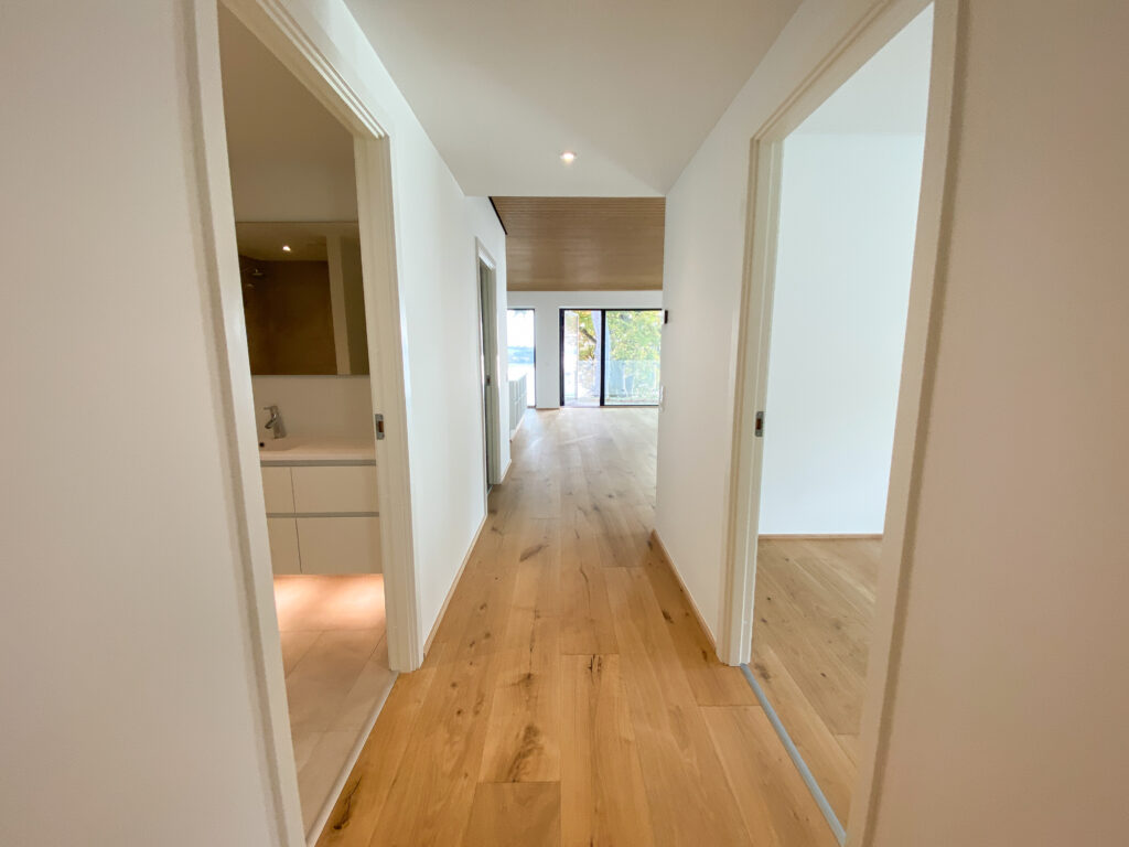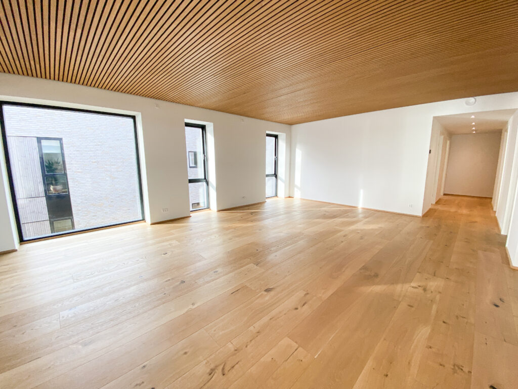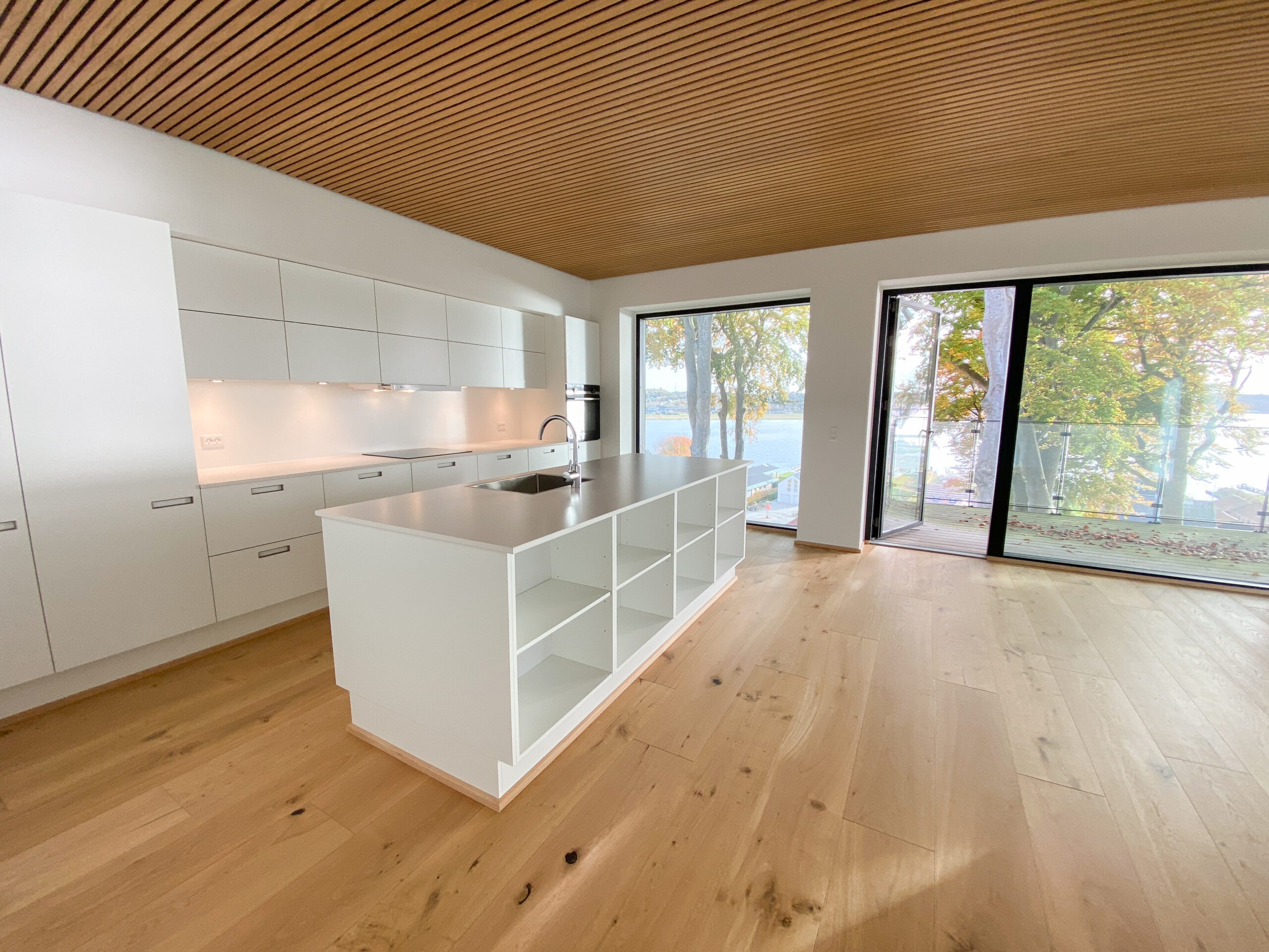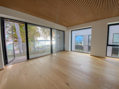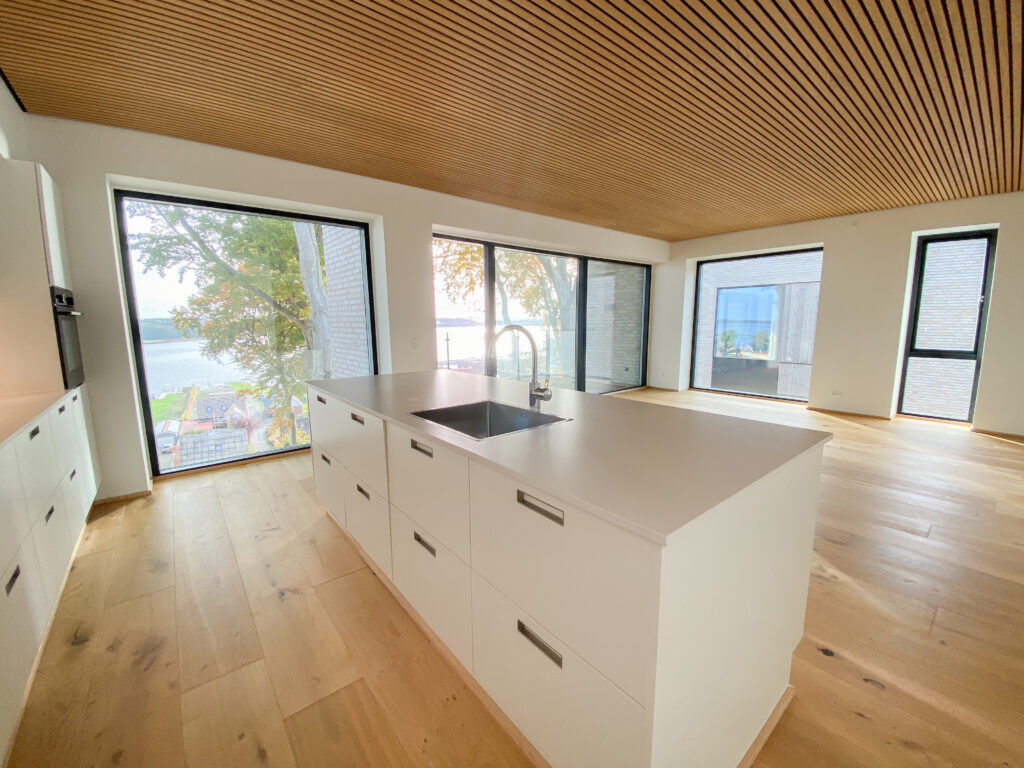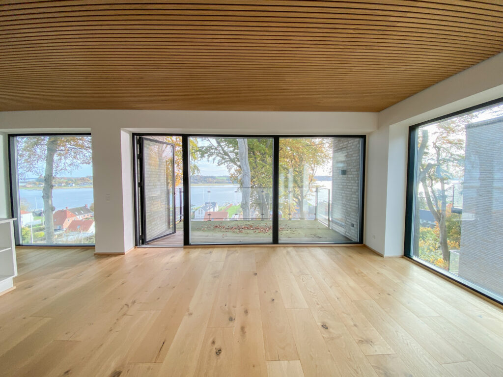 Indenfor møder du detaljer som herregårds-plankede gulve og lofter i egetræ, der elegant forbinder hjemmets indre med skovens natur. Køkkenet fra Svane i hvide elementer inviterer til madlavning og samvær, mens middagsbordet rammer samtaler mod udsigten som et levende maleri.