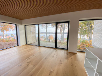 Indenfor møder du detaljer som herregårds-plankede gulve og lofter i egetræ, der elegant forbinder hjemmets indre med skovens natur. Køkkenet fra Svane i hvide elementer inviterer til madlavning og samvær, mens middagsbordet rammer samtaler mod udsigten som et levende maleri.