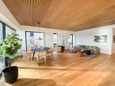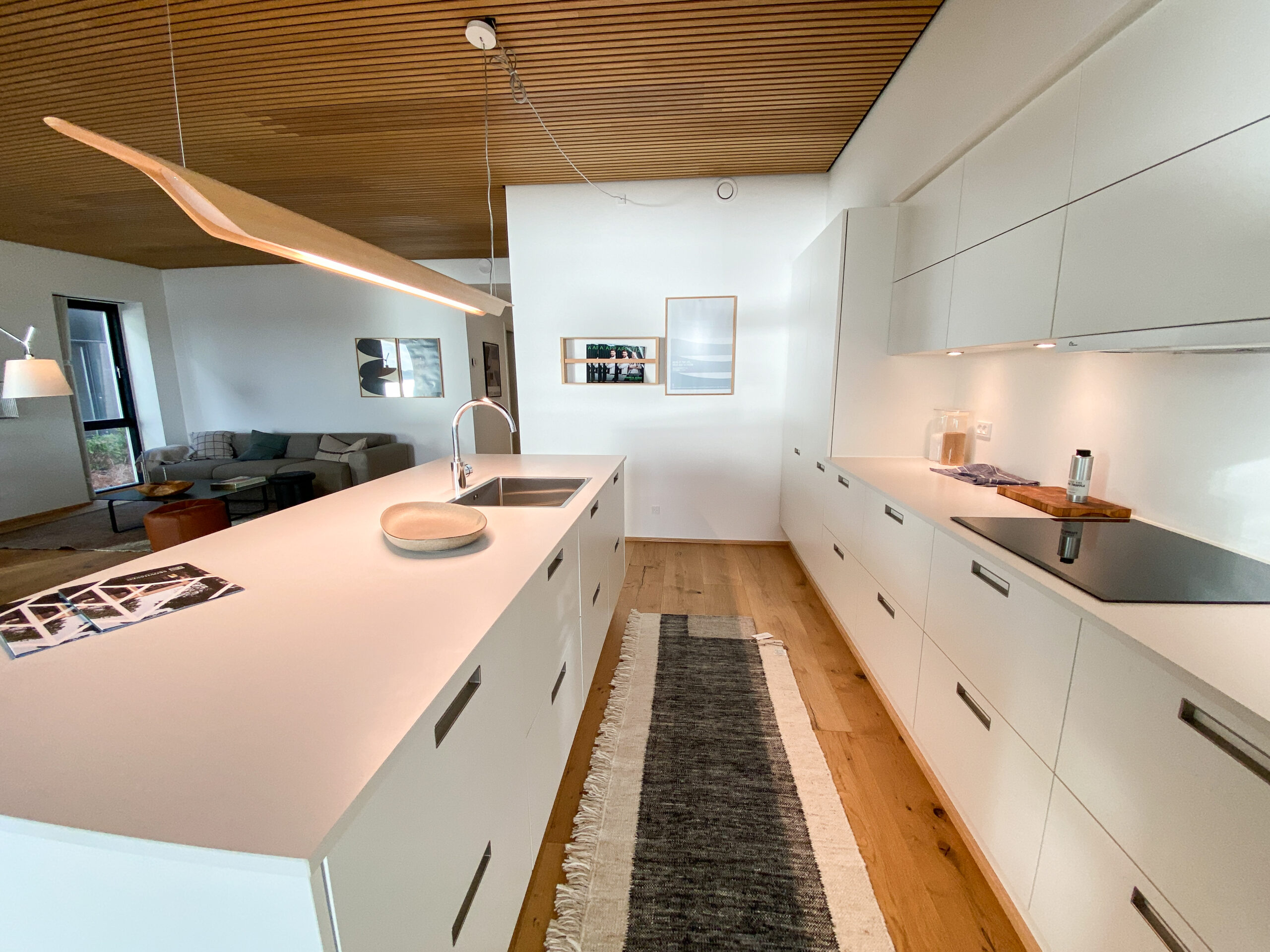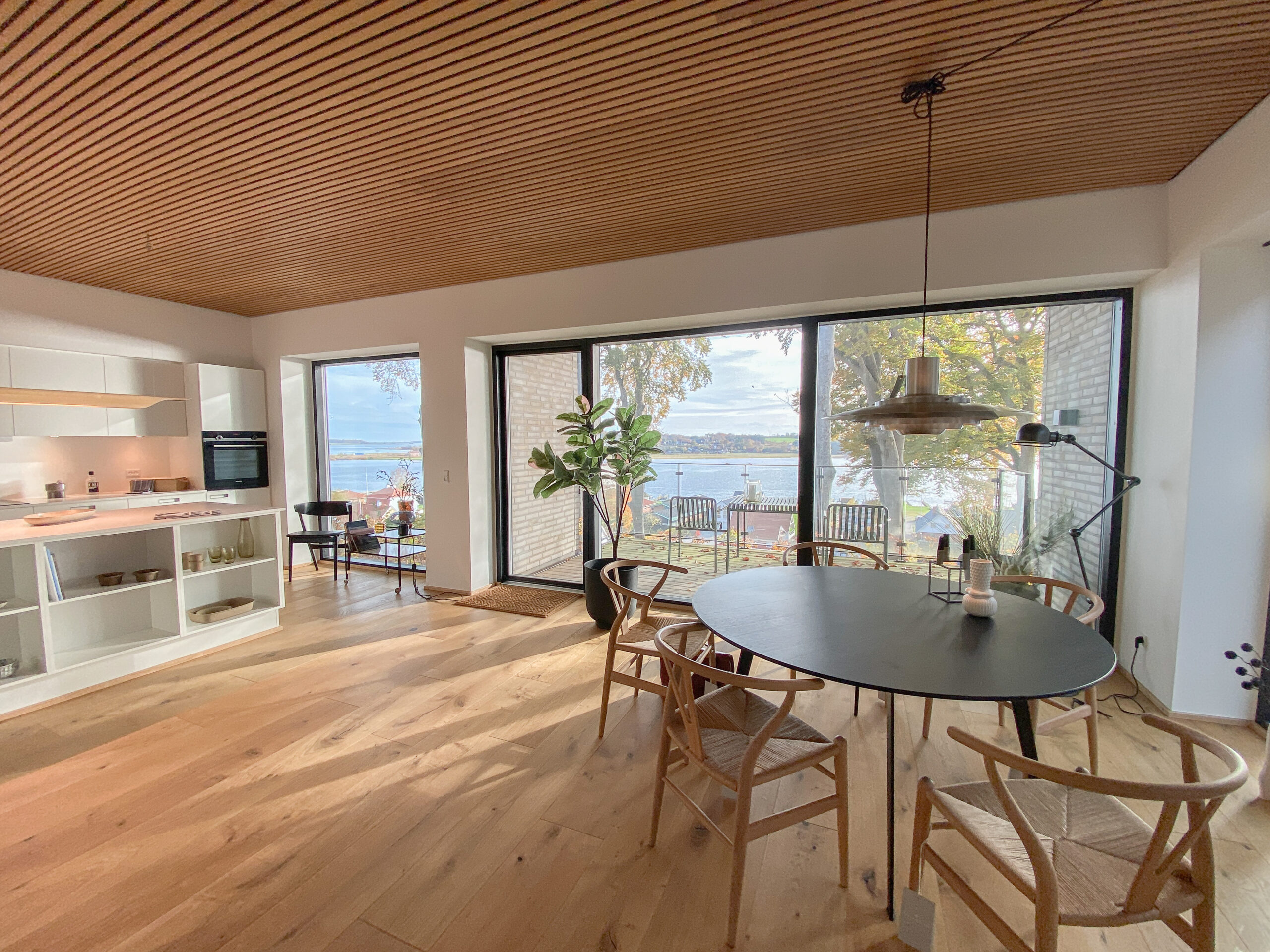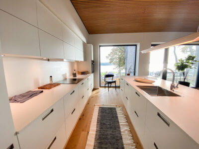 Indenfor møder du detaljer som herregårds-plankede gulve og lofter i egetræ, der elegant forbinder hjemmets indre med skovens natur. Køkkenet fra Svane i hvide elementer inviterer til madlavning og samvær, mens middagsbordet rammer samtaler mod udsigten som et levende maleri.