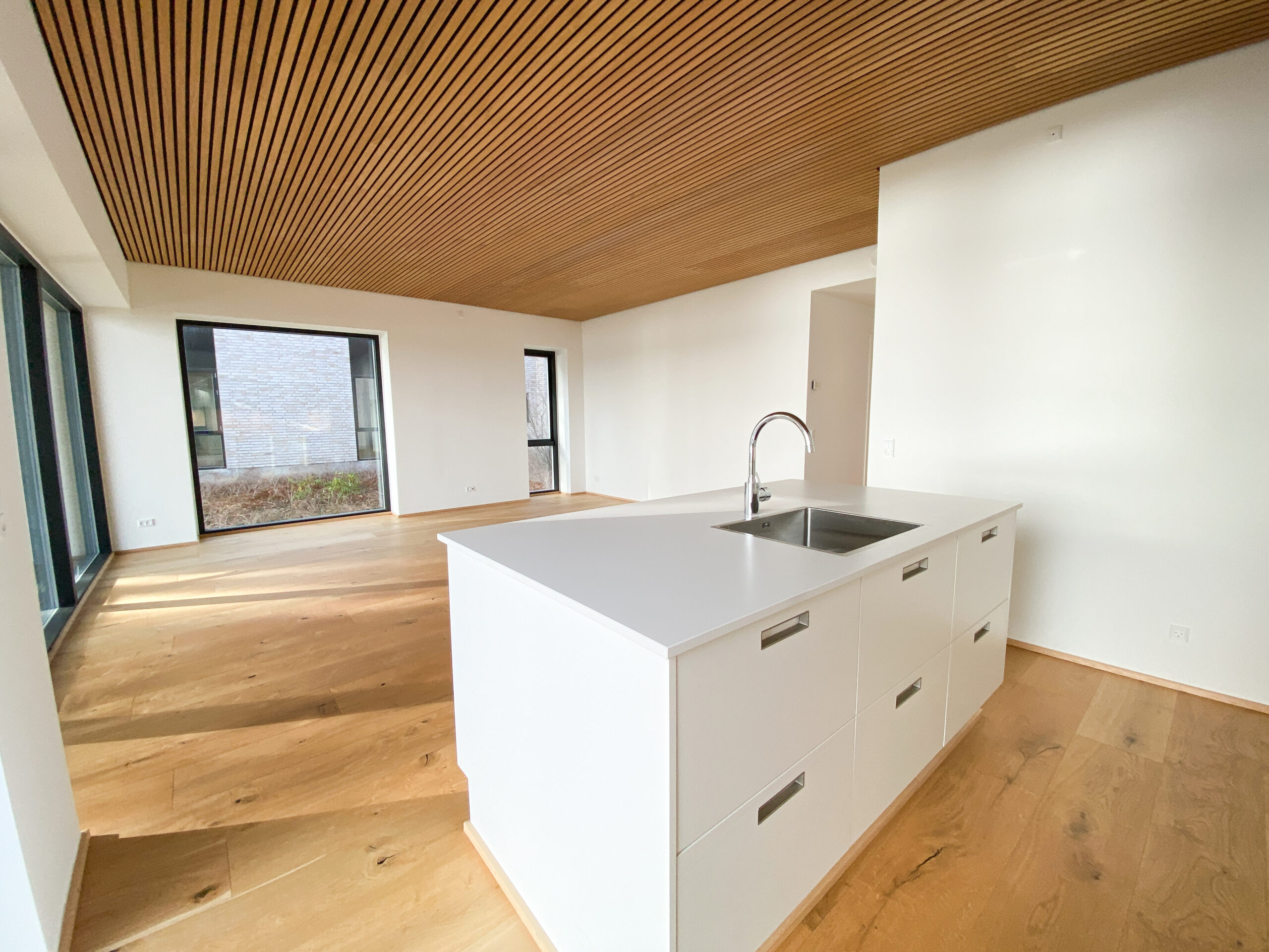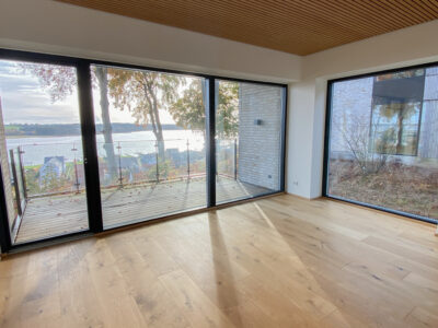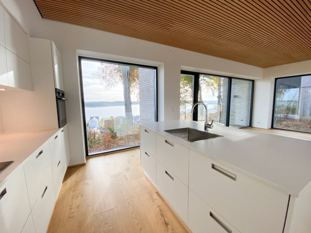 Indenfor møder du detaljer som herregårds-plankede gulve og lofter i egetræ, der elegant forbinder hjemmets indre med skovens natur. Køkkenet fra Svane i hvide elementer inviterer til madlavning og samvær, mens middagsbordet rammer samtaler mod udsigten som et levende maleri.