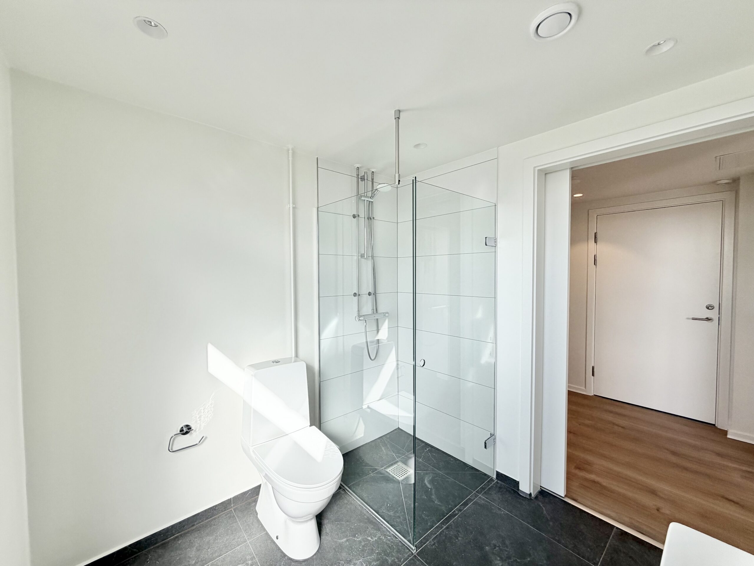Lejligheden byder på et lyst opholdsrum, der er optimalt indrettet med faste skabe og adgang til en skøn altan, som giver udsigt over Limfjorden. Det stilrene køkken fra Designa er udstyret med kogezone, emhætte og køleskab, hvilket sikrer funktionalitet i hverdagen. Badeværelset er moderne med bruseniche og kvalitetsmaterialer fra Grohe og Duravit, hvilket tilføjer en ekstra dimension af komfort.