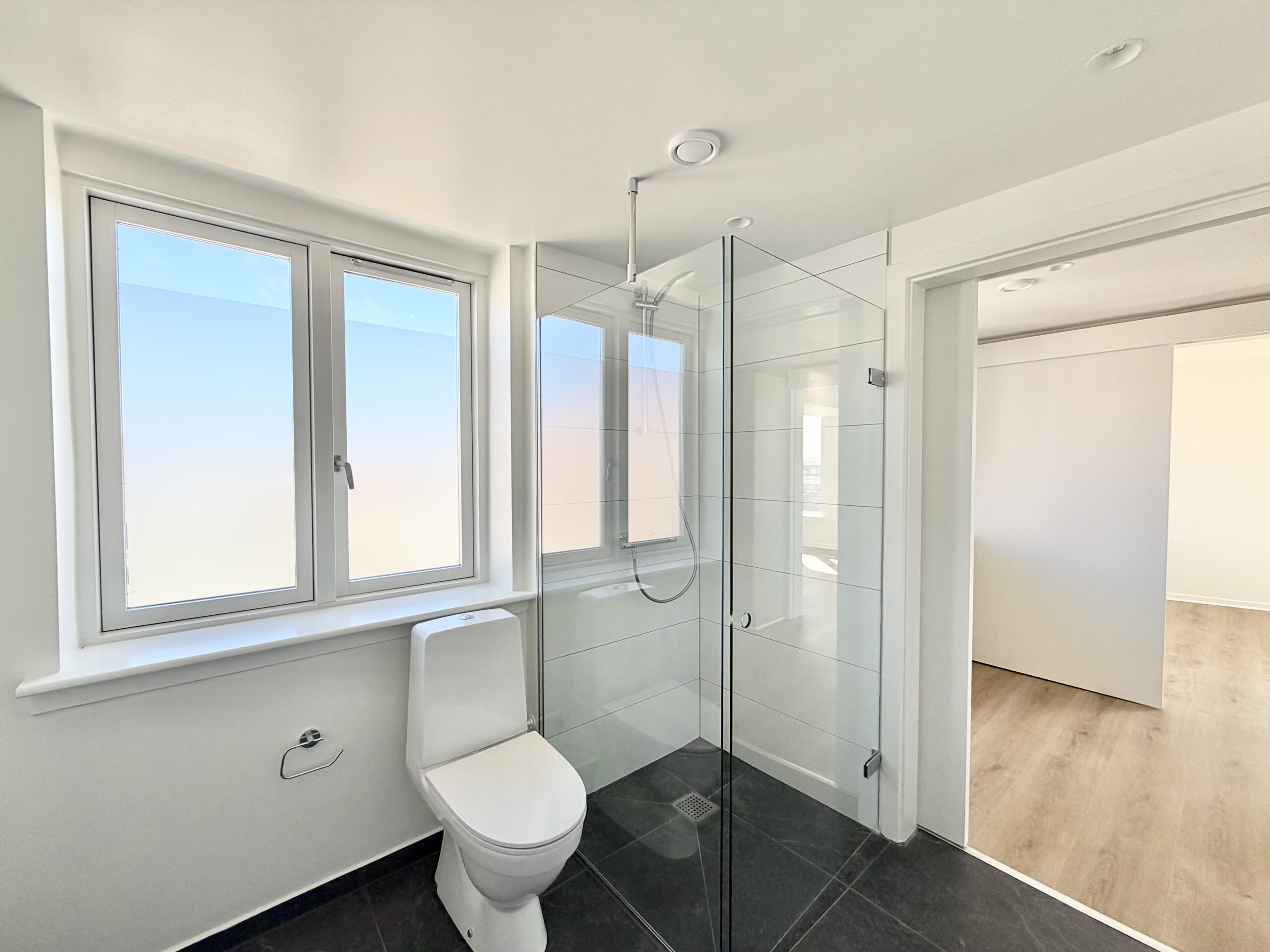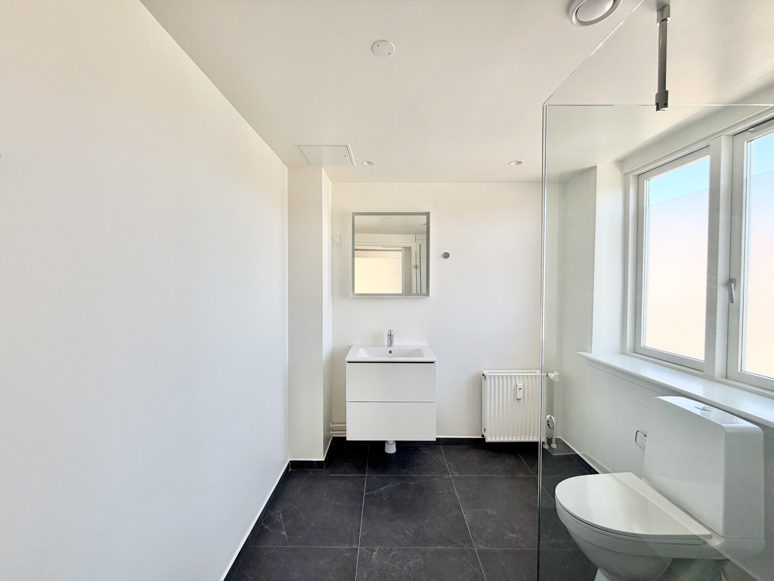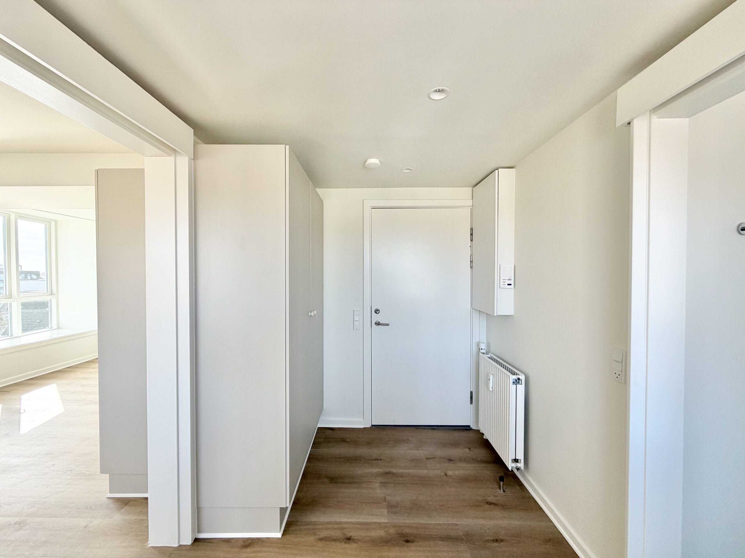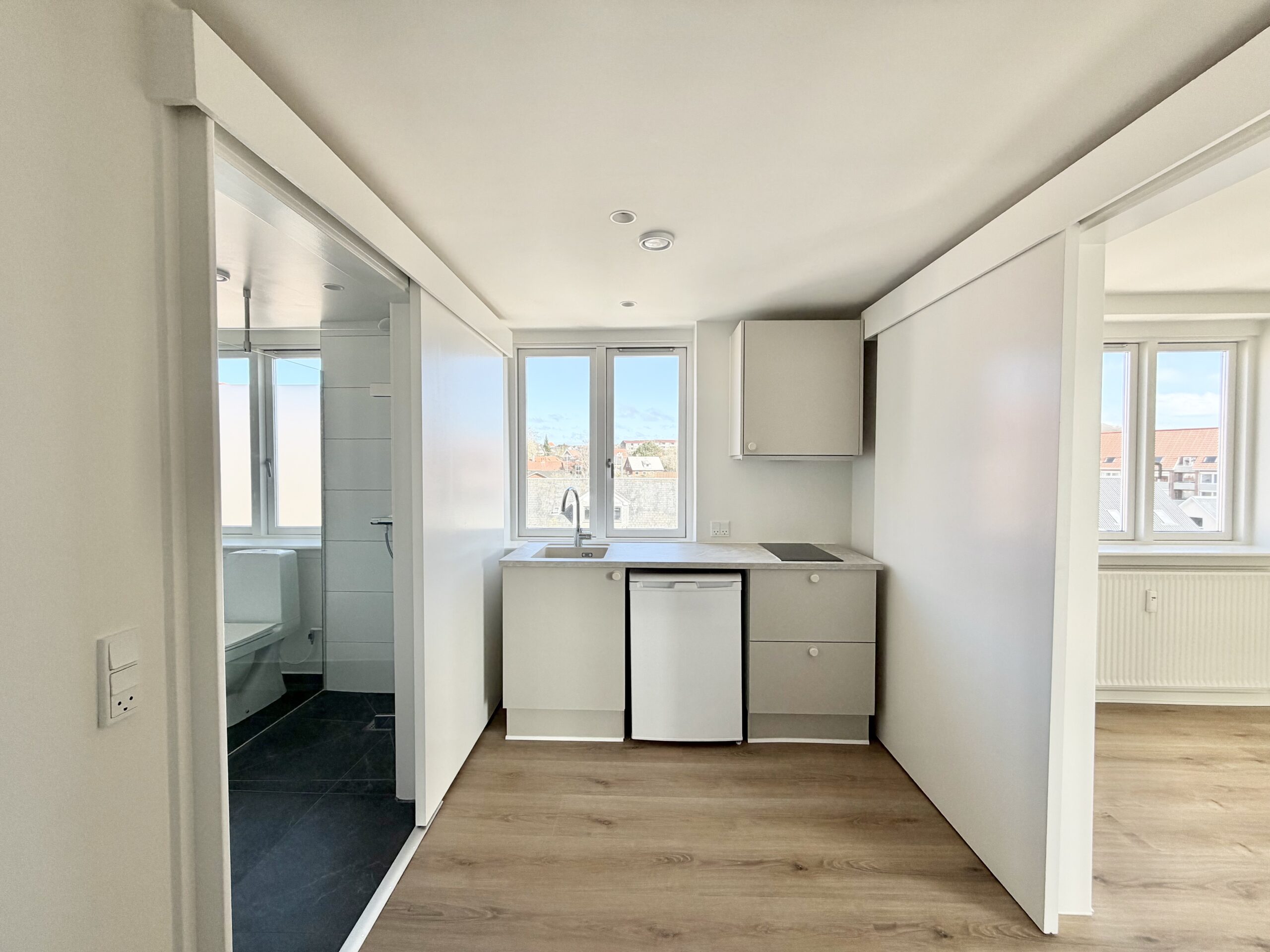 Lejligheden på 42 m2 byder på et lyst opholdsrum med gode, faste skabe, hvilket skaber en funktionel og indbydende stemning. Det stilrene køkken fra Designa er udstyret med kogezone, emhætte og køleskab, perfekt til den, der elsker at lave mad. Badeværelset er moderne indrettet med bruseniche samt kvalitetsmaterialer fra Grohe og Duravit, hvilket giver en følelse af luksus i hverdagen.