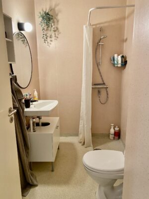Til slut har vi badeværelset, som er lidt et typisk Aalborg badeværelse, men som heldigvis har separat brus. Så det er et godt badeværelse, der også er nemt at holde rent.