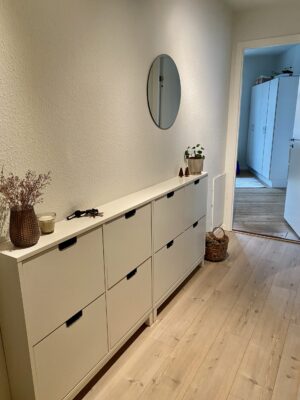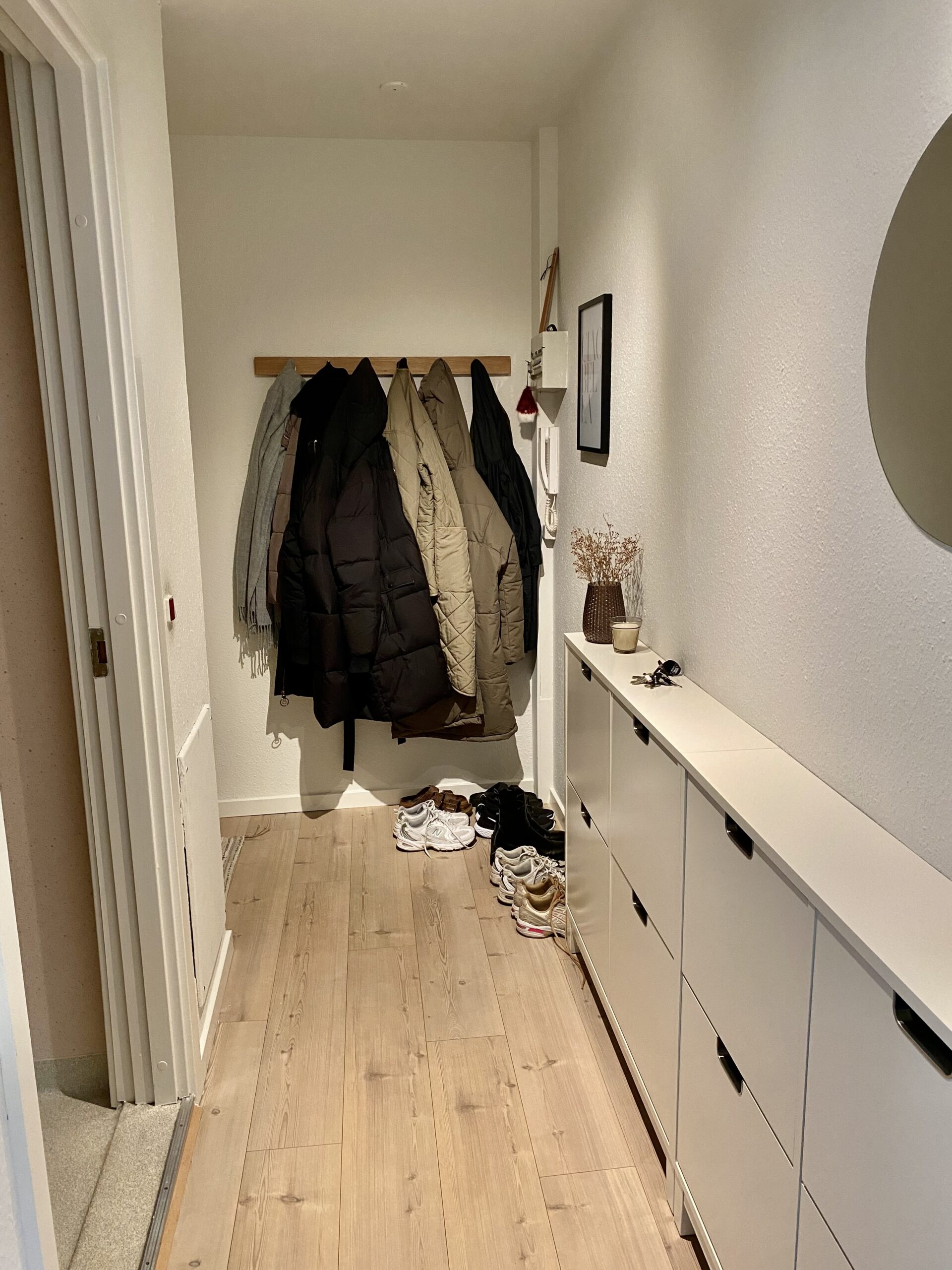 Lejligheden er bestående en fordelingsgang, der også er entreen. Her er der mulighed for at kan hænge en masse skoskabe op, eller have et konsolbord og nogle knager. Det er altid et plus, at have noget plads at ankomme på, så man ikke går direkte ind i stue eller køkken.