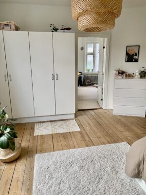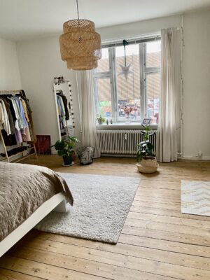 Soveværelset er også meget rummeligt, så der kan du sagtens købe en stor seng og samtidig have plads til et stort klædeskab, skrivebord og en del ekstra. Det kan ses på billederne, hvor stort værelset er.