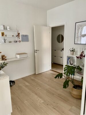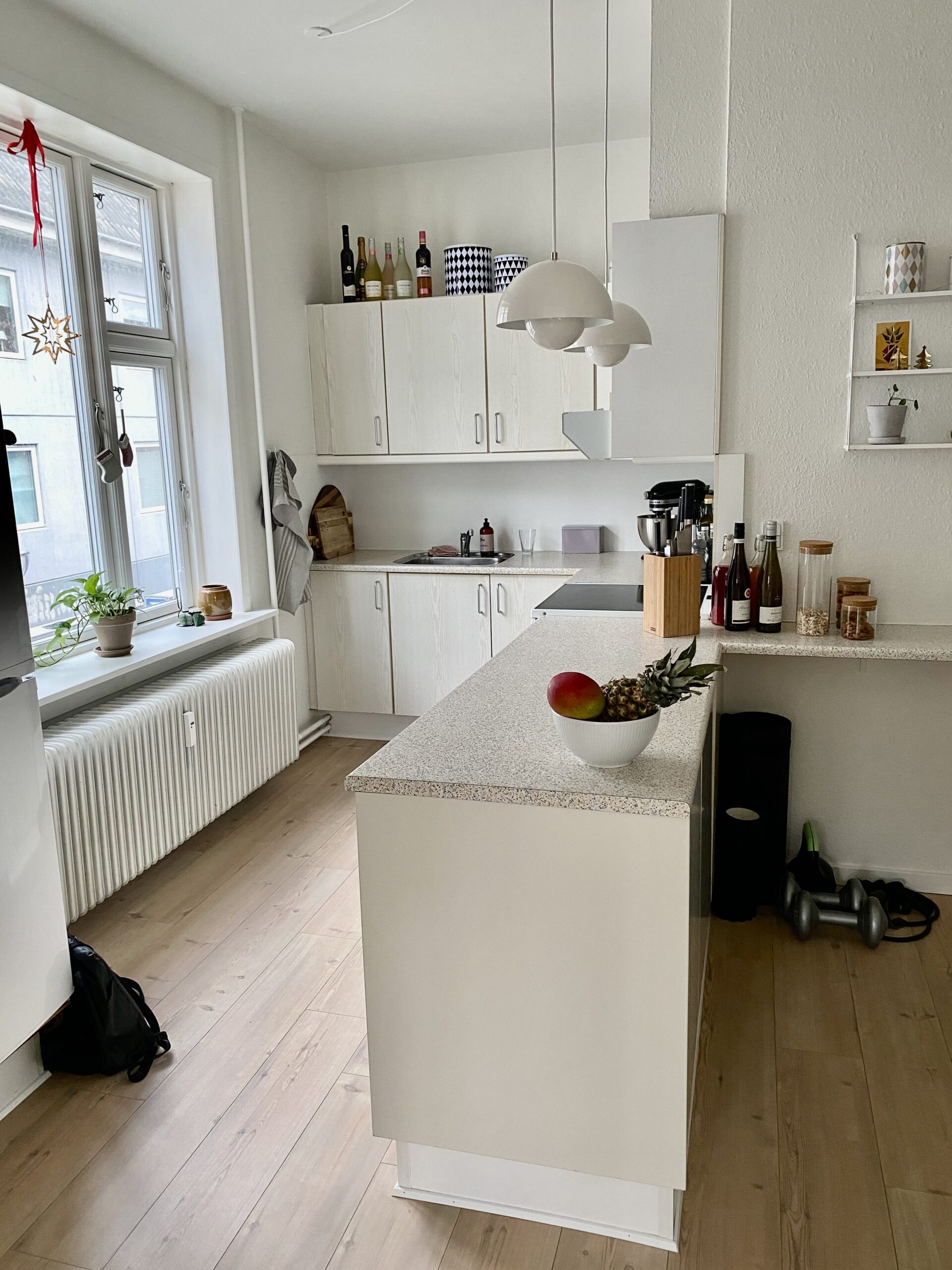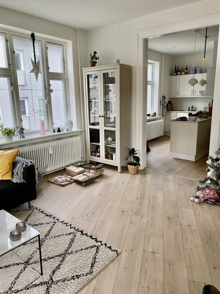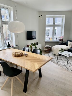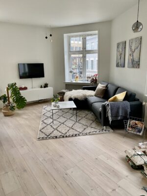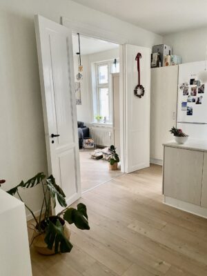Når vi træder ind i lejligheden har vi køkkenet, som er super hyggeligt, og har en dobbeltdør man kan have åbent ind til stuen, så det bliver lidt køkken-alrum agtig. Det er dejligt at kunne gøre, når man har gæster. Der er godt med bordplads og der er endda gjort sådan, at man kan have nogle barstole derude. Køkkenet er lidt specielt end så mange andre køkkener i Aalborg.