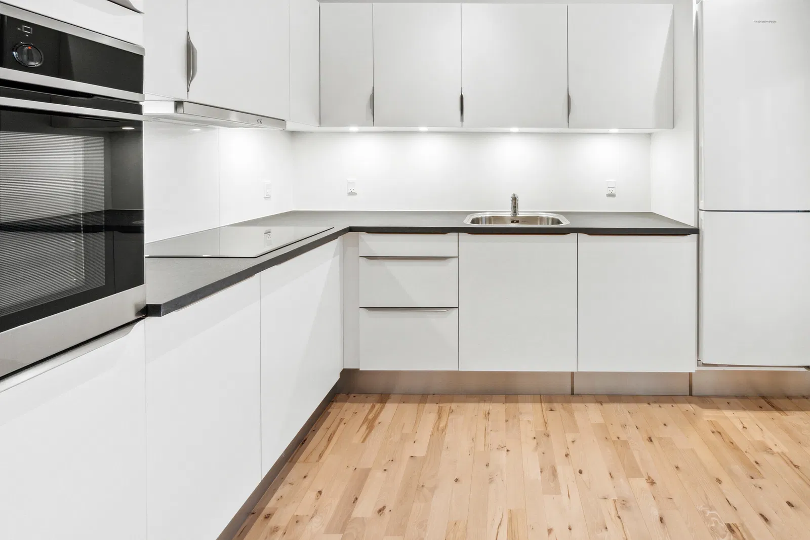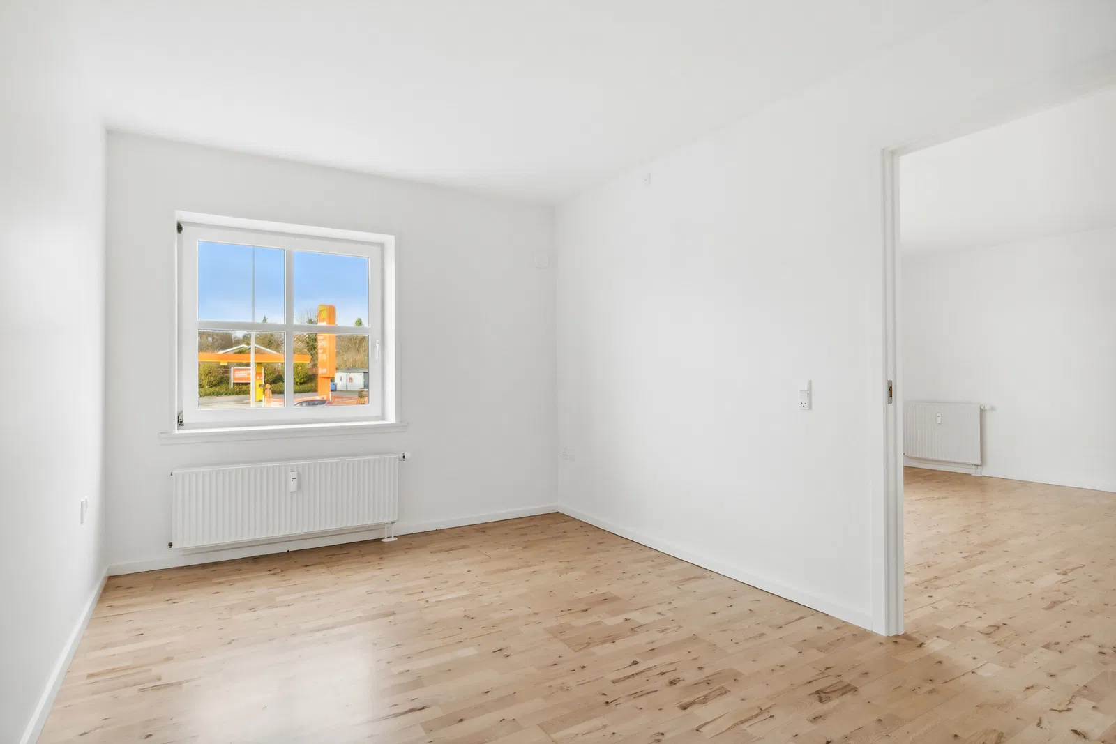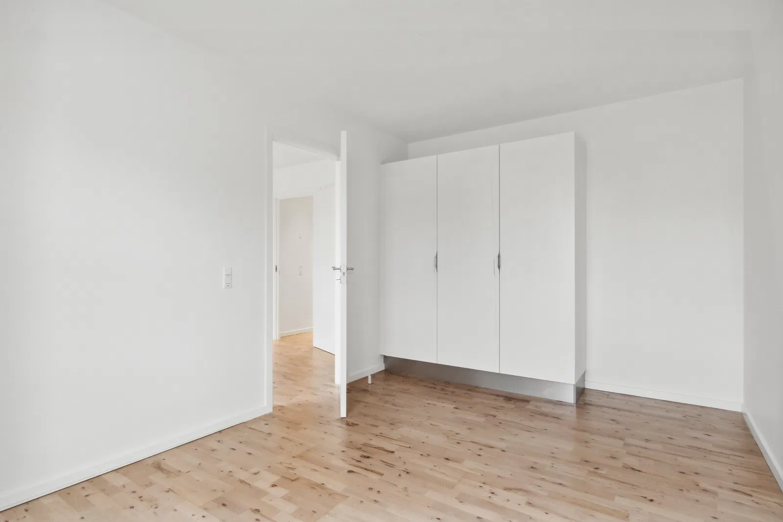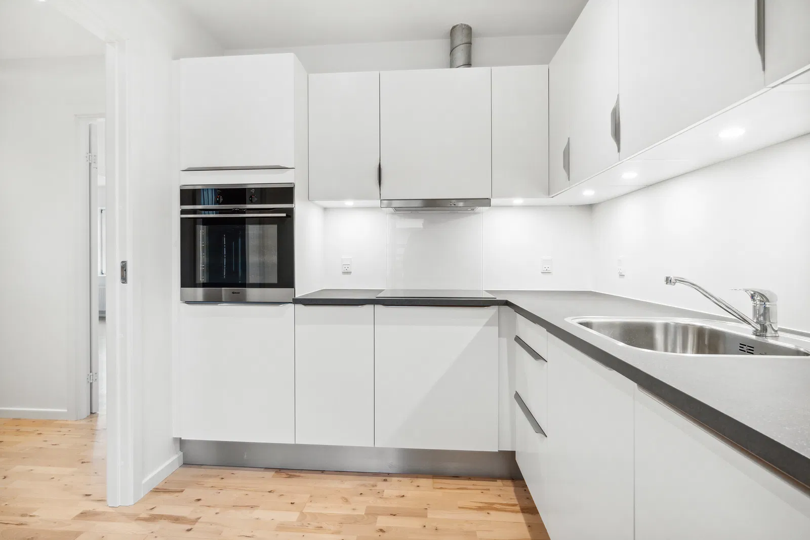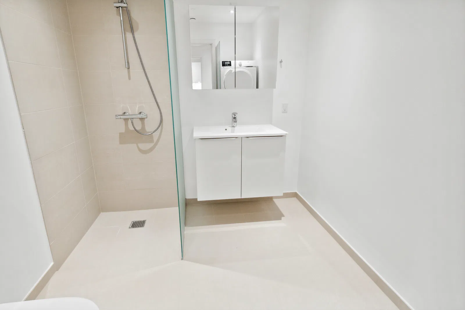 Lejligheden byder på en enkel og hverdagsvenlig planløsning. Entréen er indbydende med plads til overtøj og spotbelysning, der skaber en varm velkomst. Den store, lyse stue åbner sig med brede vinduespartier, som bader rummet i naturligt lys. De gennemgående, lyse trægulve giver en harmonisk og moderne følelse. Køkkenet er stilrent indrettet med hvidt design, solide bordplader og god skabsplads. Her finder du induktionskogeplade, indbygningsovn, opvaskemaskine og køle-/fryseskab, hvilket gør madlavningen til en leg. Badeværelset er moderne med lyse fliser, væghængt toilet og bruseniche med glasvæg, samt en praktisk vaskesøjle med både vaskemaskine og tørretumbler.