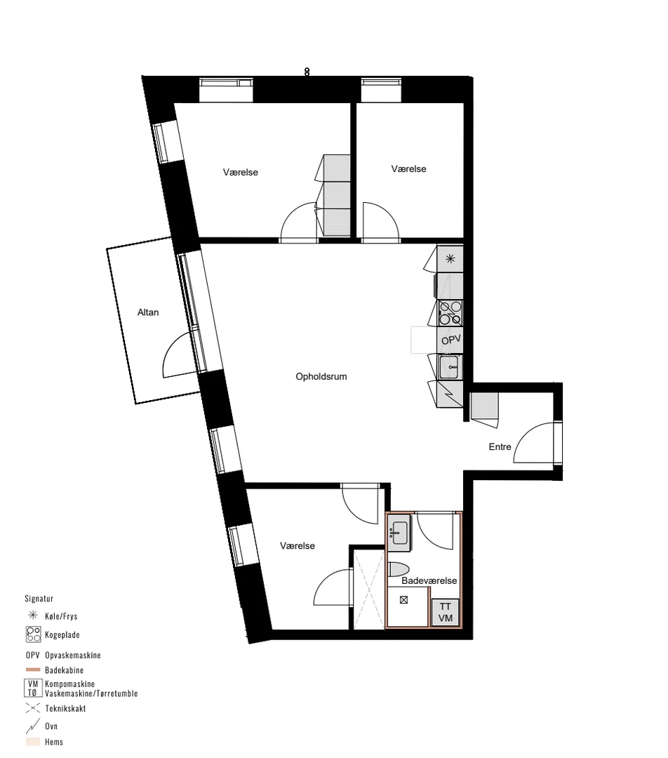 Du træder ind i den rummelige entré, der fører dig videre til det store, lyse køkken-alrum. Her strømmer lyset ind gennem de store vinduespartier, og du kan glæde dig til at tilberede lækre måltider i det stilfulde grebsfrie HTH-køkken med Corian-bordplade og en fuld AEG hvidevarepakke. Fra køkken-alrummet har du direkte adgang til den vestvendte altan, hvor du kan nyde varme sommeraftener med udsigt over den grønne have. Lejligheden byder også på tre gode værelser, hvoraf det ene har indbyggede skabe, samt et lyst badeværelse med vaskesøjle. De flotte egetræsgulve i fuldstavsparket giver lejligheden et nordisk præg, mens gulvvarme og genveks ventilation sikrer optimal komfort.