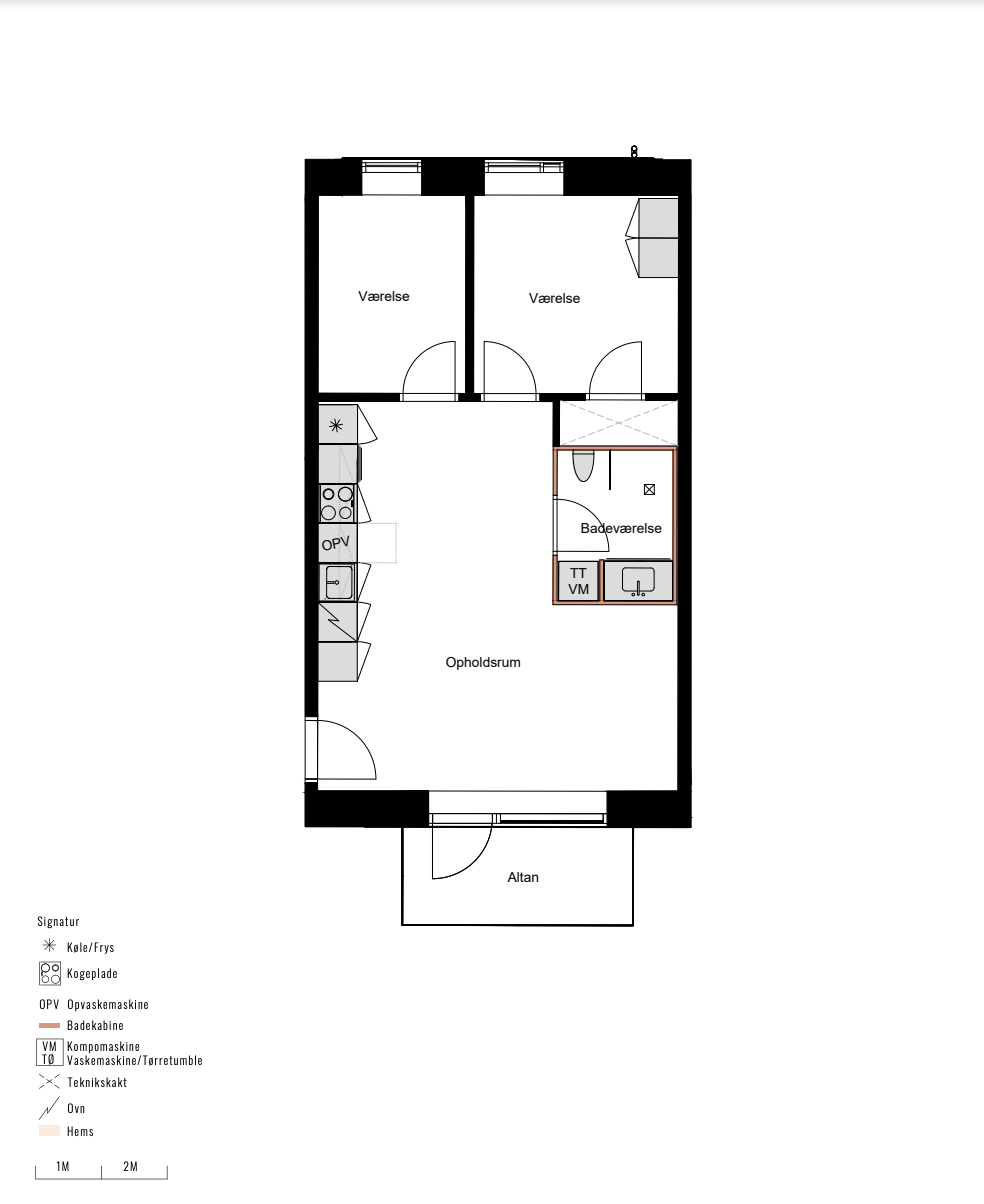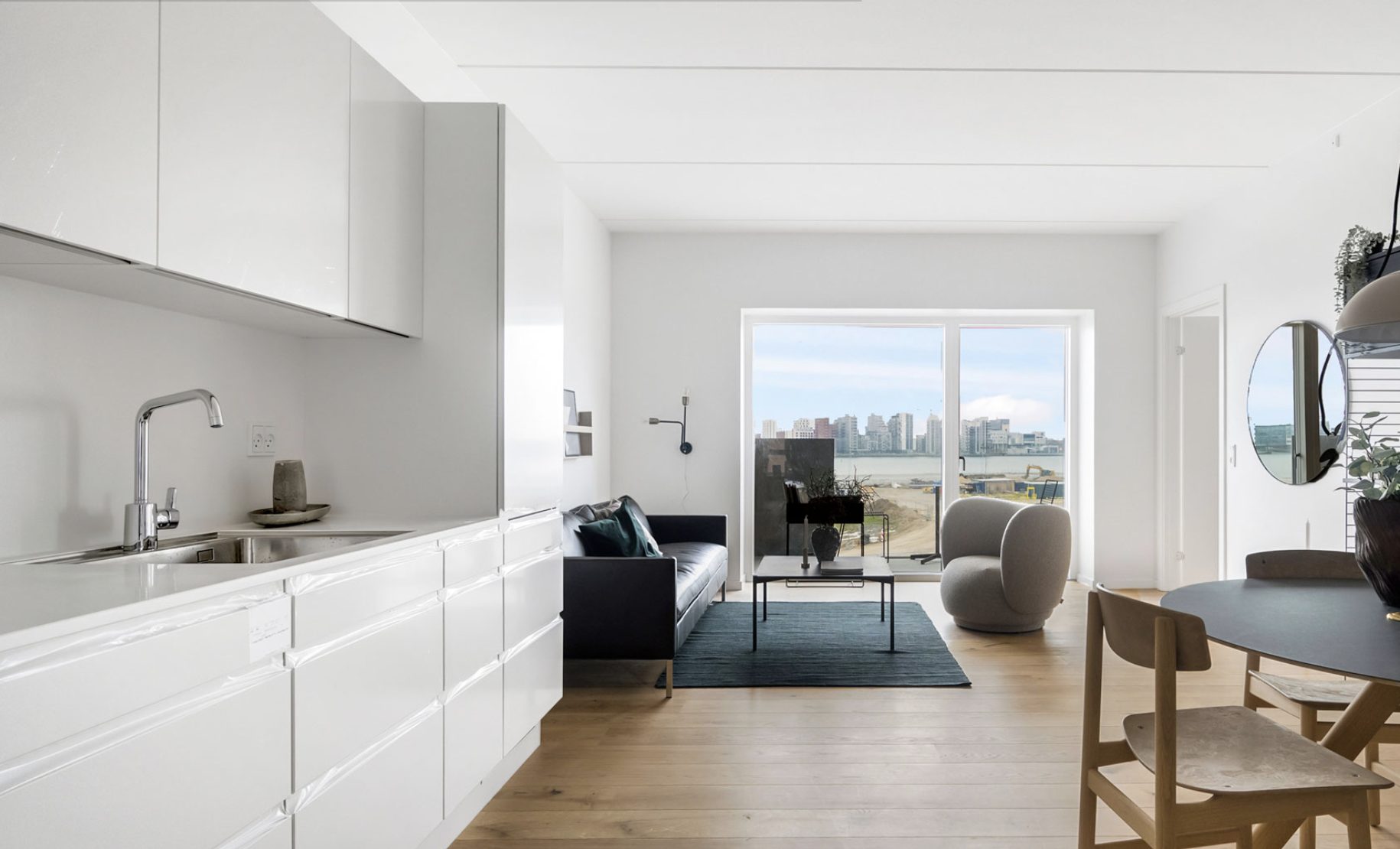 Når du træder ind i lejligheden, mødes du af det store og lyse køkken-alrum, hvor lyset strømmer ind gennem de store vinduespartier. Her kan du glæde dig til at lave mad i det lækre grebsfrie HTH-køkken med Corian-bordplade og fuld AEG hvidevarepakke.