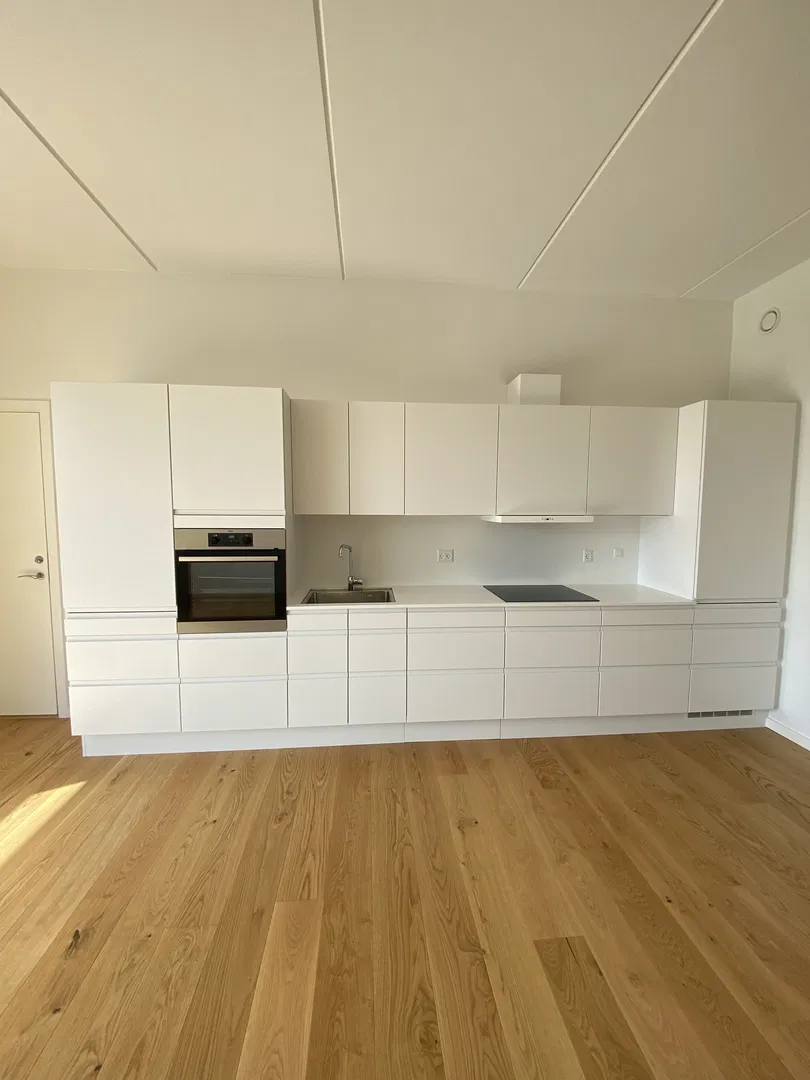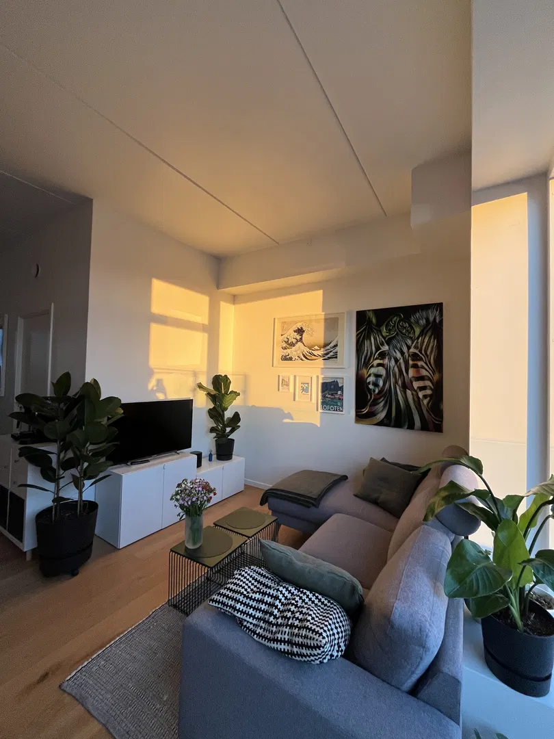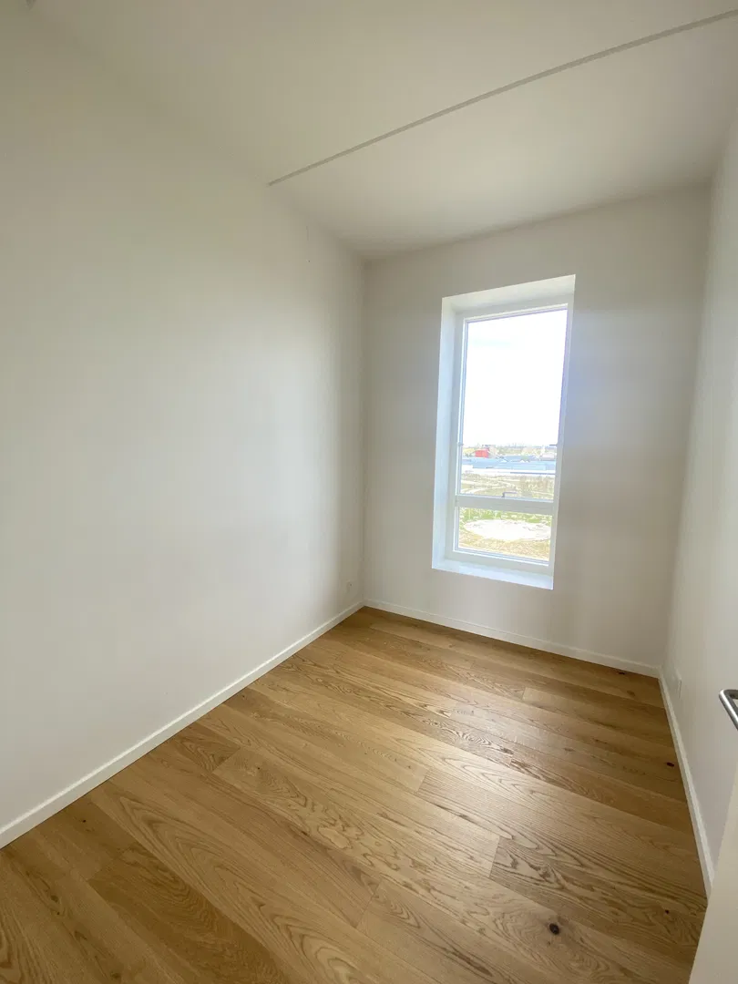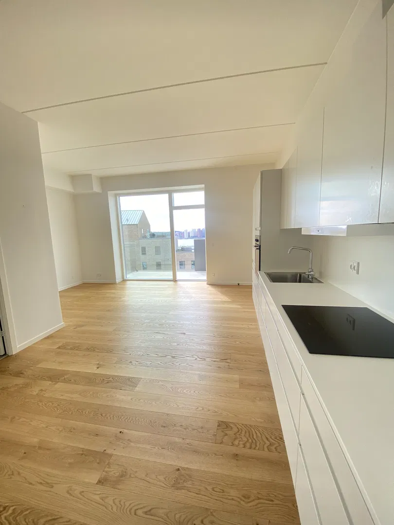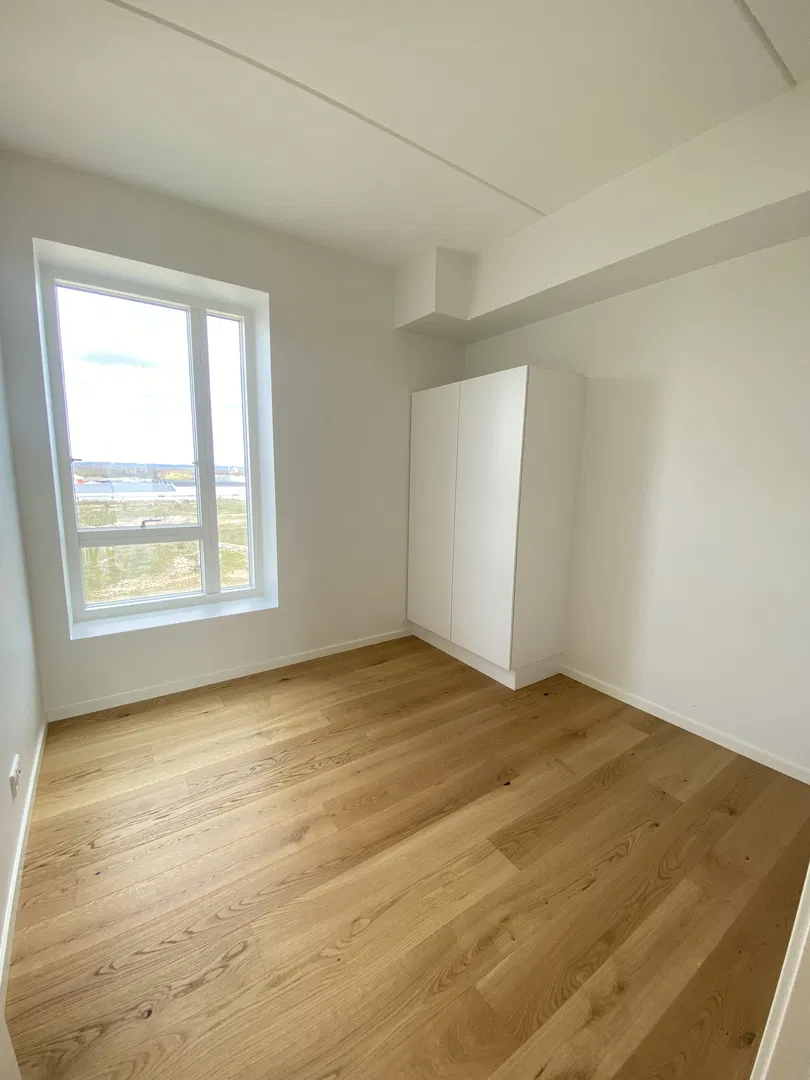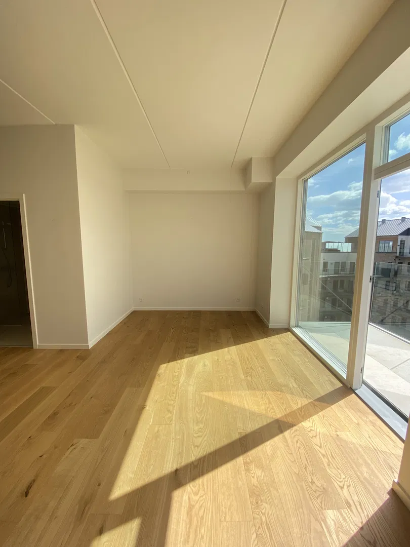 Lejligheden byder på et stort og lyst køkken-alrum, hvor de store vinduespartier lader lyset strømme ind. Det grebsfrie HTH-køkken med Corian-bordplade og fuld AEG hvidevarepakke gør madlavningen til en fornøjelse. Fra køkken-alrummet er der direkte adgang til den sydvendte altan, perfekt til at nyde sommeraftenerne med udsigt over den grønne have. De to værelser, hvoraf det ene har indbyggede skabe, tilbyder også en flot udsigt over parken. Badeværelset er lyst og indbydende med en praktisk vaskesøjle, og lejligheden er udstyret med egetræsgulve i fuldstavsparket, gulvvarme og genvex ventilation for optimal komfort.