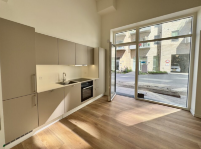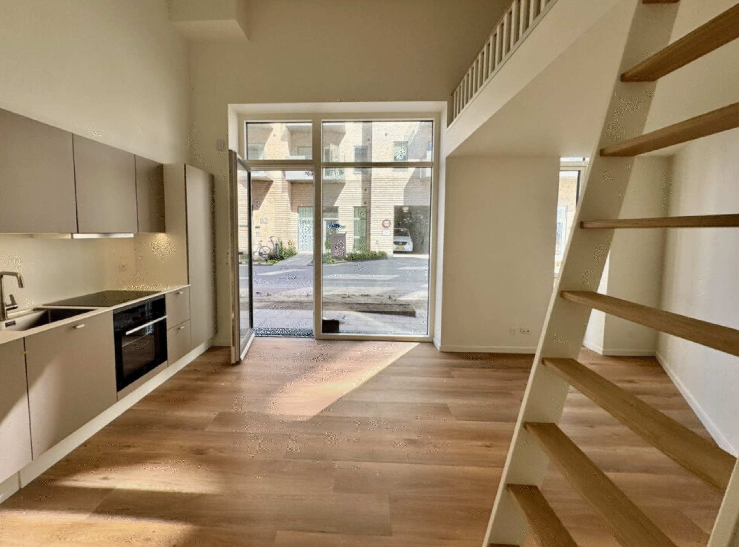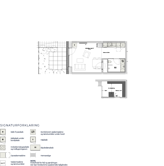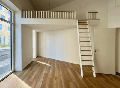 Denne skønne studio er en 1-værelses lejlighed med adgang fra en privat terrasse. Vi træder indenfor i lejligheden fra terrassen, og starter med at hænge overtøjet i garderobeskabet lige indenfor døren. Vi står nu i lejlighedens leverum; det skønt stort rum med superhøjt til loftet og kæmpe vinduespartier der sikre et flot lysindfald. Her har vi et eksklusiv køkken fra HTH køkken og stue i ét. Fra stuen er der adgang til en virkelig stor hems, der fint kan indrettes med soveplads. Herudover har lejligheden er stort lækkert badeværelse med kombineret vaske-/tørremaskine.