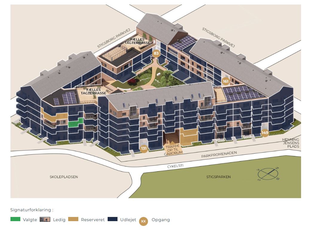 StigsborgHus er en ny ejendom fra august 2025, beliggende i den attraktive bydel Stigsborg, som tilbyder en hyggelig gårdhave, fælles tagterrasse med orangeri og en imponerende udsigt over fjorden og Aalborg. Der er gode faciliteter til cykelparkering og mulighed for at skrive sig på venteliste til leje af parkering i nærliggende parkeringshus.
