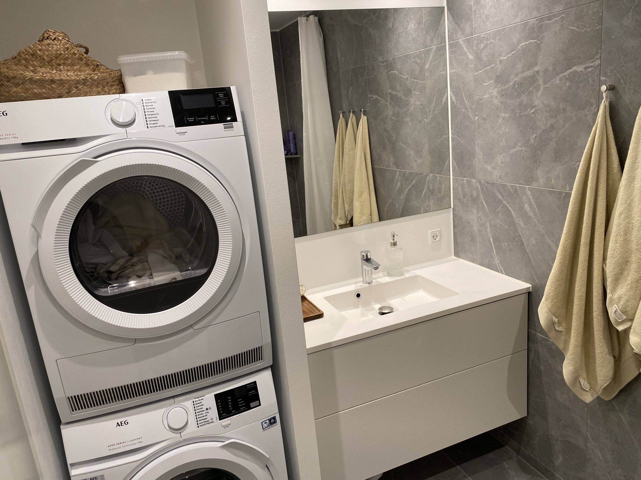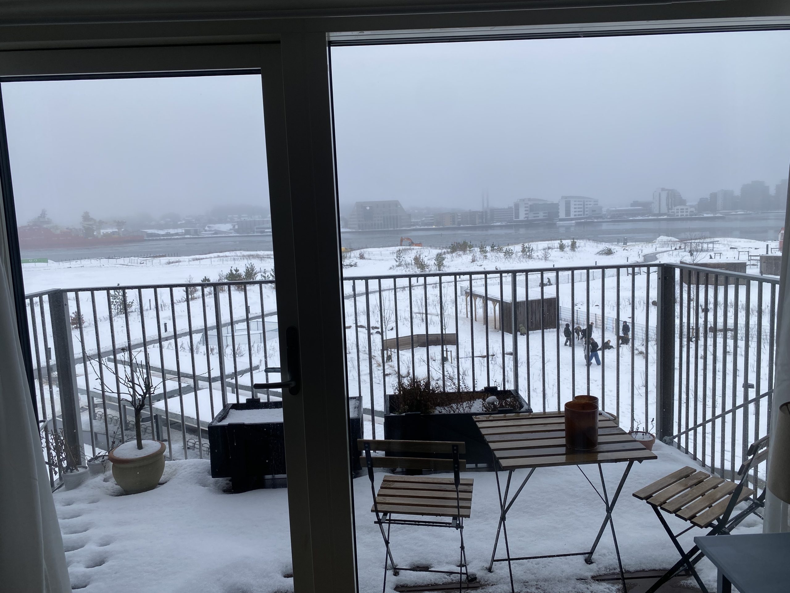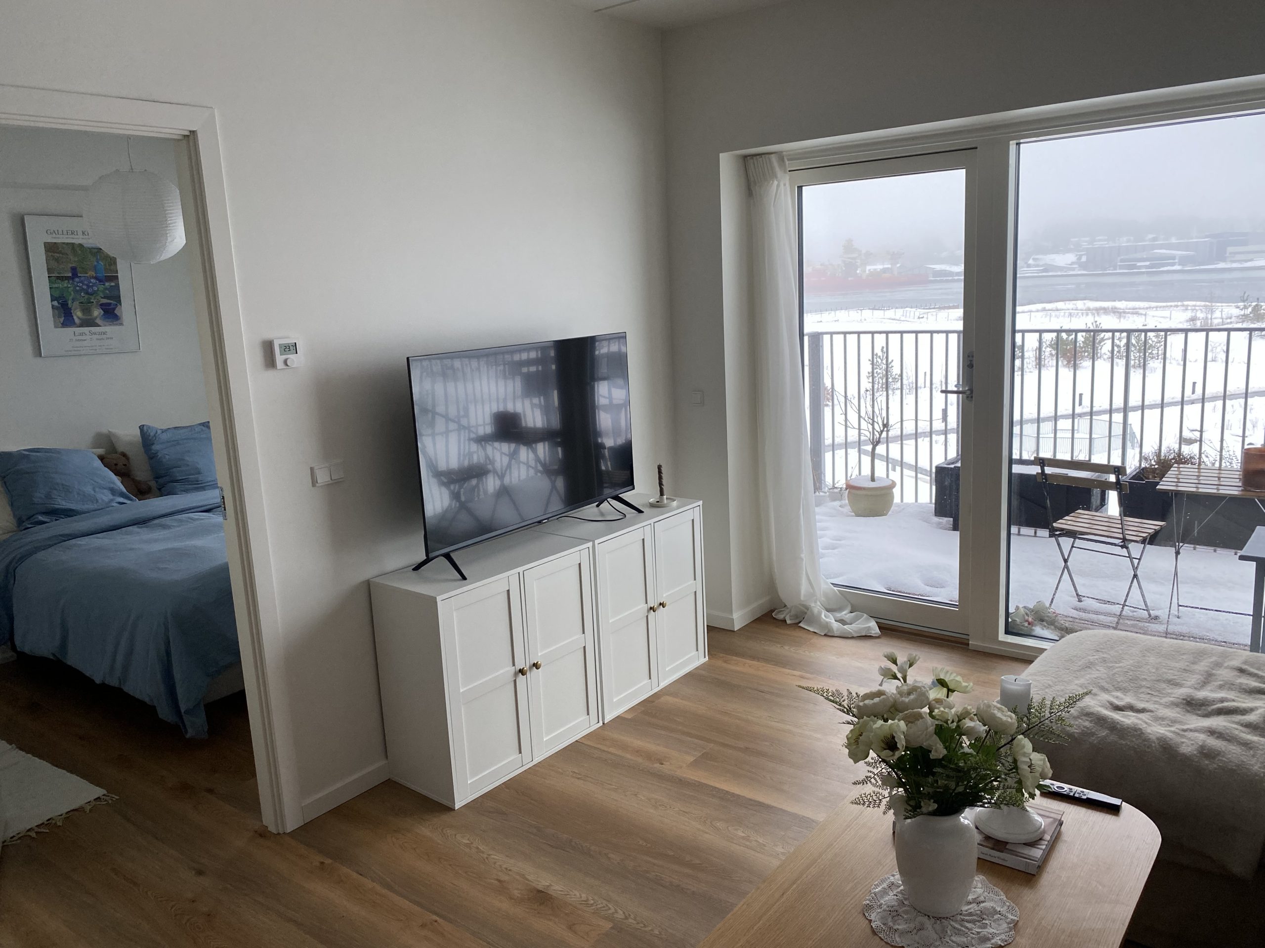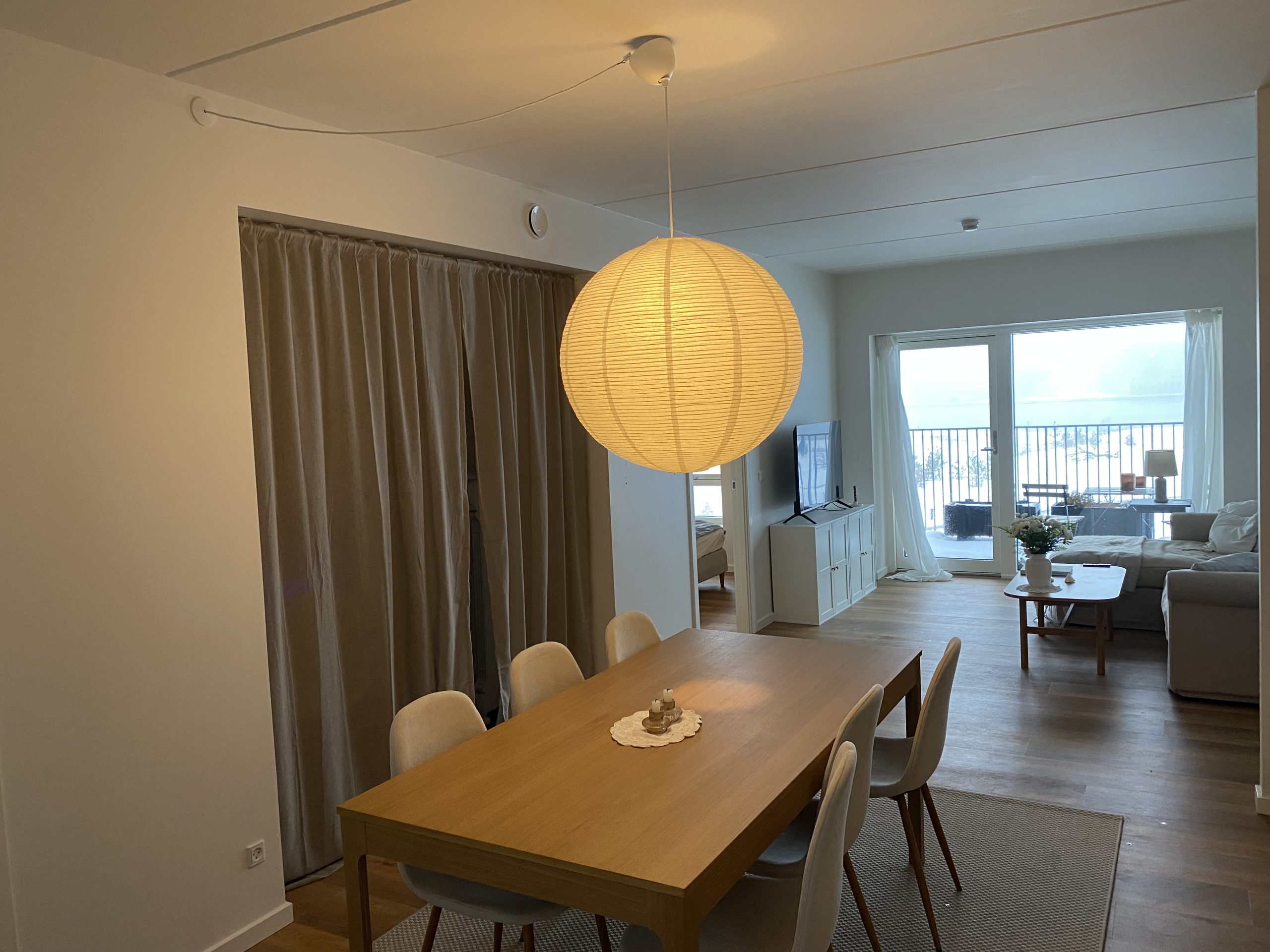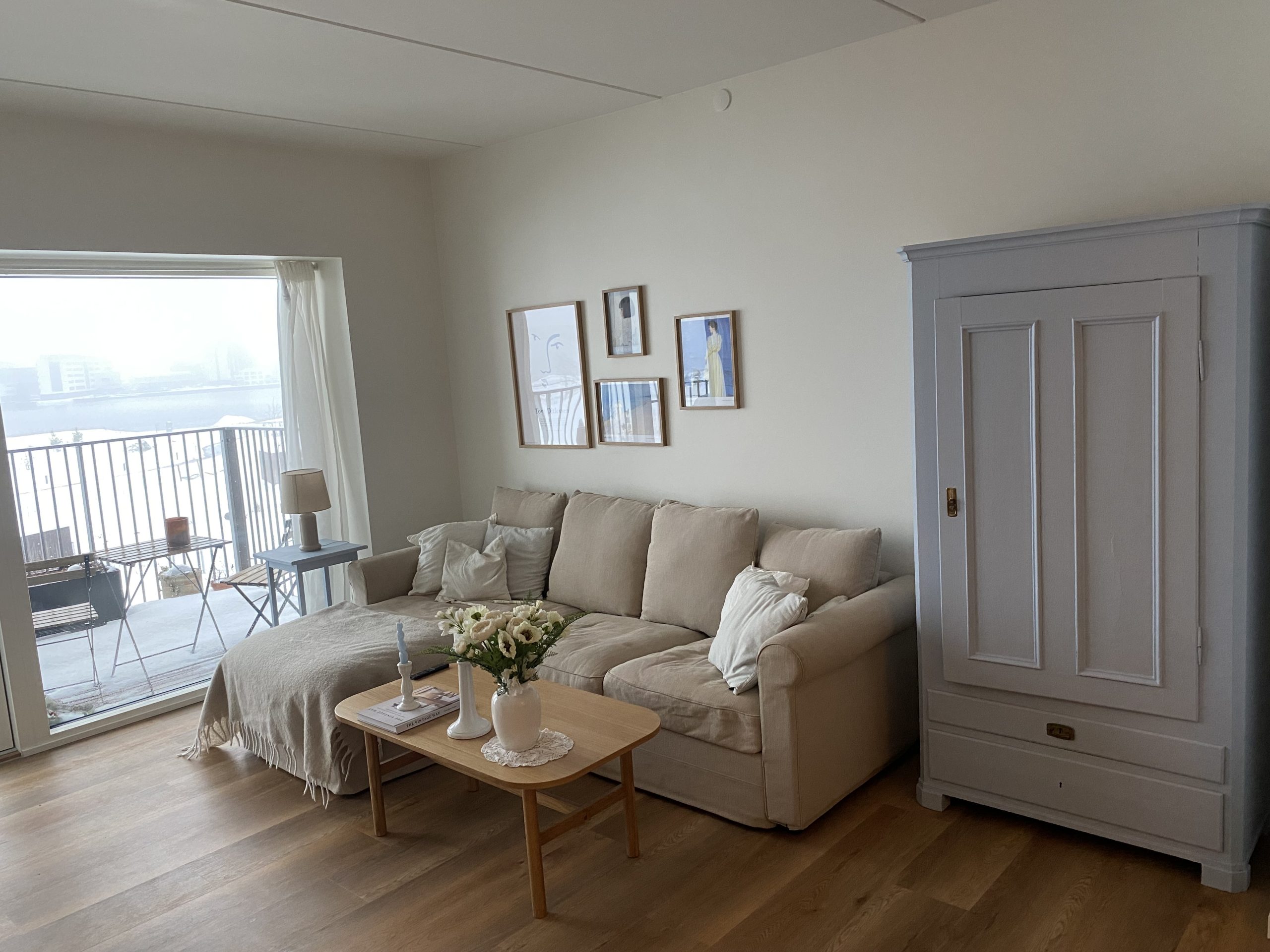Lejligheden byder på et åbent og rummeligt køkken-alrum, hvor et stilrent HTH-køkken med alt i hårde hvidevarer er i fokus. Herfra kan du nyde en fantastisk udsigt over park og fjord, og du har direkte adgang til den store altan, hvor du kan slappe af og tage det hele ind. Stuen fører videre til et soveværelse, der også har udsigt til vandet og har indbyggede garderobeskabe. Der er desuden et praktisk badeværelse med moderne materialer, og hele lejligheden har gulvvarme, hvilket giver en ekstra komfort.