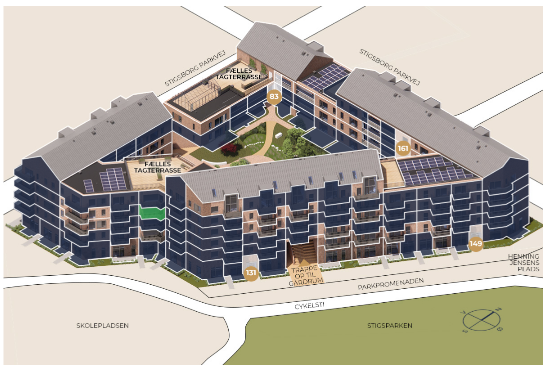 StigsborgHus tilbyder en skøn tagterrasse med panoramaudsigt over park, fjord og Aalborg samt et dejligt gårdmiljø. Der er også depotrum i parkeringsområdet, cykelparkering og mulighed for leje af p-plads.