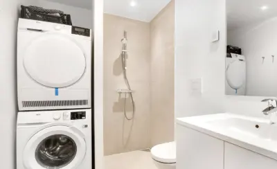 Træd ind i dit nye hjem og bliv mødt af en følelse af luksus og komfort. Lejligheden er opført i kvalitetsmaterialer og er indrettet med øje for detaljen. Her får du blandt andet et stilfuldt HTH-køkken, udstyret med en grebsfri indretning og en elegant Corian-bordplade, samt en komplet hvidevarepakke fra AEG, der inkluderer opvaskemaskine, vaskemaskine og tørretumbler, så din hverdag bliver så bekvem som muligt. De smukke egetræsgulve i fuldstavsparket tilføjer en varm og indbydende atmosfære til hjemmet og fuldender det lyse, nordiske look.