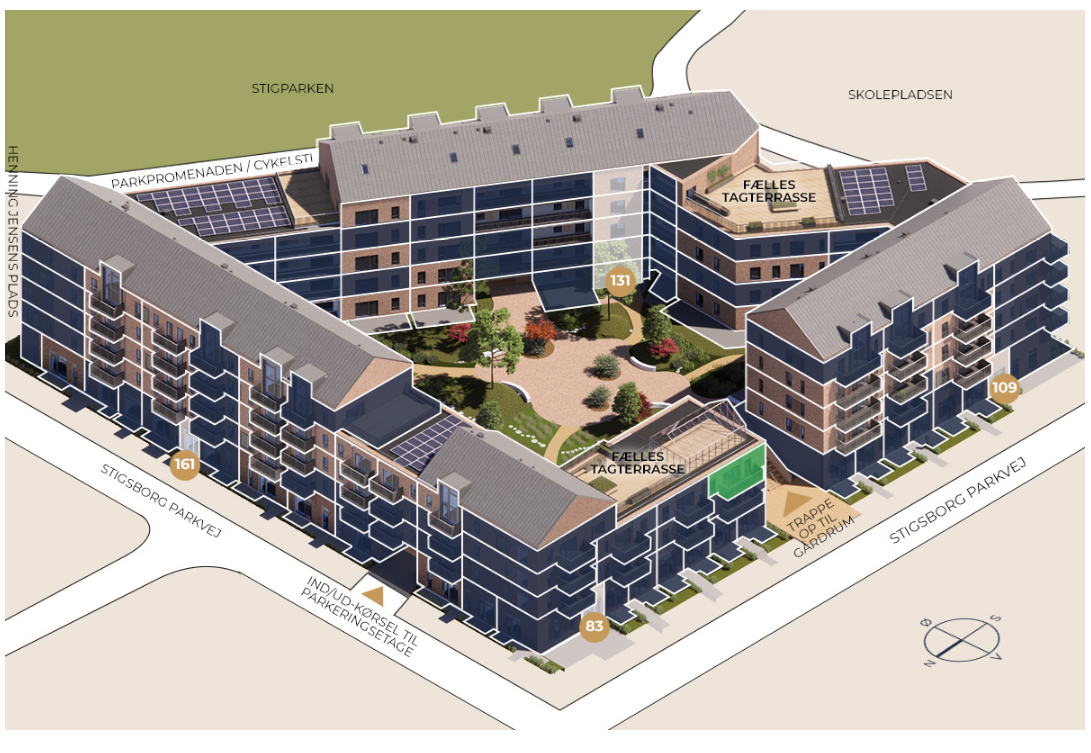 StigsborgHus byder på en lækker tagterrasse med panoramaudsigt over park, fjord og Aalborg, samt et dejligt møbleret gårdmiljø.