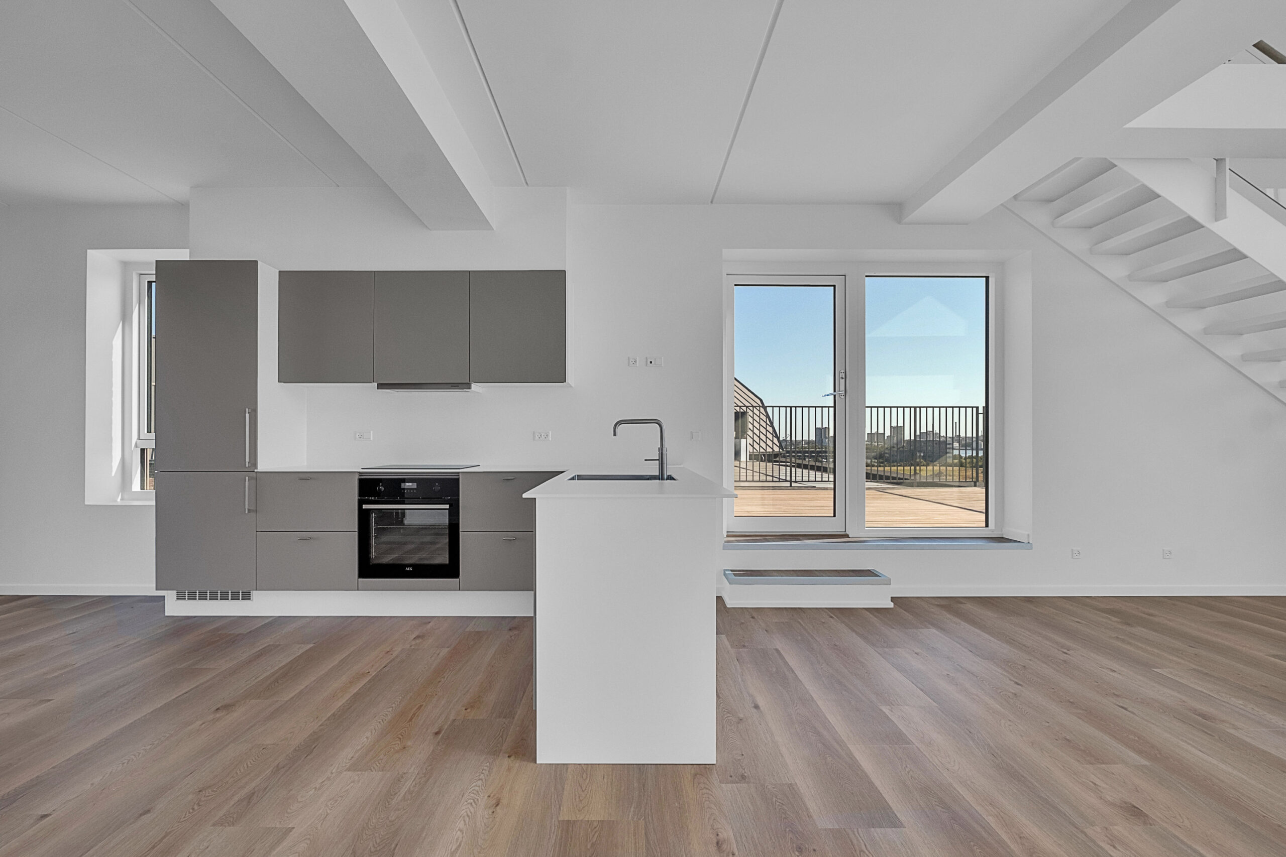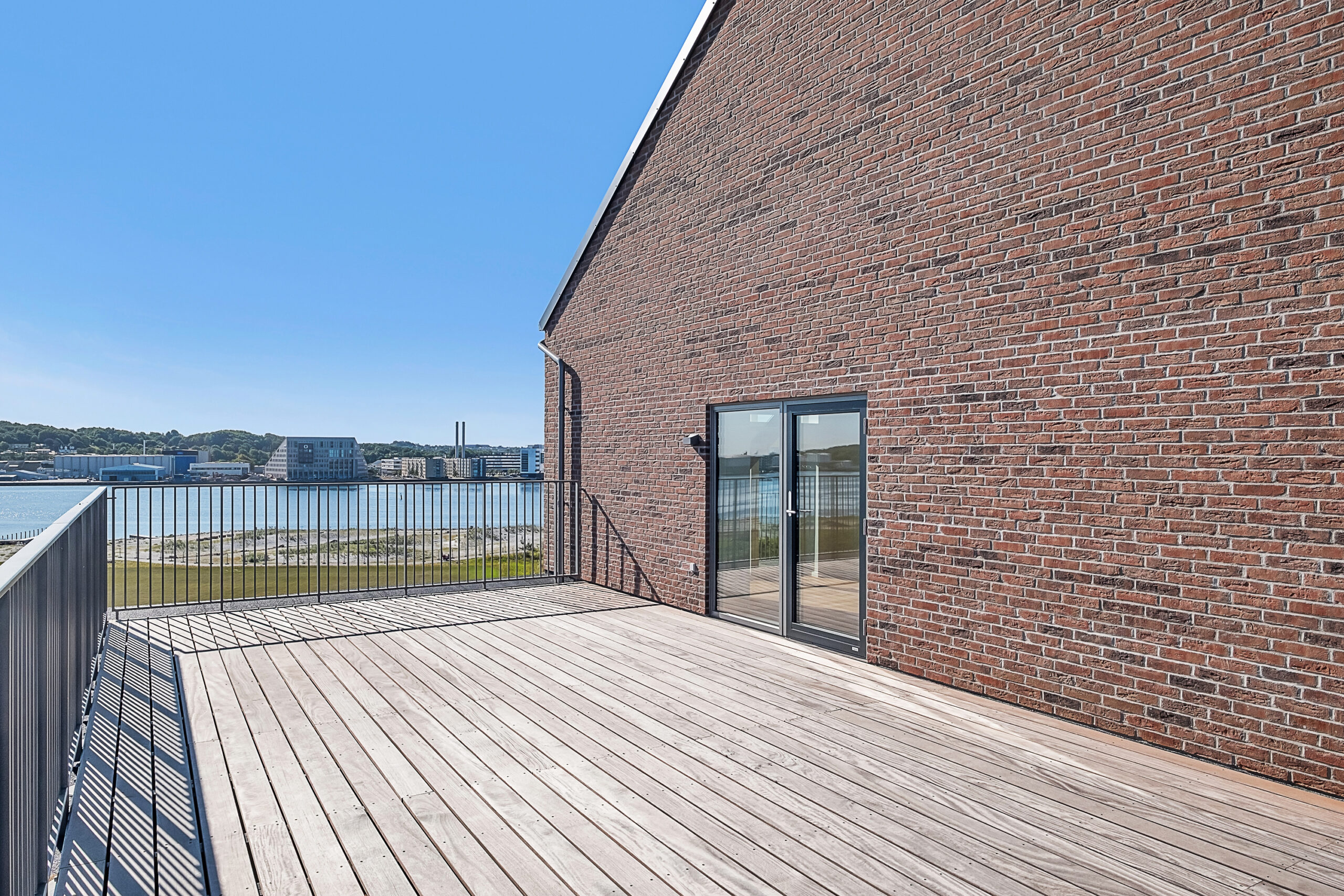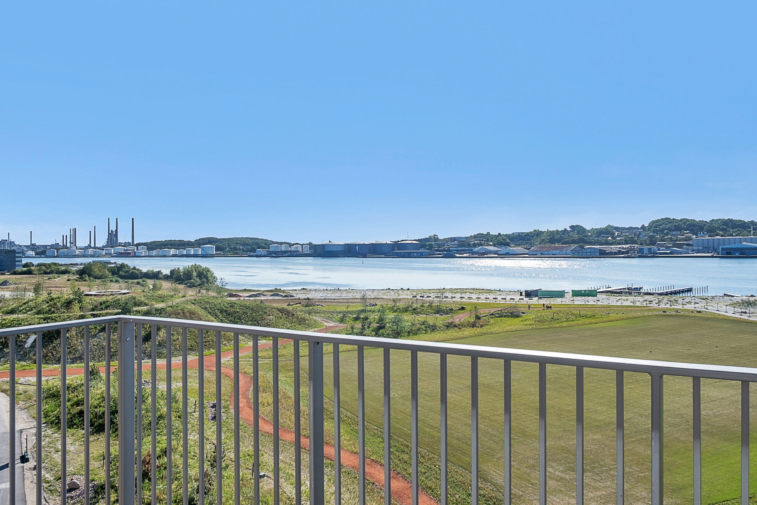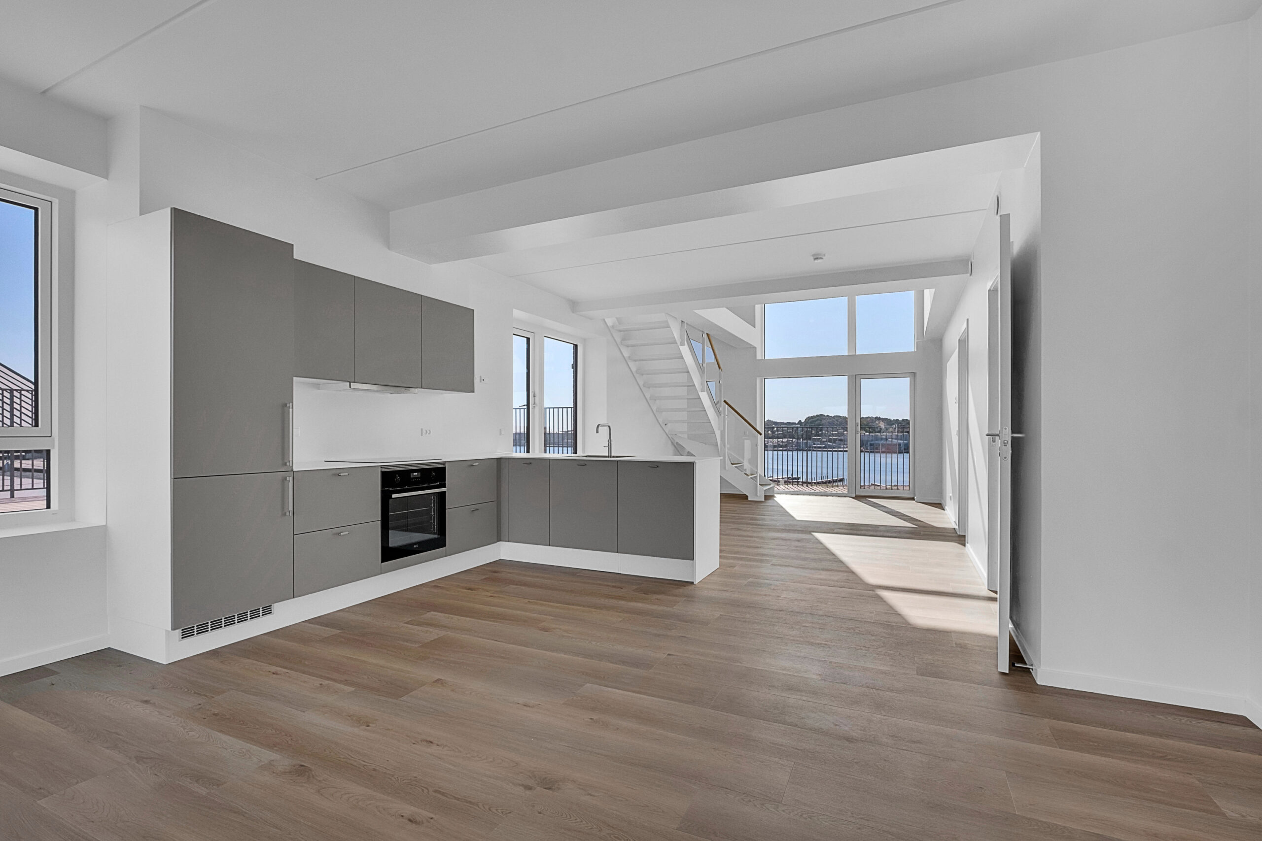 Lejligheden strækker sig over 135 kvadratmeter og er fordelt på to plan. Ved indgangen mødes man af en lys entre med faste skabe til overtøj og sko. Det åbne leverum med store vinduespartier skaber et fantastisk lysindfald og inviterer til hygge og samvær. Her finder du et eksklusivt HTH køkken, der er udstyret med alle nødvendige hårde hvidevarer, herunder en Quooker. Der er rigelig plads til både spiseplads og stue, og fra leverummet er der direkte adgang til en stor altan med udsigt over park og fjord. I stueetagen er der også et værelse med faste skabe samt et lækkert badeværelse. Trappen fører op til et skønt rum, perfekt til afslapning med plads til sofa eller stol, hvor du kan nyde udsigten fra de store vinduer. Soveværelset er også placeret på denne etage og har en glasvæg, så du kan vågne op til den smukke udsigt.