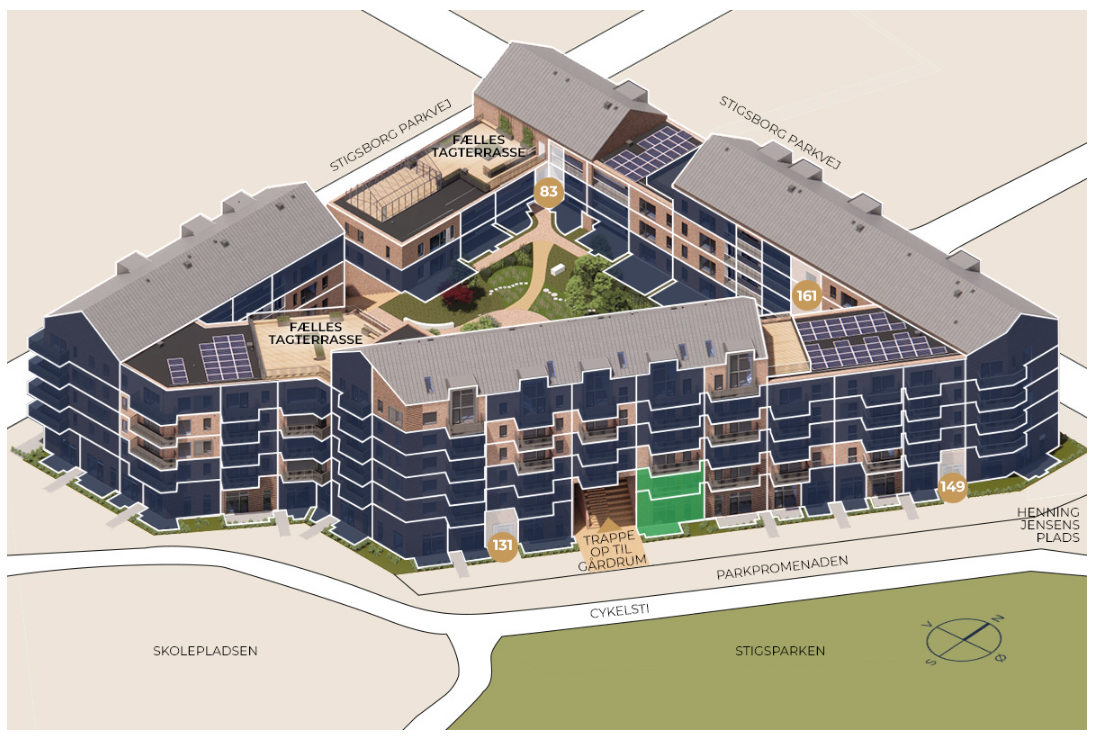 StigsborgHus byder på en lækker tagterrasse med panoramaudsigt over park, fjord og Aalborg, samt et skønt gårdmiljø. Til lejligheden hører et depotrum, cykelparkering, og der er mulighed for at leje p-plads.