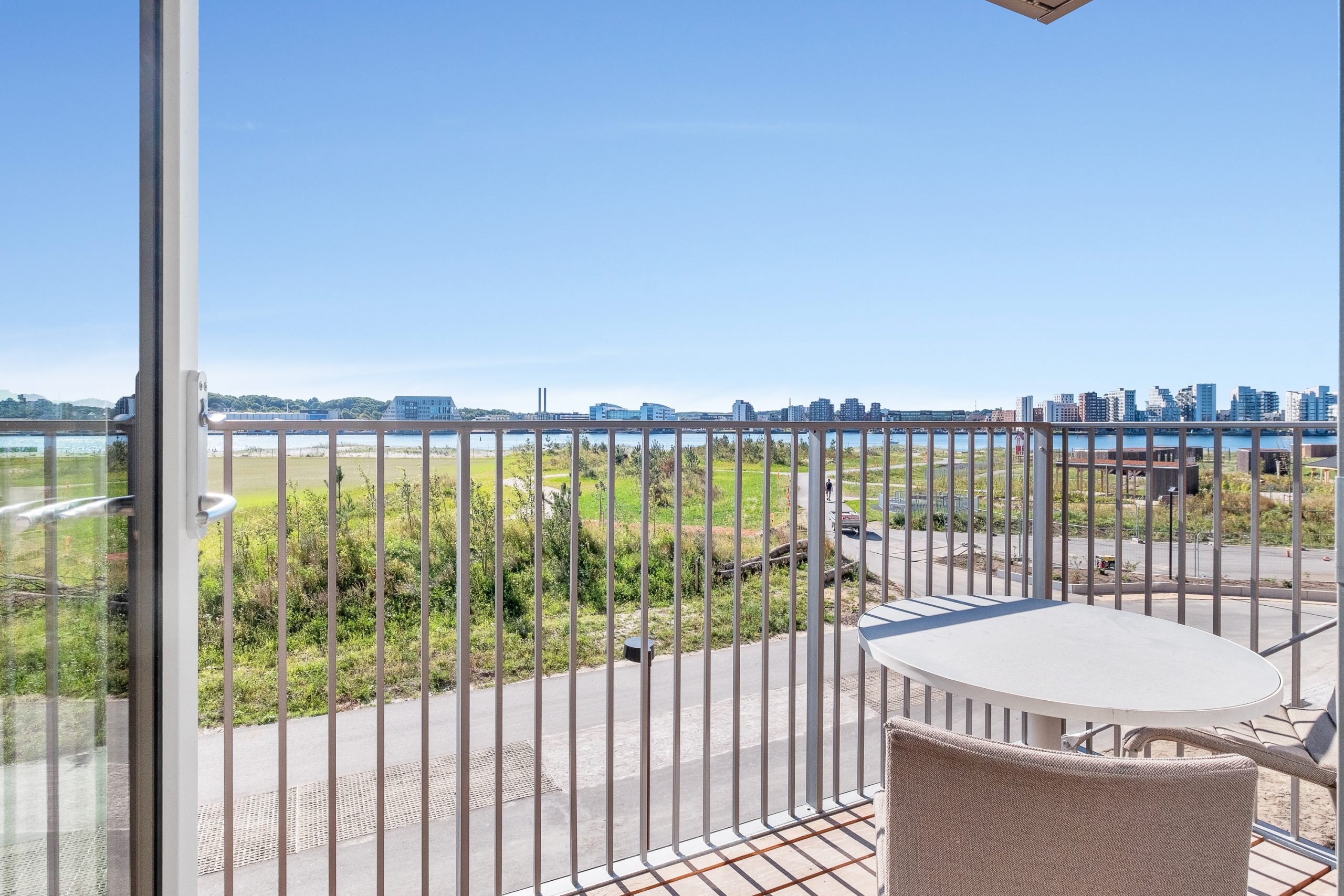 Lejligheden byder på en lys entré med plads til sko og overtøj, der fører ind til det store åbne leverum. Her finder du et eksklusivt HTH køkken, udstyret med moderne hårde hvidevarer, i åben forbindelse med stuen. Fra stuen er der en betagende udsigt over den omkringliggende park og fjorden, samt direkte adgang til den dejlige altan. De tre værelser er rummelige, og det ene værelse har adgang til et dejligt badeværelse. Derudover findes der et andet badeværelse med vaskemaskine og tørretumbler, tilgængeligt fra entréen.