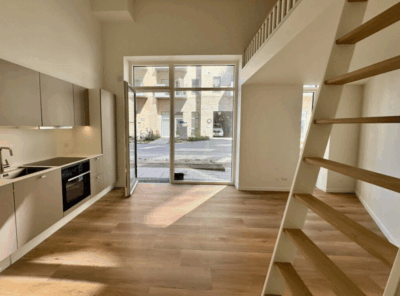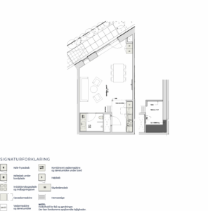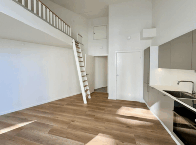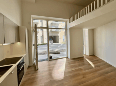 Denne skønne studio er en 1-værelses lejlighed med adgang fra en privat terrasse. Vi træder indenfor i lejligheden fra terrassen, og starter med at hænge overtøjet i garderobeskabet lige indenfor døren. Vi står nu i lejlighedens leverum; det skønt stort rum med superhøjt til loftet og kæmpe vinduespartier der sikre et flot lysindfald. Her har vi et eksklusiv køkken fra HTH køkken og stue i ét. Fra stuen er der adgang til en virkelig stor hems, der fint kan indrettes med soveplads. Herudover har lejligheden er stort lækkert badeværelse med kombineret vaske-/tørremaskine.