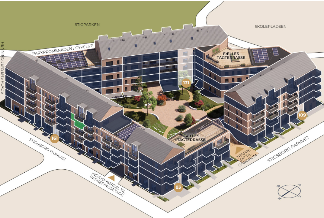 StigsborgHus tilbyder en række fællesfaciliteter, herunder en lækker tagterrasse med panoramaudsigt over park, fjord og Aalborg. Tagterrassen er møbleret med et orangeri, og der er et dejligt gårdmiljø til afslapning. Derudover er der et lille depotrum i lejligheden samt mulighed for leje af p-plads i parkeringsområdet, og der er aflåst cykelparkering for beboerne.