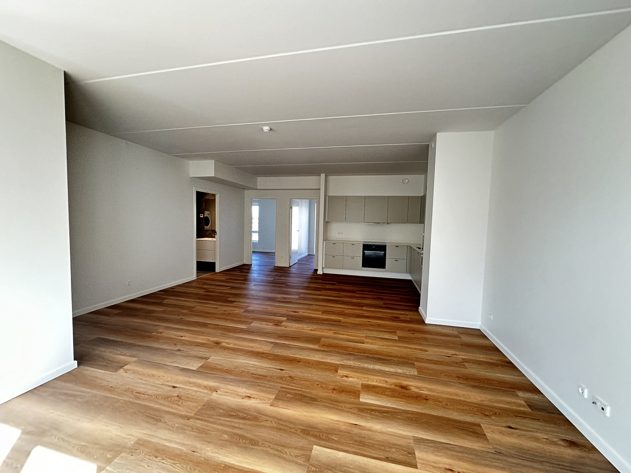 Lejligheden byder på en rummelig entré med faste skabe, et stort køkken/alrum udstyret med et lækkert HTH-køkken, der har alt i hårde hvidevarer. Fra det lyse leverum er der adgang til et stort badeværelse med vaskesøjle samt to store værelser, begge med udgang til den store altan, hvor du kan nyde kigget til park og fjord.