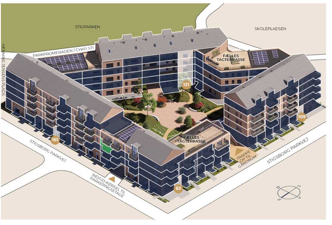 StigsborgHus byder på en dejlig tagterrasse med panoramaudsigt over park, fjord og Aalborg. Her kan man finde ro i orangeriet eller nyde de grønne omgivelser i det hyggelige gårdmiljø. Derudover er der aflåst cykelparkering og mulighed for at leje en parkeringsplads.