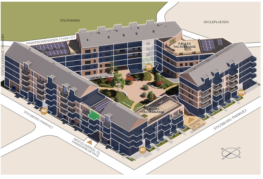StigsborgHus tilbyder en lækker tagterrasse med panoramaudsigt over park, fjord og Aalborg. Her findes også et orangeri samt et dejligt gårdmiljø, der indbyder til ophold. I parkeringskælderen er der depotrum og cykelparkering, samt mulighed for leje af p-plads.