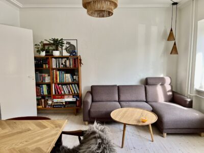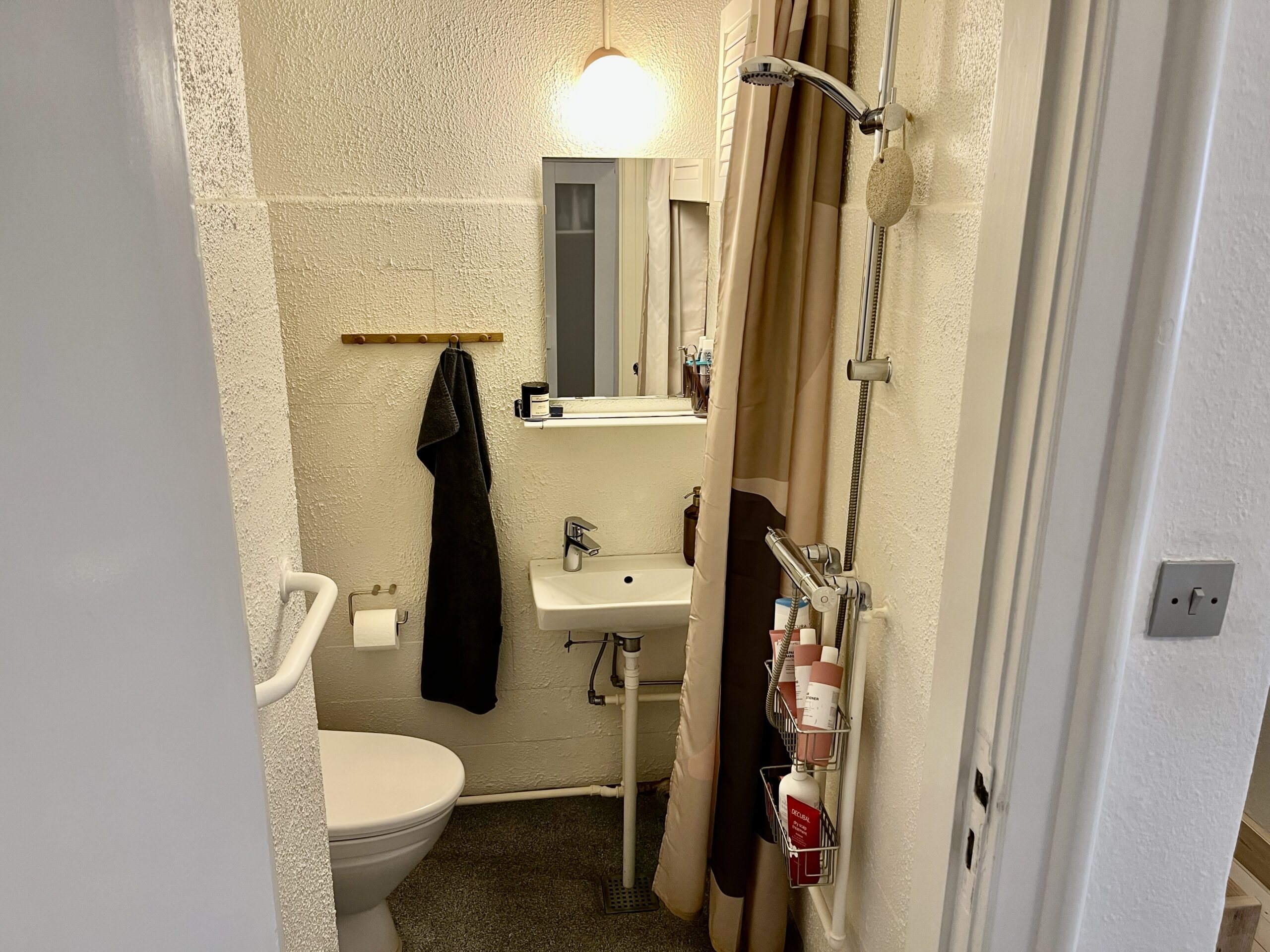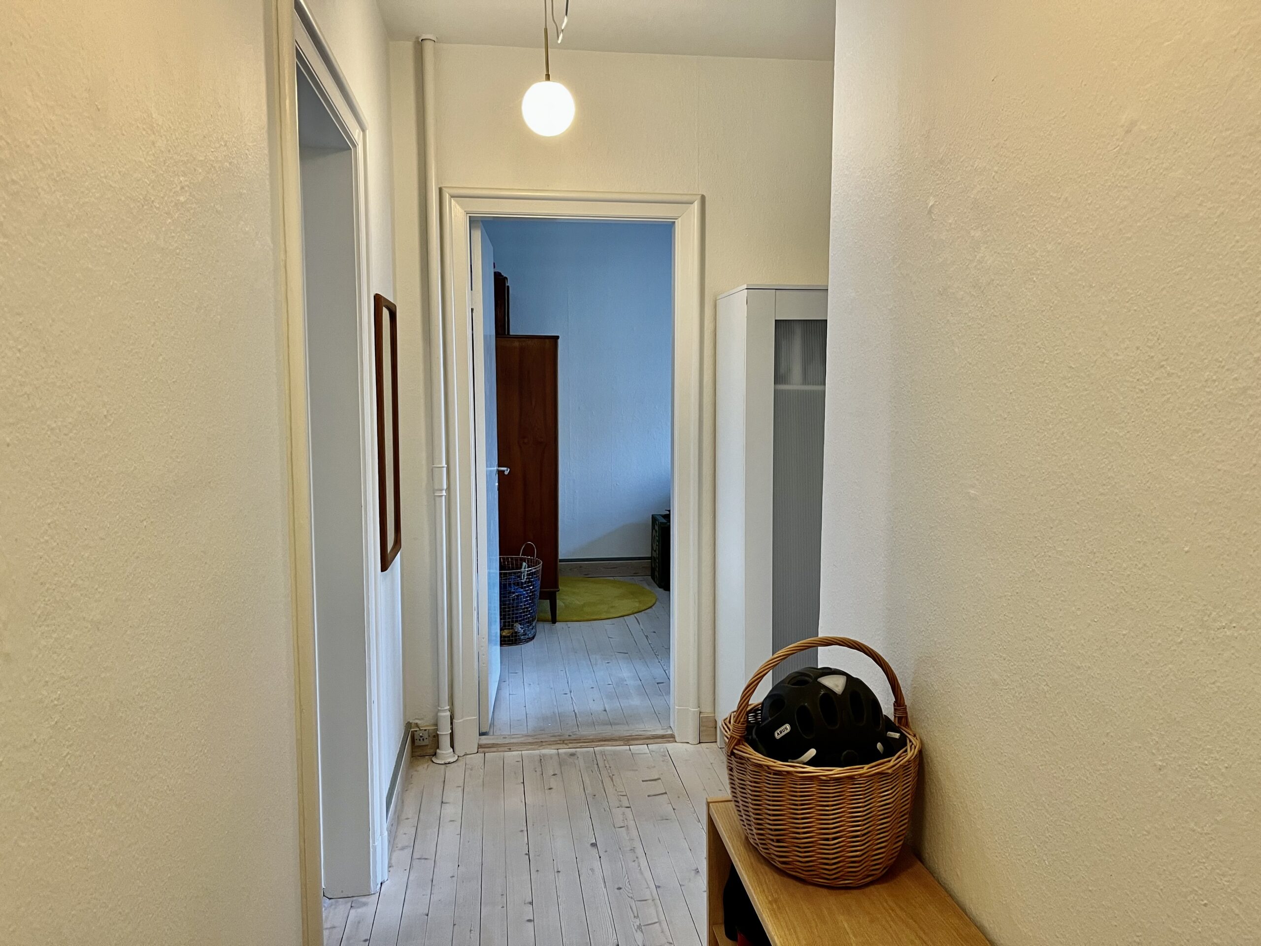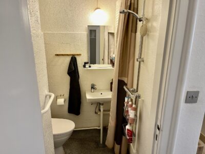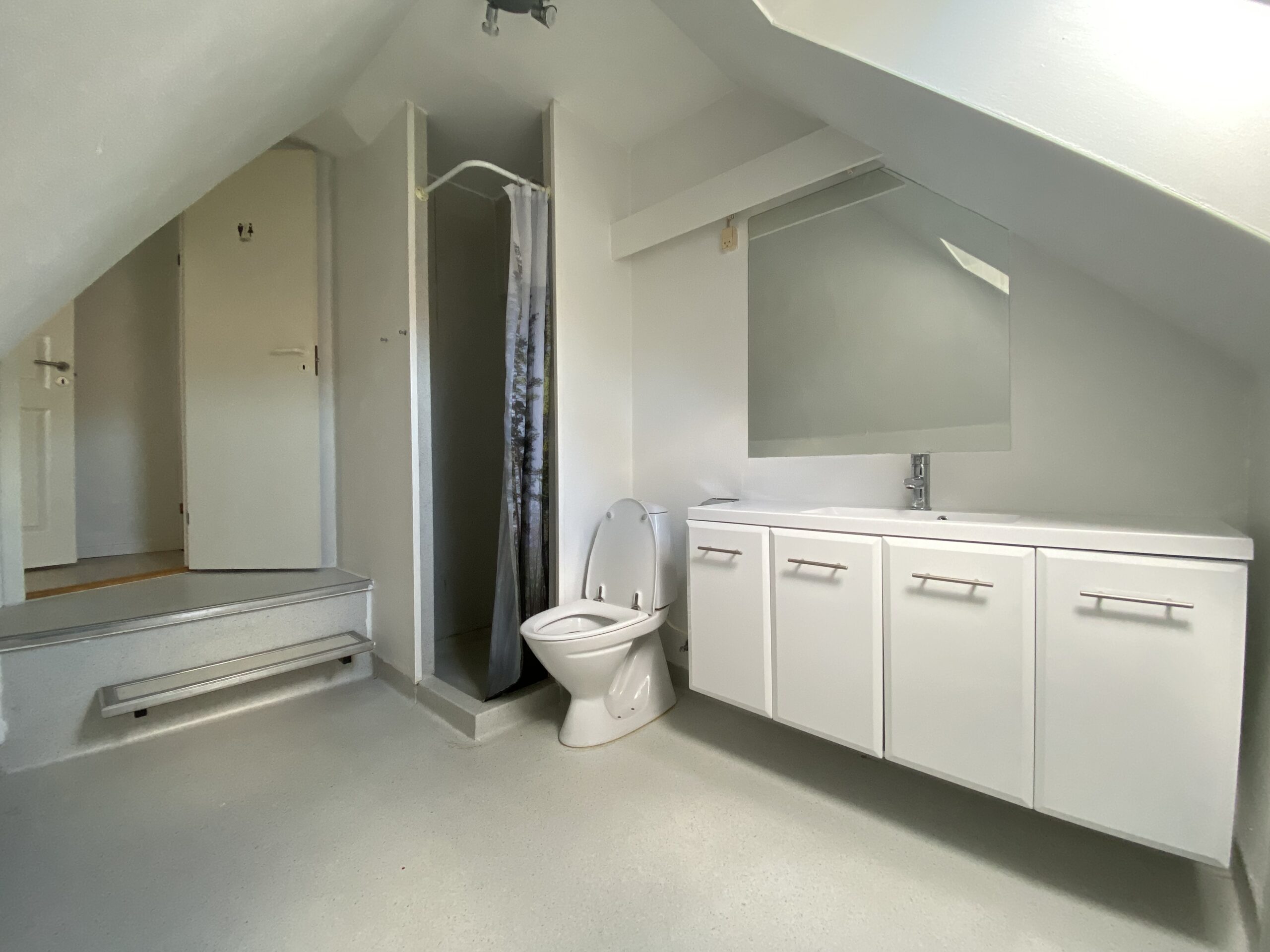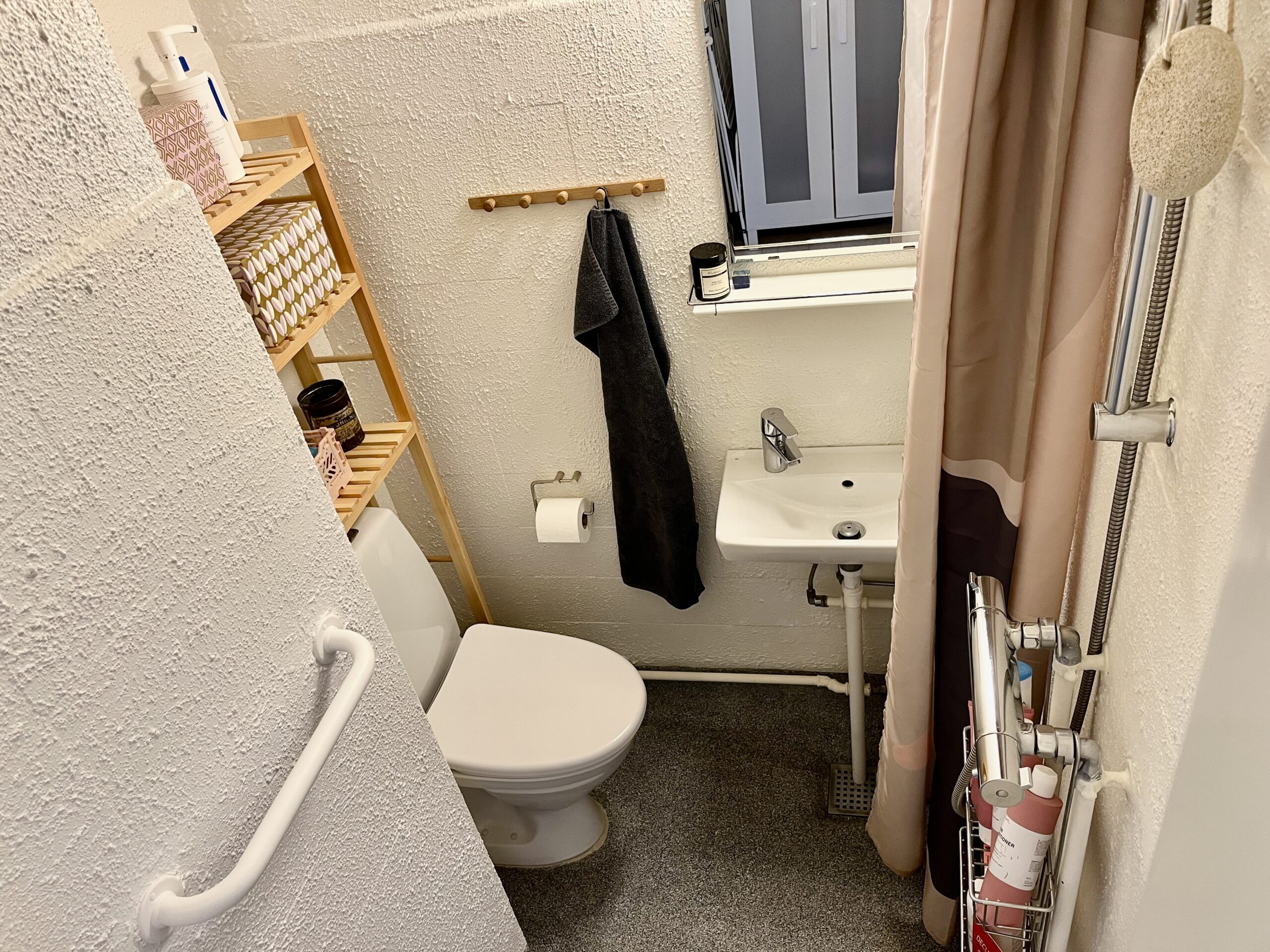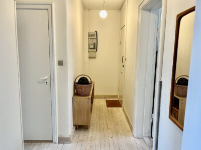 Denne skønne lejlighed er bestående af en god stor entré/fordelingsgang med udgang til badeværelset. Her er der lavet en god løsning ift. brusebadet. Det er skærmet af med forhæng i starten af badeværelset. Når man så træder længere ind, har vi toilet og håndvask m.m.