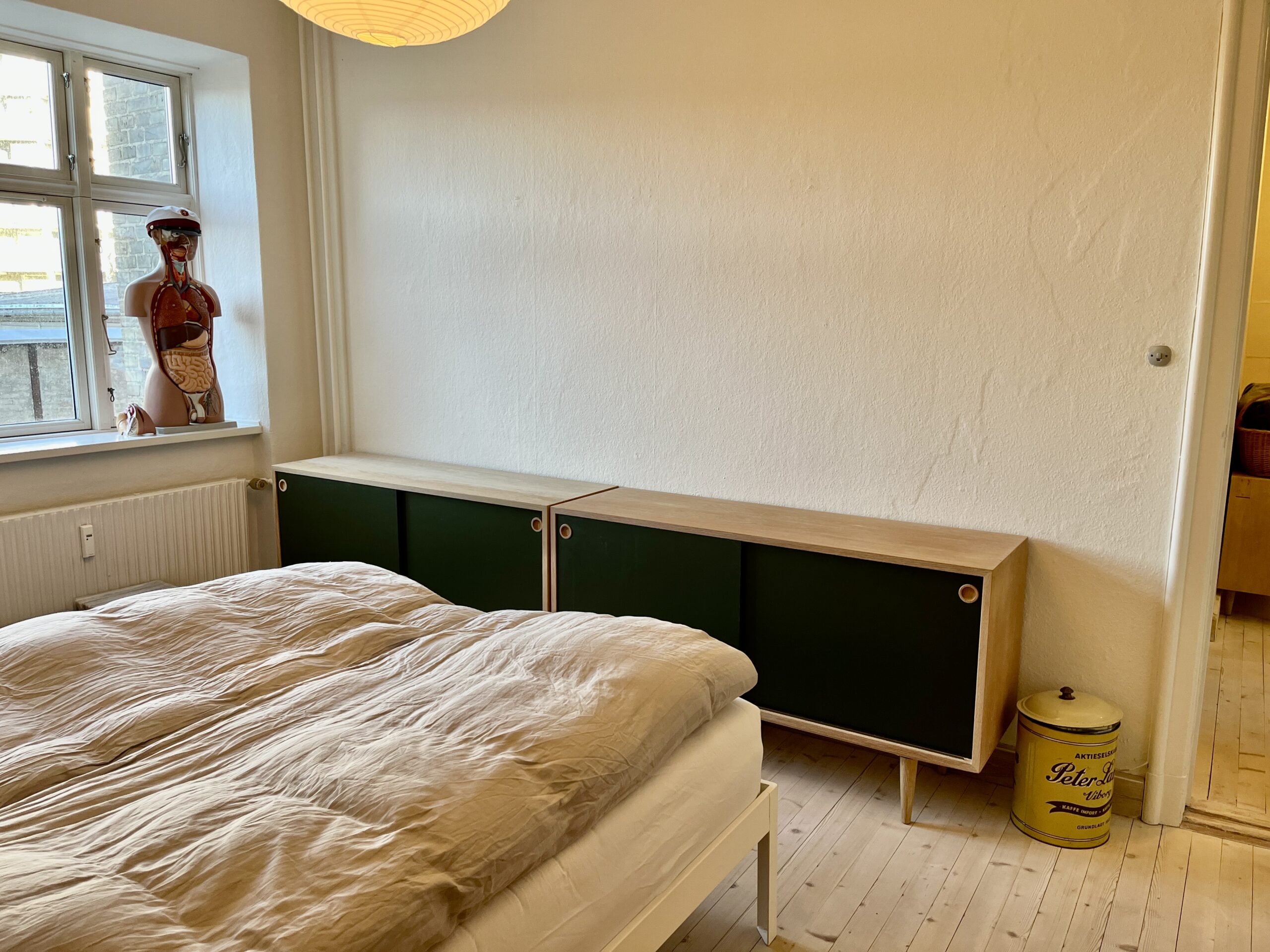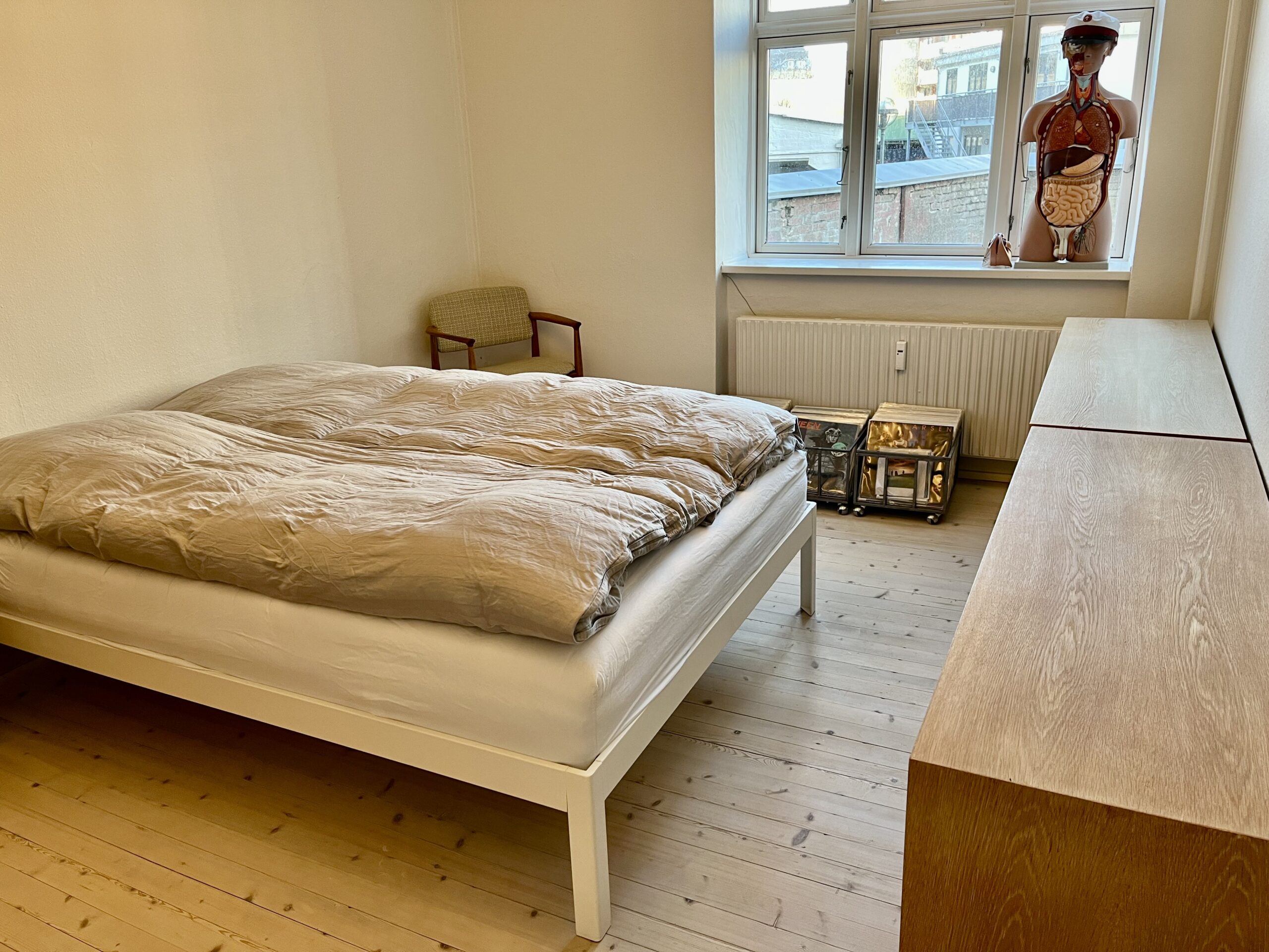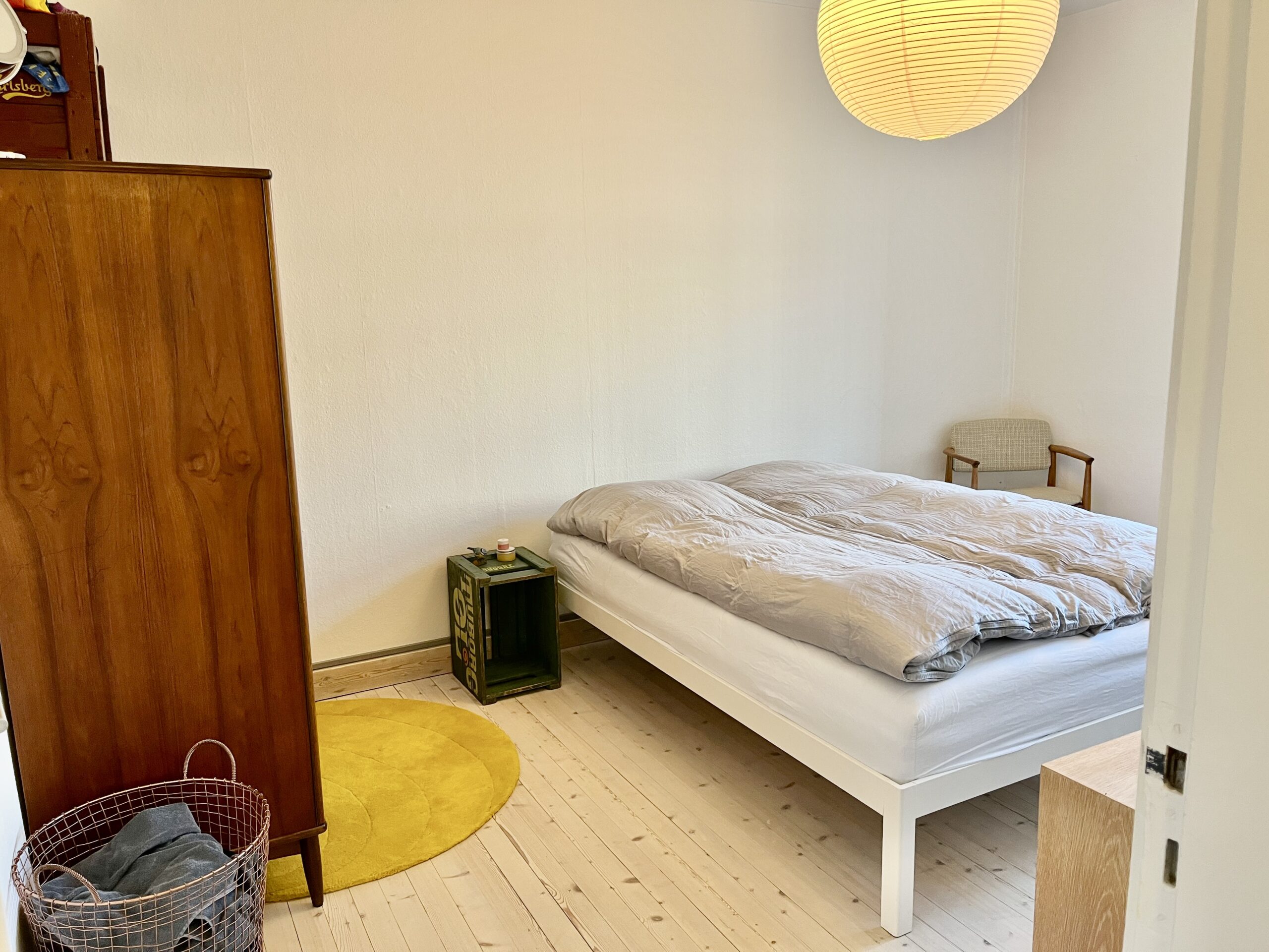 Så har vi soveværelset, som også er af en god størrelse. Der kan man have en almindelig dobbeltseng, et skrivebord, kommoder og klædeskab. Altså hvad man kunne have brug for at have, i et soveværelse i en 2-værelses lejlighed.