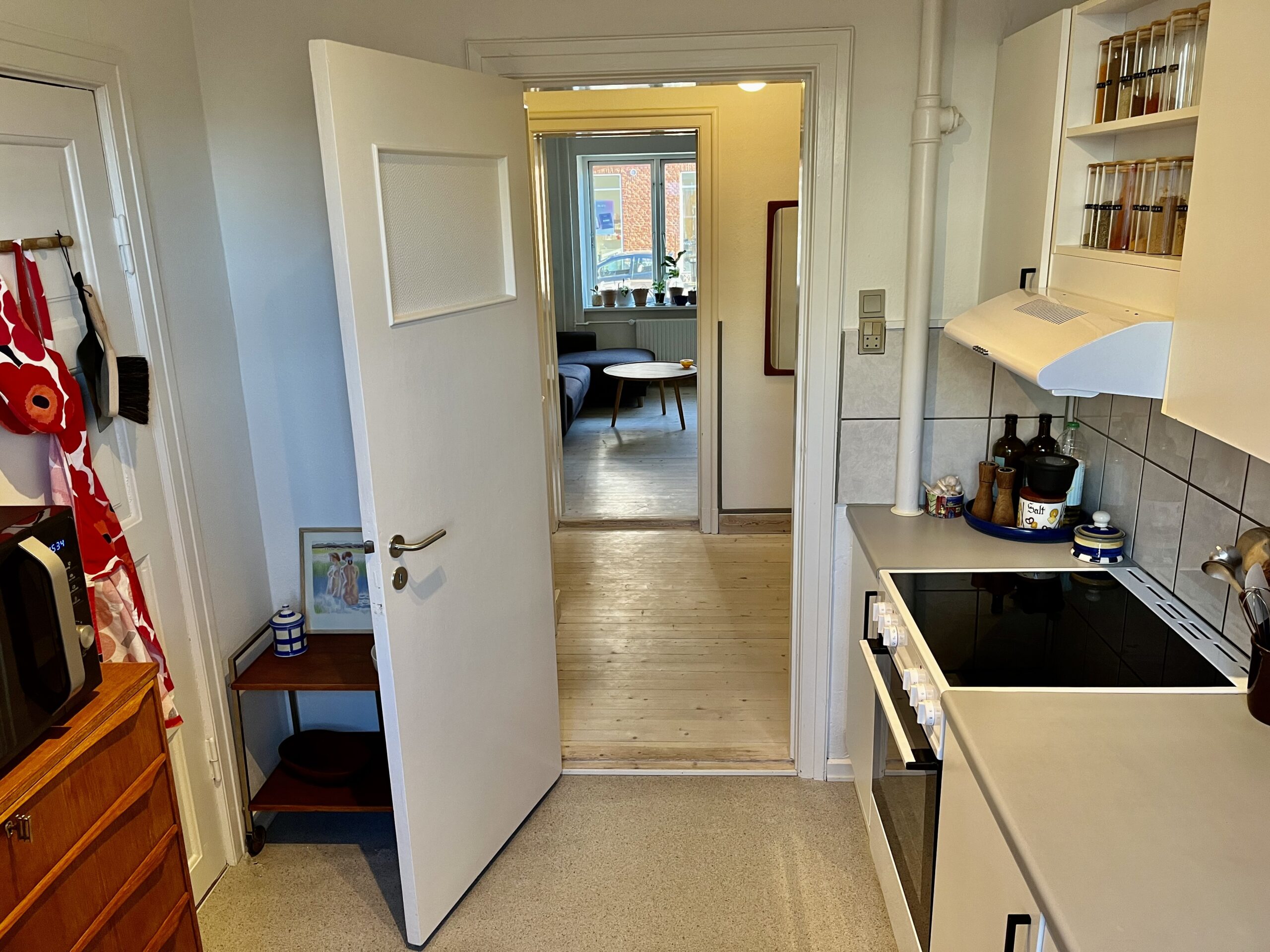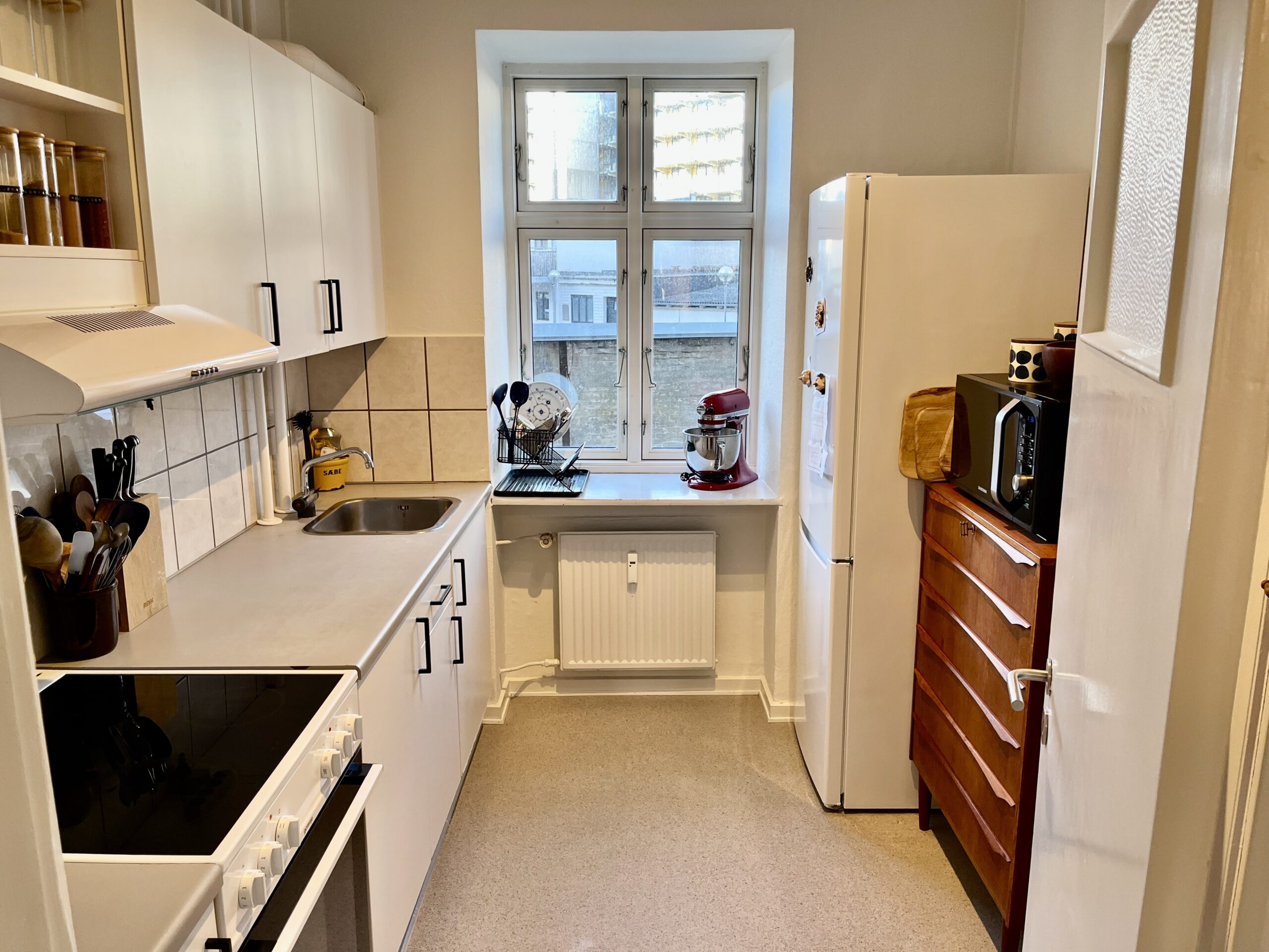 Til slut har vi køkkenet. Det er flot hvidt og har godt med bordplads og skabsplads. Her kan man også have noget ekstra hvis man vil. Enten en kommode med skuffer, som kan ses på billederne eller evt. et mindre spisebord til to personer.