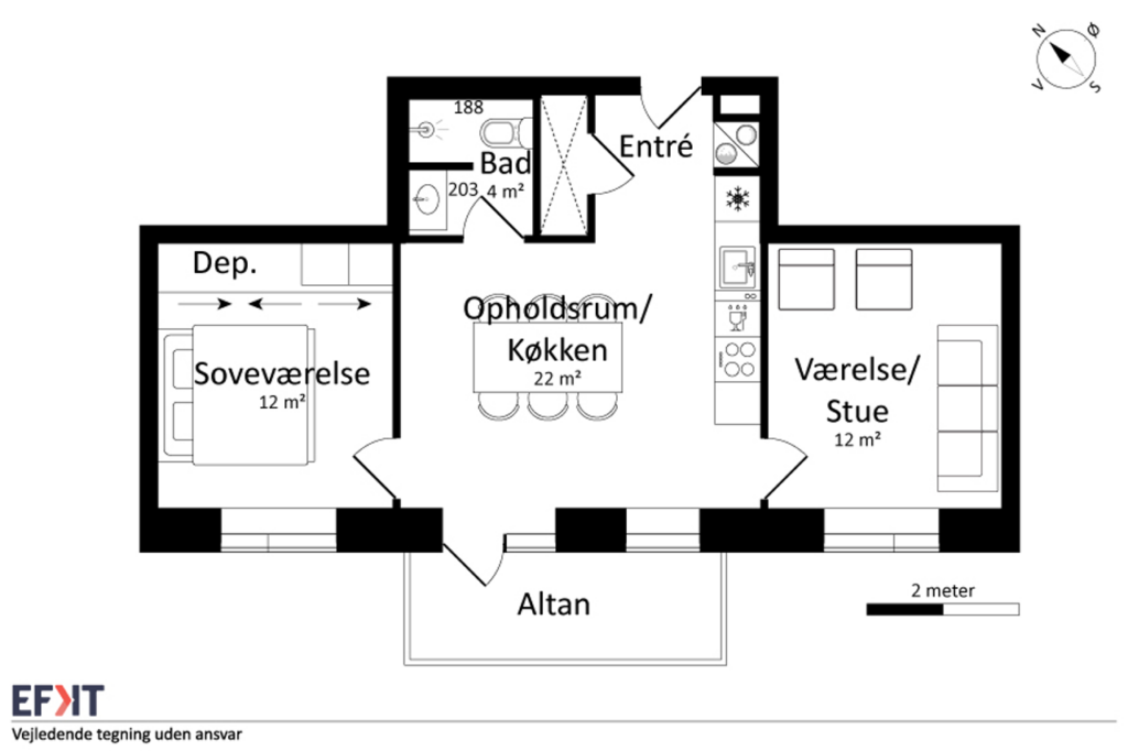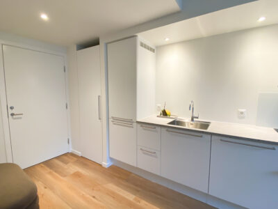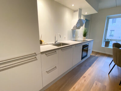 Denne lyse og velindrettede lejlighed byder på et åbent og indbydende køkken-alrum med udgang til en privat sydvendt altan, der giver masser af lys og luft. Det stilfulde Svane-køkken er komplet med en moderne hvidevarepakke, herunder induktionskogeplade, pyrolyseovn, køle-/fryseskab, opvaskemaskine, vaskemaskine og tørretumbler. Lejligheden rummer desuden to værelser og et lækkert badeværelse, og er udstyret med moderne kvalitetsmaterialer som akustikgulve og gulvvarme, hvilket sikrer en komfortabel og rolig atmosfære. Mellem de fire bygninger findes et hyggeligt gårdmiljø, der er perfekt til ophold og socialt samvær med naboerne. Der er mulighed for parkering, og alle lejligheder har adgang til et depotrum.