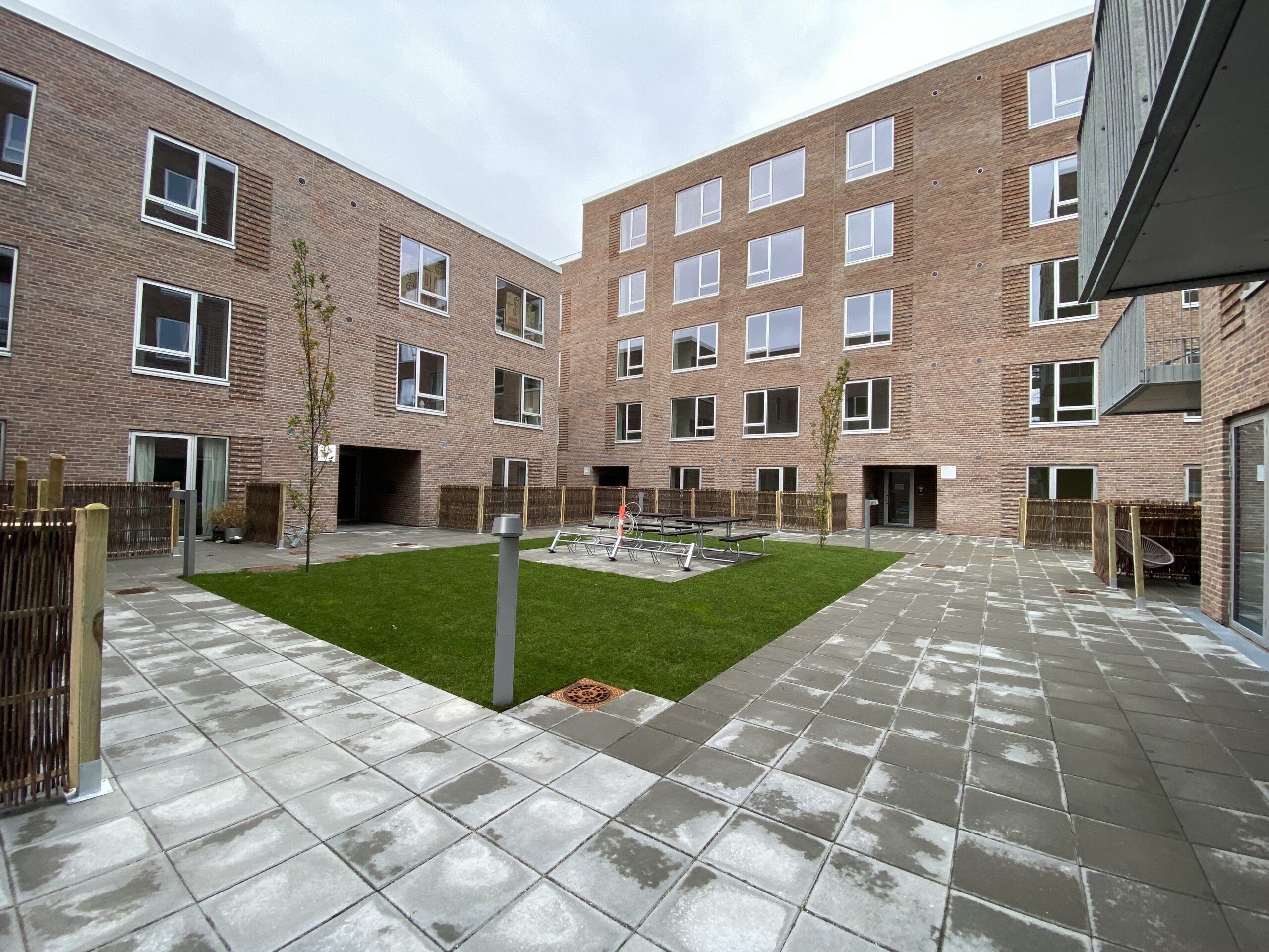 Denne lyse og velindrettede lejlighed byder på et åbent og indbydende køkken-alrum med udgang til en privat sydvendt altan, der giver masser af lys og luft. Det stilfulde Svane-køkken er komplet med en moderne hvidevarepakke, herunder induktionskogeplade, pyrolyseovn, køle-/fryseskab, opvaskemaskine, vaskemaskine og tørretumbler. Lejligheden rummer desuden to værelser og et lækkert badeværelse, og er udstyret med moderne kvalitetsmaterialer som akustikgulve og gulvvarme, hvilket sikrer en komfortabel og rolig atmosfære. Mellem de fire bygninger findes et hyggeligt gårdmiljø, der er perfekt til ophold og socialt samvær med naboerne. Der er mulighed for parkering, og alle lejligheder har adgang til et depotrum.