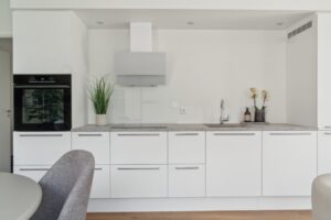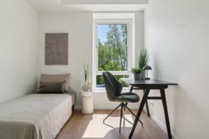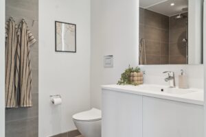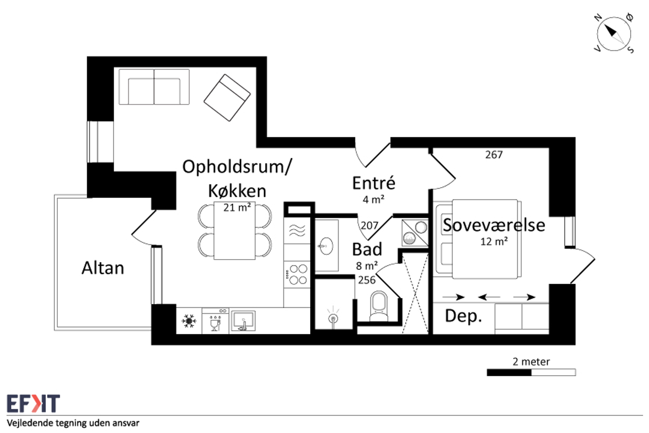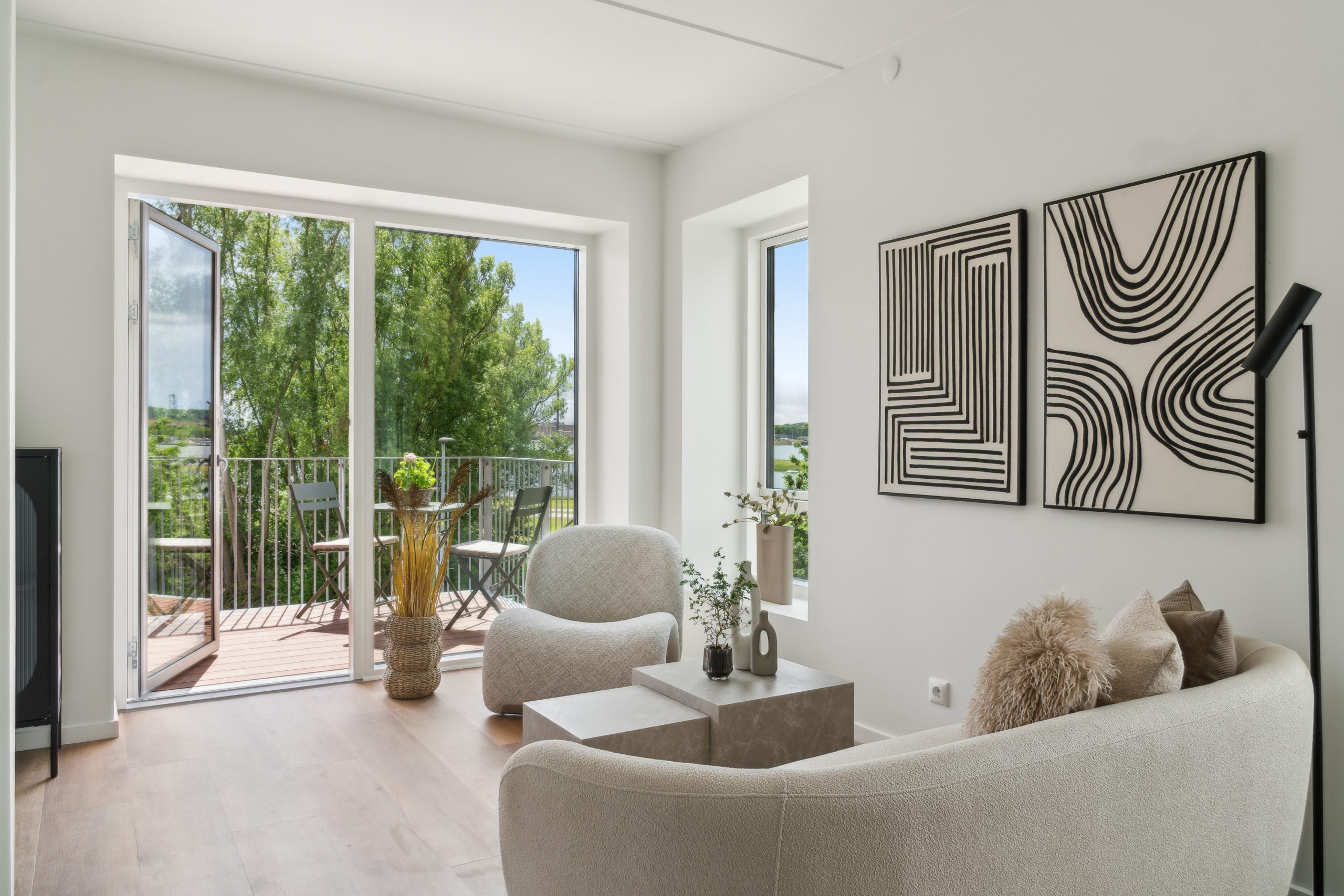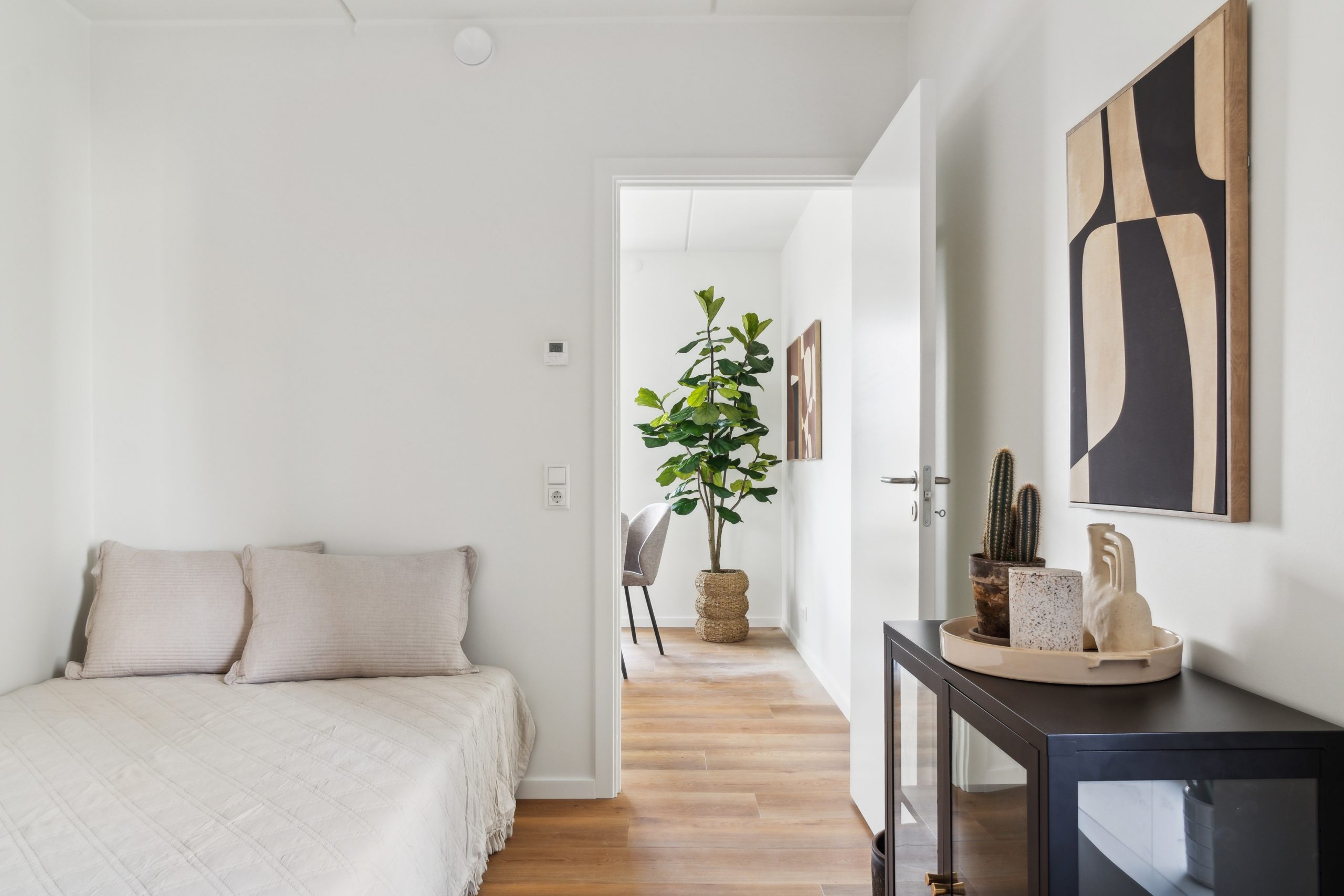 Denne lyse og velindrettede lejlighed byder på et åbent og indbydende køkken-alrum med udgang til en privat vestvendt altan, der giver masser af lys og luft. Det stilfulde Svane-køkken er komplet med en moderne hvidevarepakke, herunder induktionskogeplade, pyrolyseovn, køle-/fryseskab, opvaskemaskine, vaskemaskine og tørretumbler. Lejligheden rummer desuden et soveværelse og et lækkert badeværelse, og er udstyret med moderne kvalitetsmaterialer som akustikgulve og gulvvarme, hvilket sikrer en komfortabel og rolig atmosfære. Mellem de fire bygninger findes et hyggeligt gårdmiljø, der er perfekt til ophold og socialt samvær med naboerne. Der er mulighed for parkering, og alle lejligheder har adgang til et depotrum.