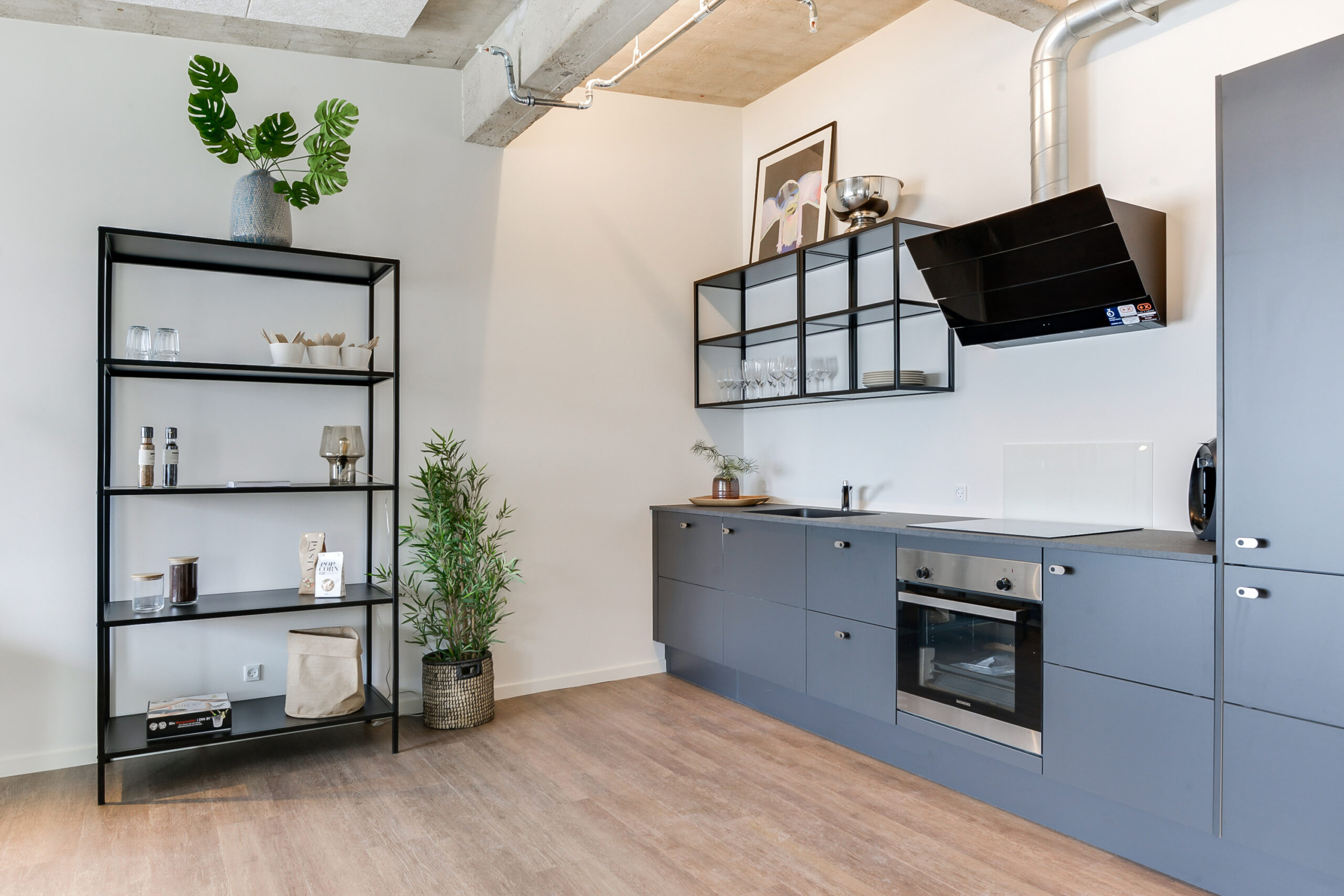 I lejligheden er der et minimalisk køkken der også er udført i et industrielt look med indbyggede hvidevarer i form af opvaskemaskine og køle/frys. Ydermere er der indbygningsovn, kogeplade samt emhætte. Der er i lejligheden også vaskemaskine og tørretumbler.