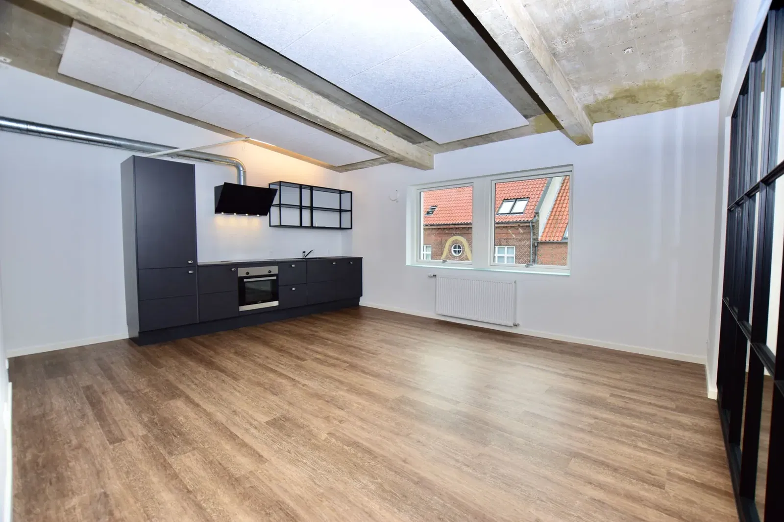 Lejligheden byder velkommen i en entré, der fører til et rummeligt badeværelse og et stort køkken-alrum. Opholdsrummet er præget af store vinduer, der giver et dejligt lysindfald og et skønt kig til byens tage. Loftet med rå, pudsede betonflader og de fritliggende rør bidrager til den unikke New Yorker-stemning, mens de slidstærke vinylgulve med trælook tilføjer varme til rummet. Køkkenet er minimalistisk med mørke, matte fronter og udstyret med integrerede hvidevarer såsom opvaskemaskine og indbygningsovn, hvilket gør det ideelt til både hverdagens madlavning og gæstebesøg.