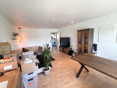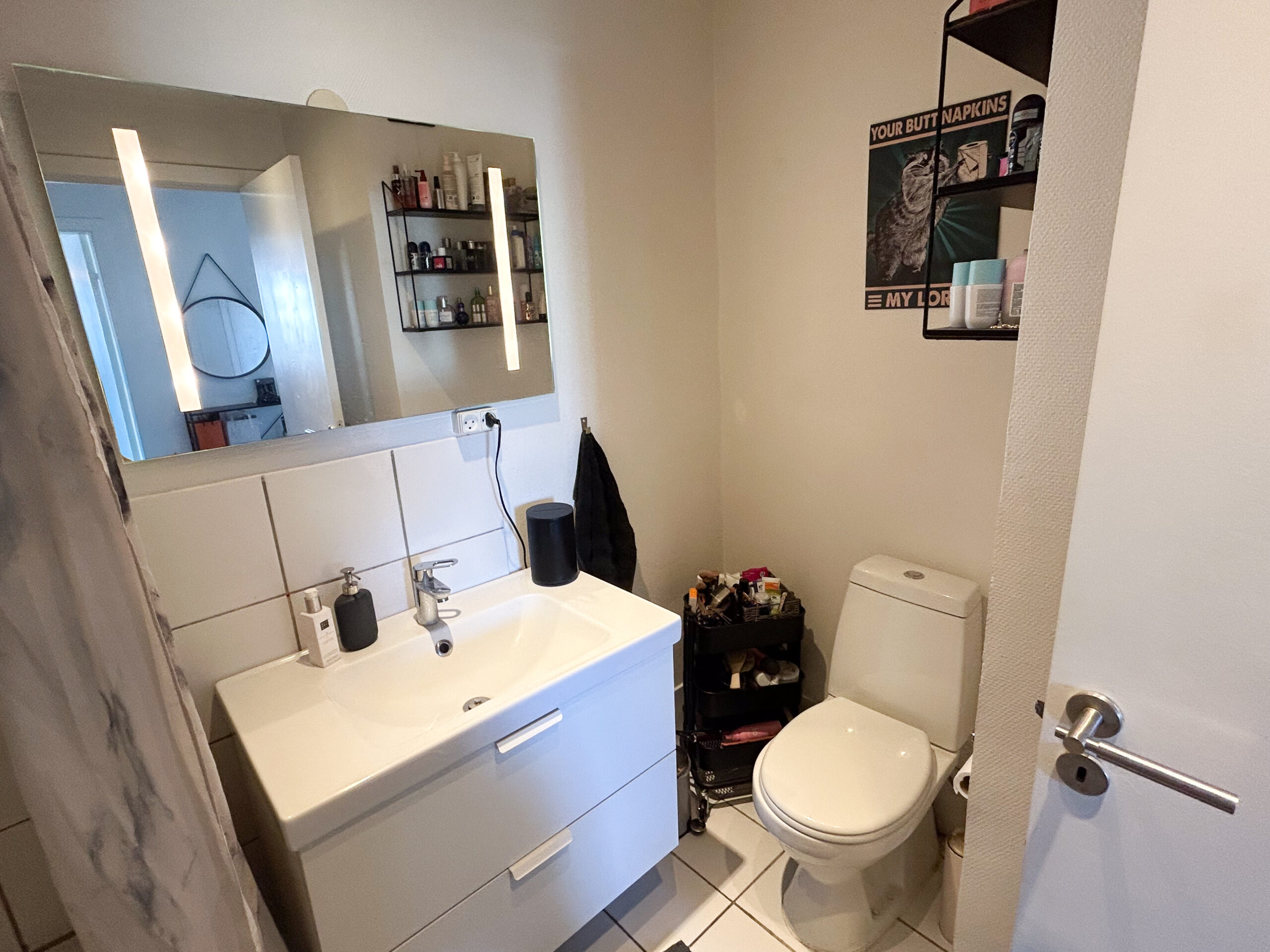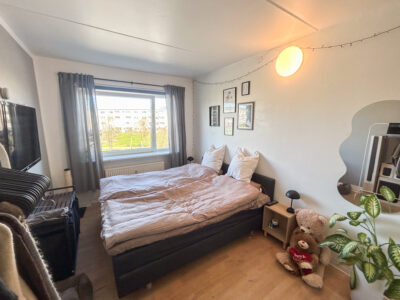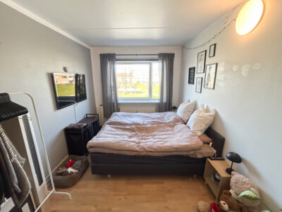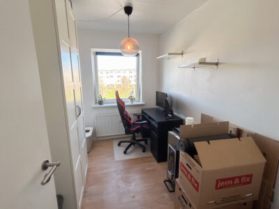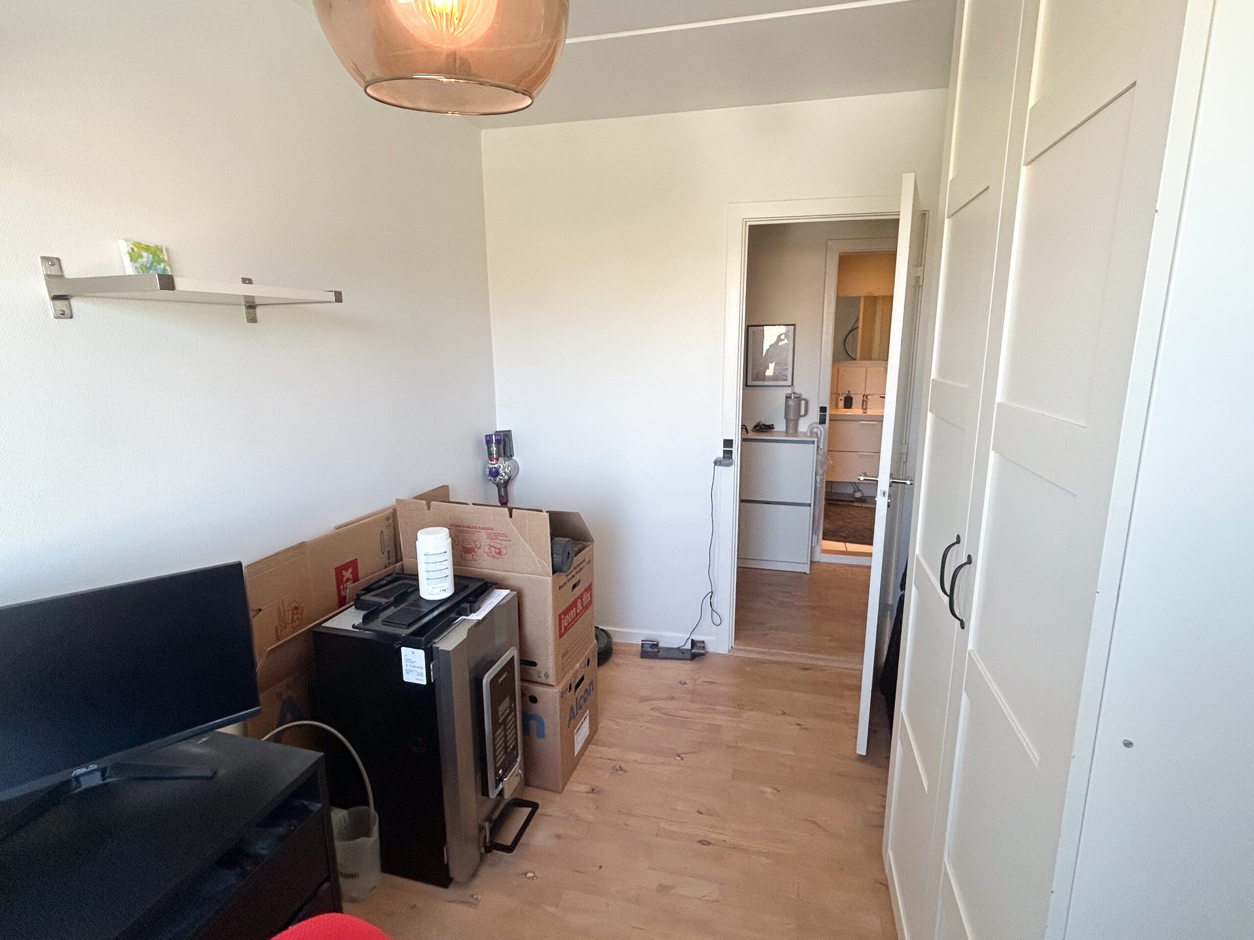 Lejligheden byder velkommen via en fordelingsgang, der giver en praktisk adgang til boligens forskellige rum. Til højre findes et mindre værelse, som egner sig perfekt til kontor, børneværelse eller gæsterum. På venstre side ligger badeværelset, der skiller sig positivt ud med sit badekar – en sjælden og eftertragtet detalje.