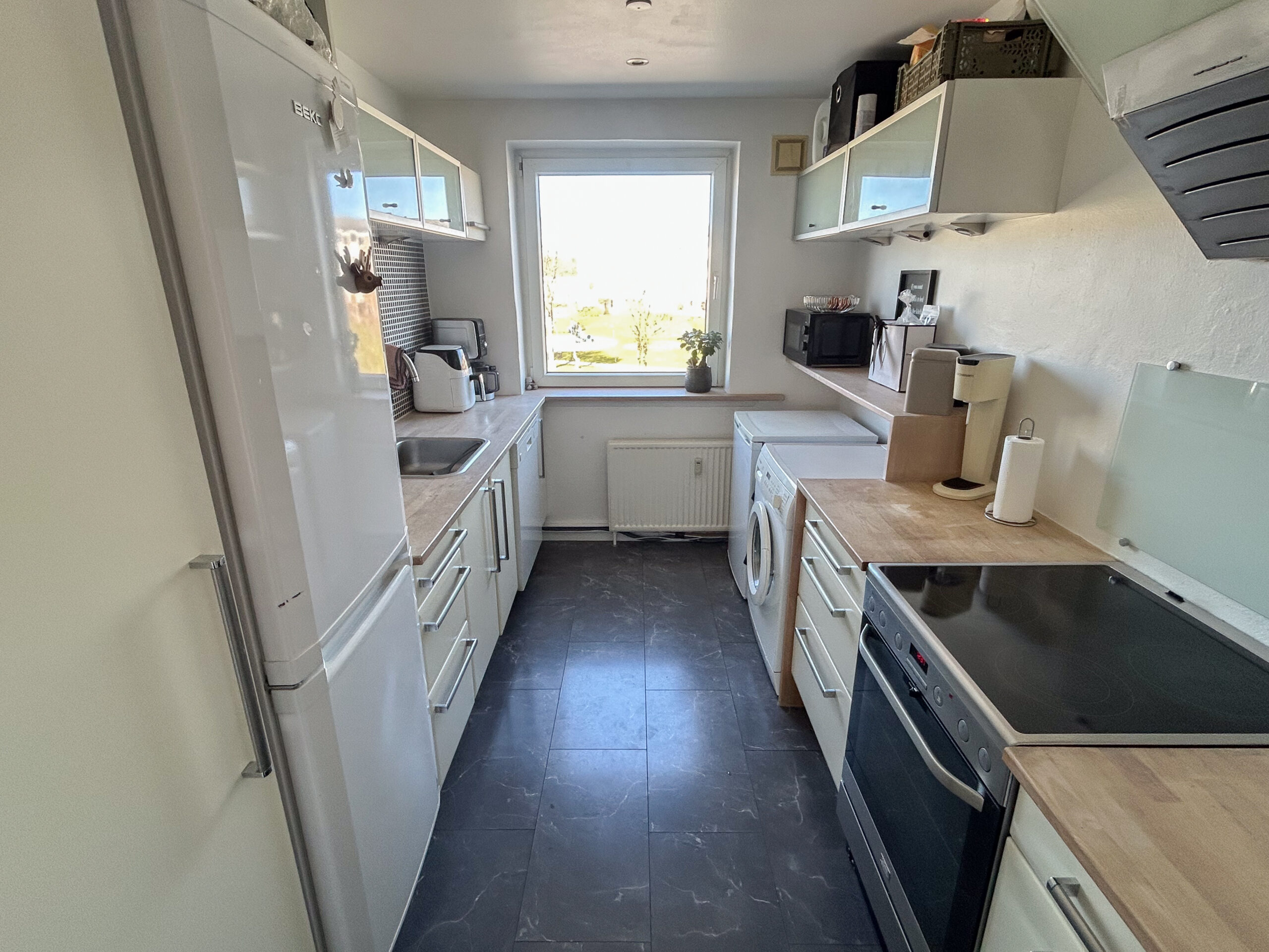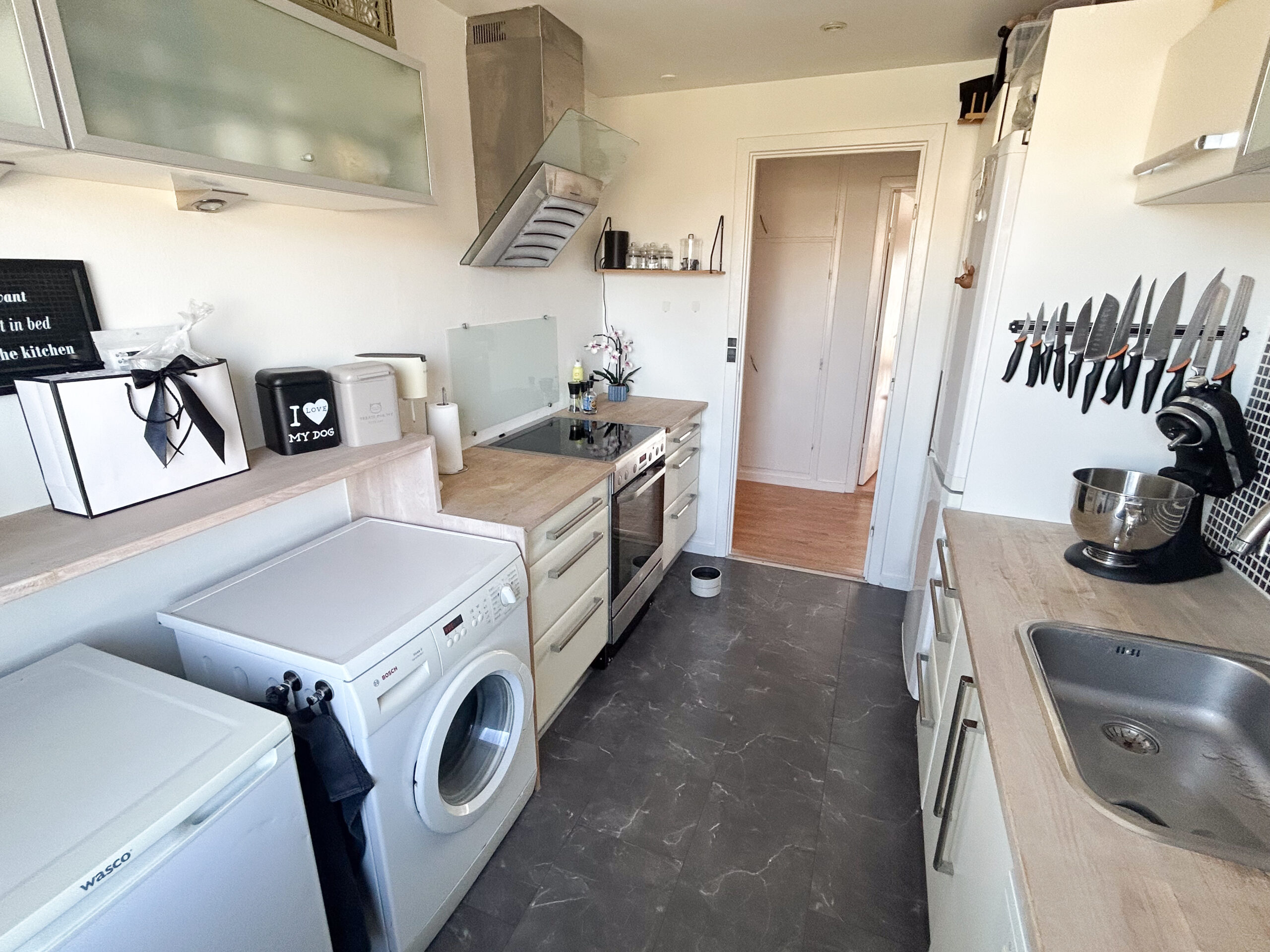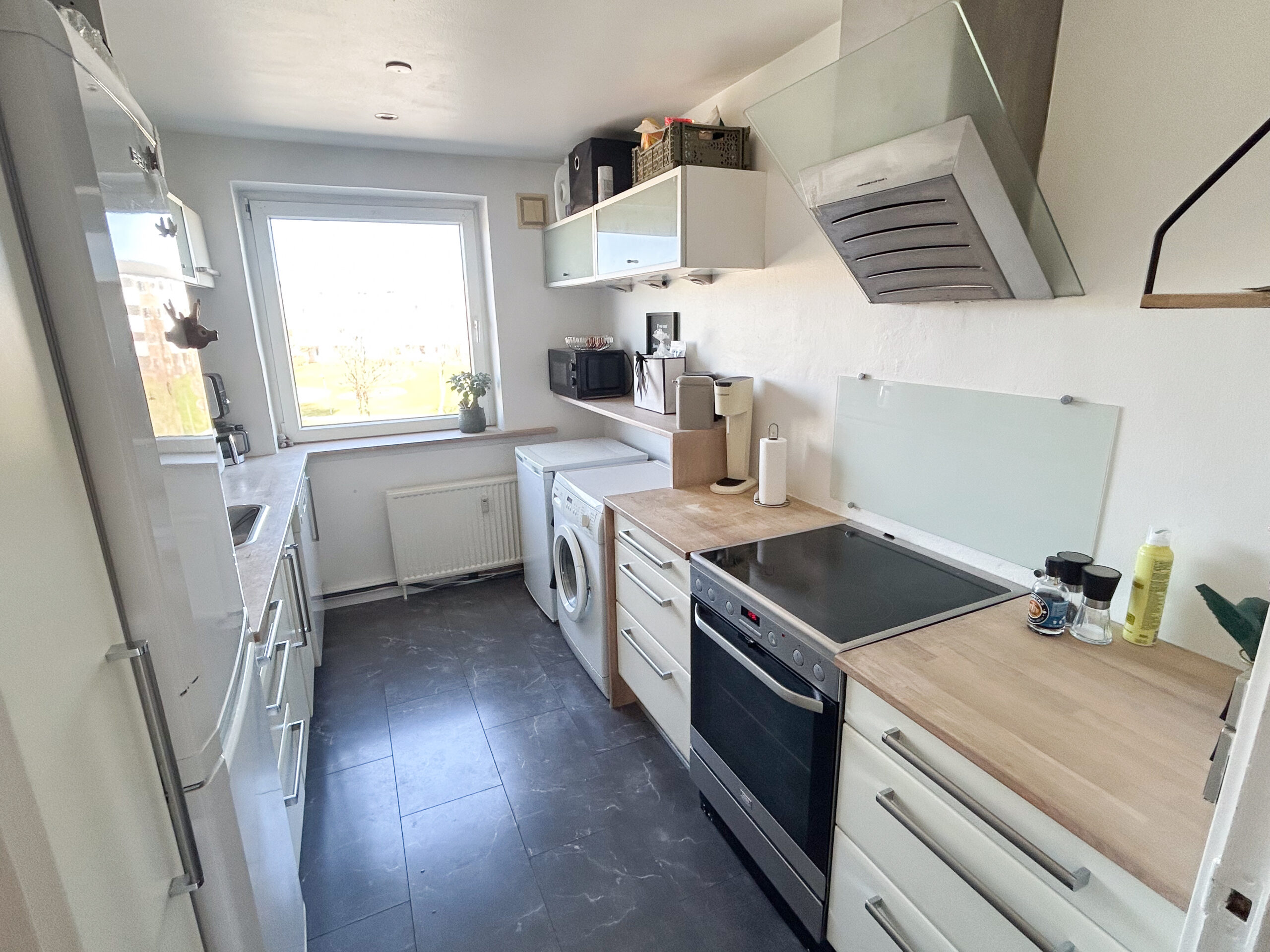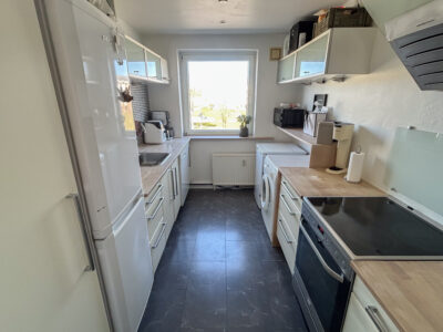 Videre ned ad gangen finder man et rummeligt køkken med god skabsplads og fine muligheder for at sætte sit eget præg på indretningen. Køkkenet er desuden veludstyret med både vaskemaskine og opvaskemaskine, hvilket gør hverdagen ekstra bekvem.
