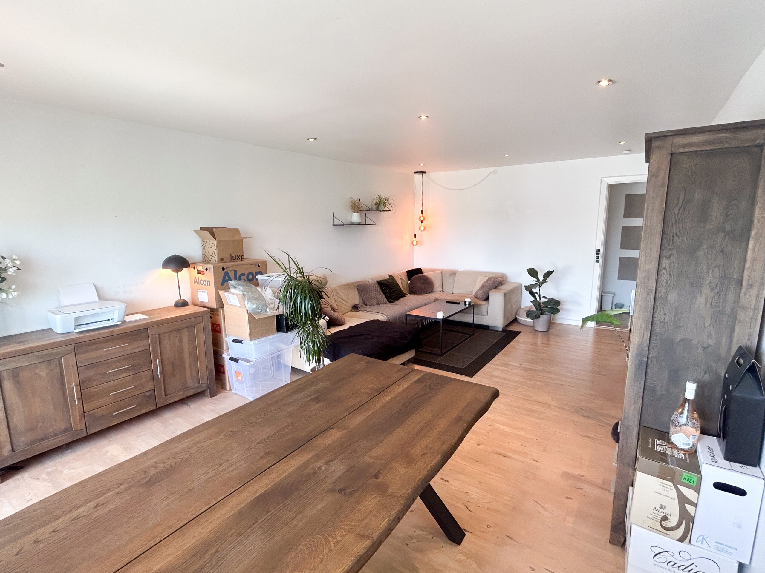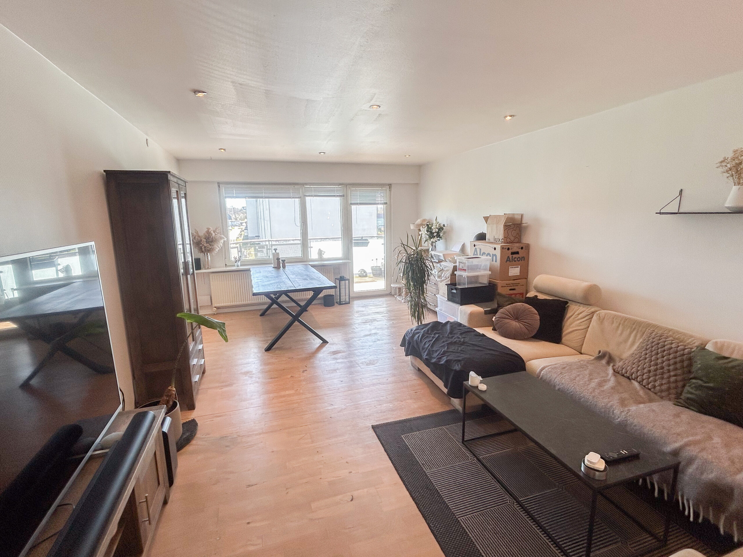 Lejlighedens stue fremstår lys og indbydende med god plads til både opholds- og spiseafdeling. Herfra er der direkte udgang til en stor, solrig altan med udsigt over grønne græsarealer – et perfekt sted at nyde udelivet i rolige omgivelser.