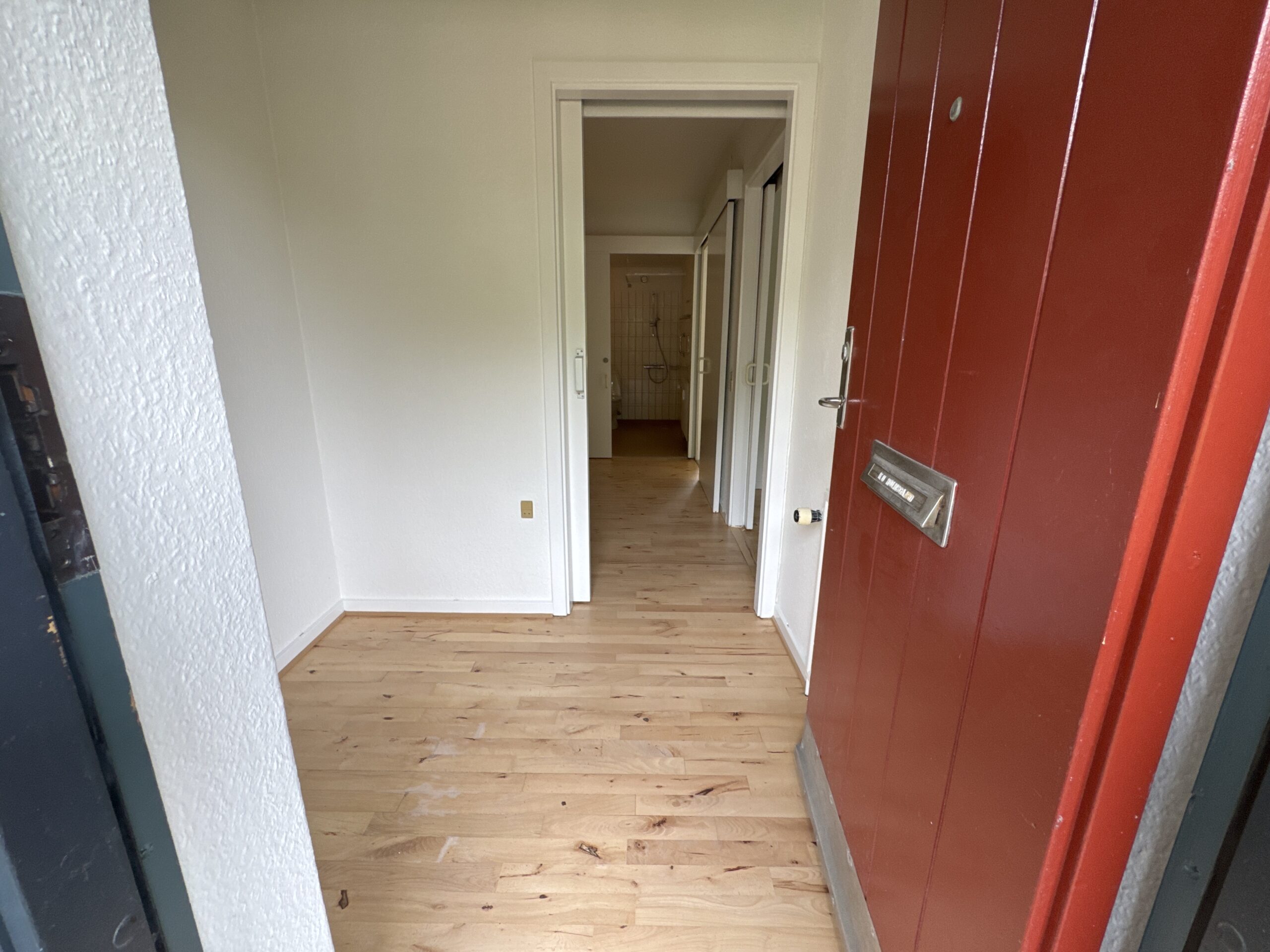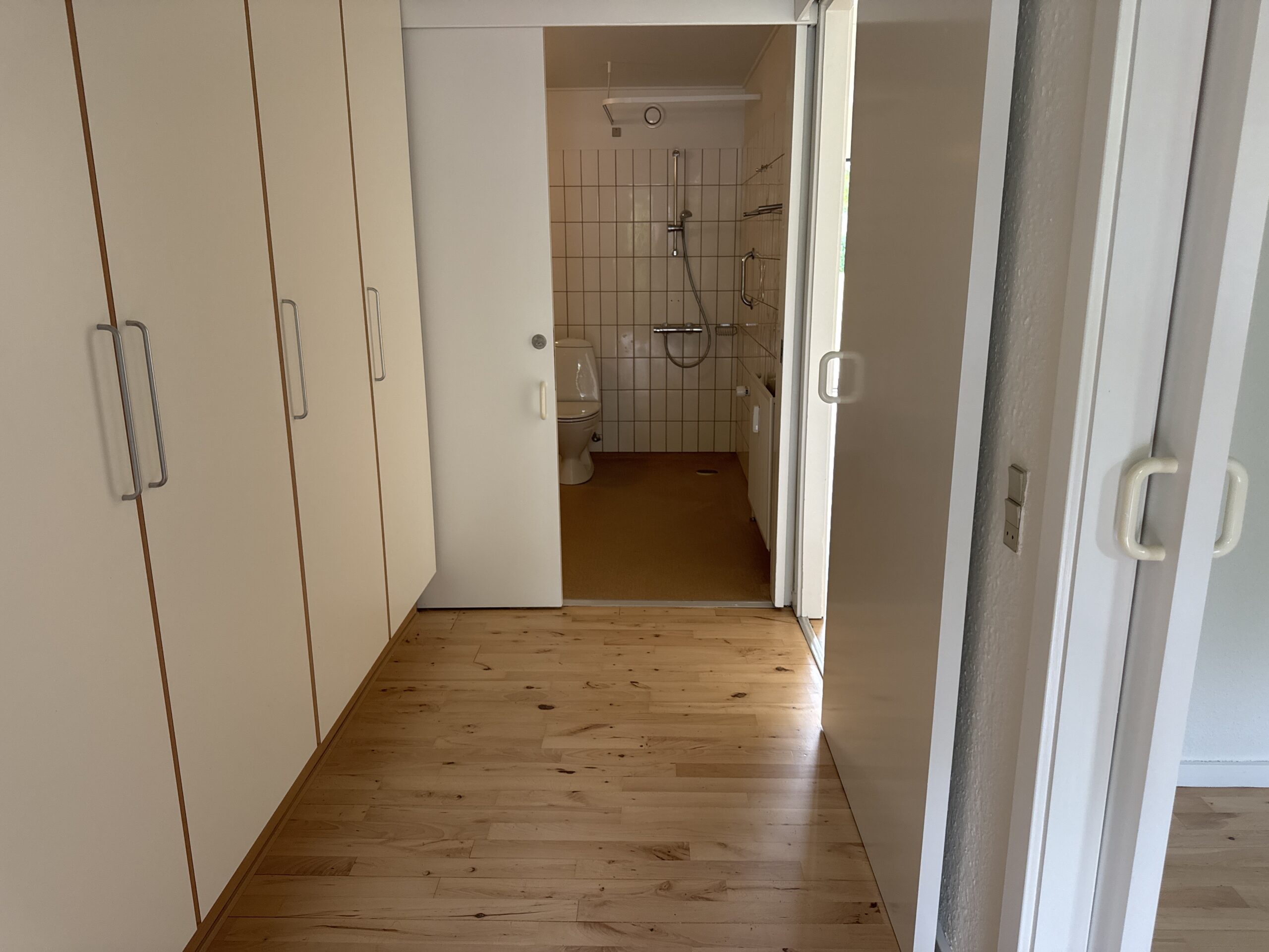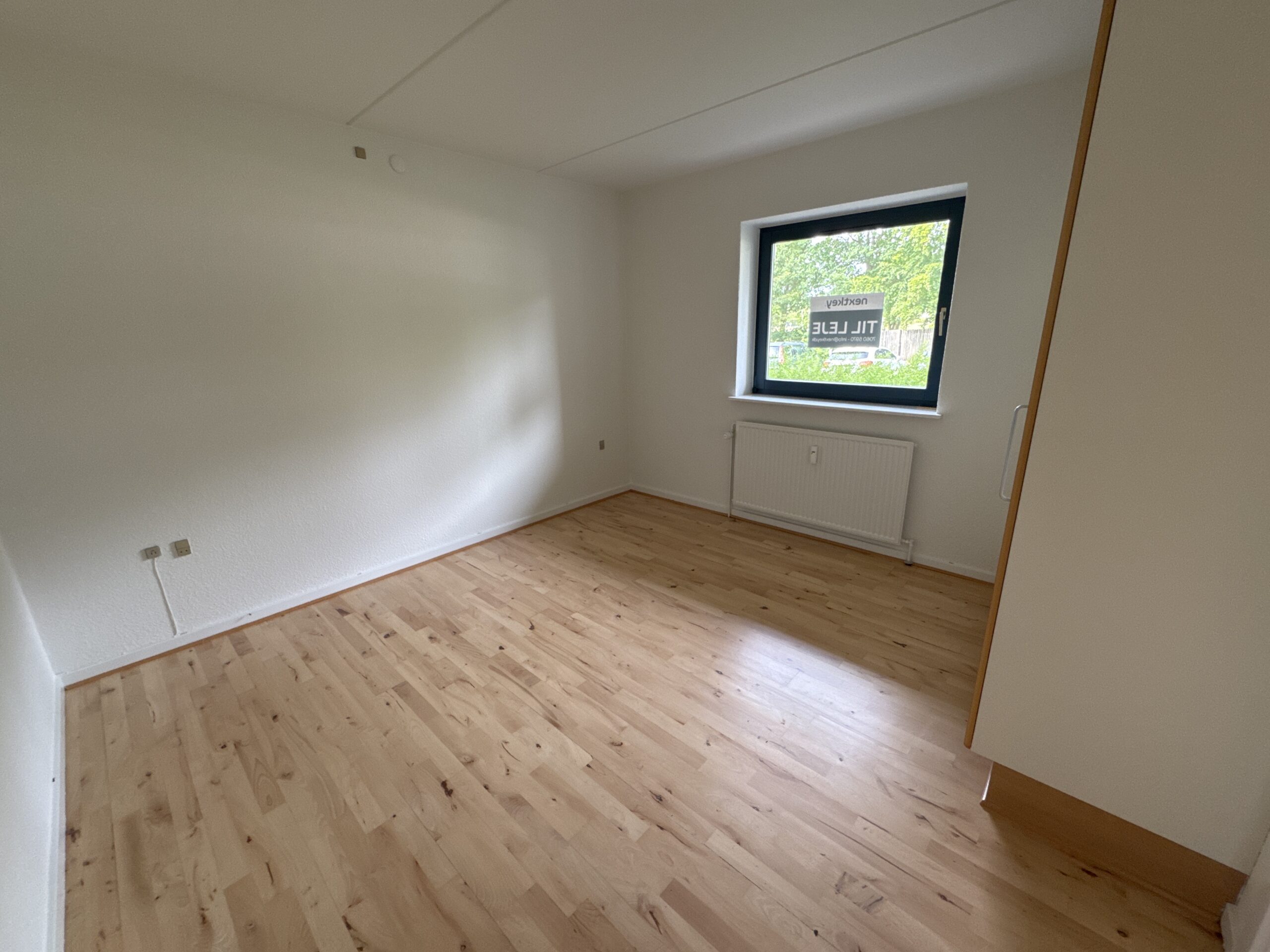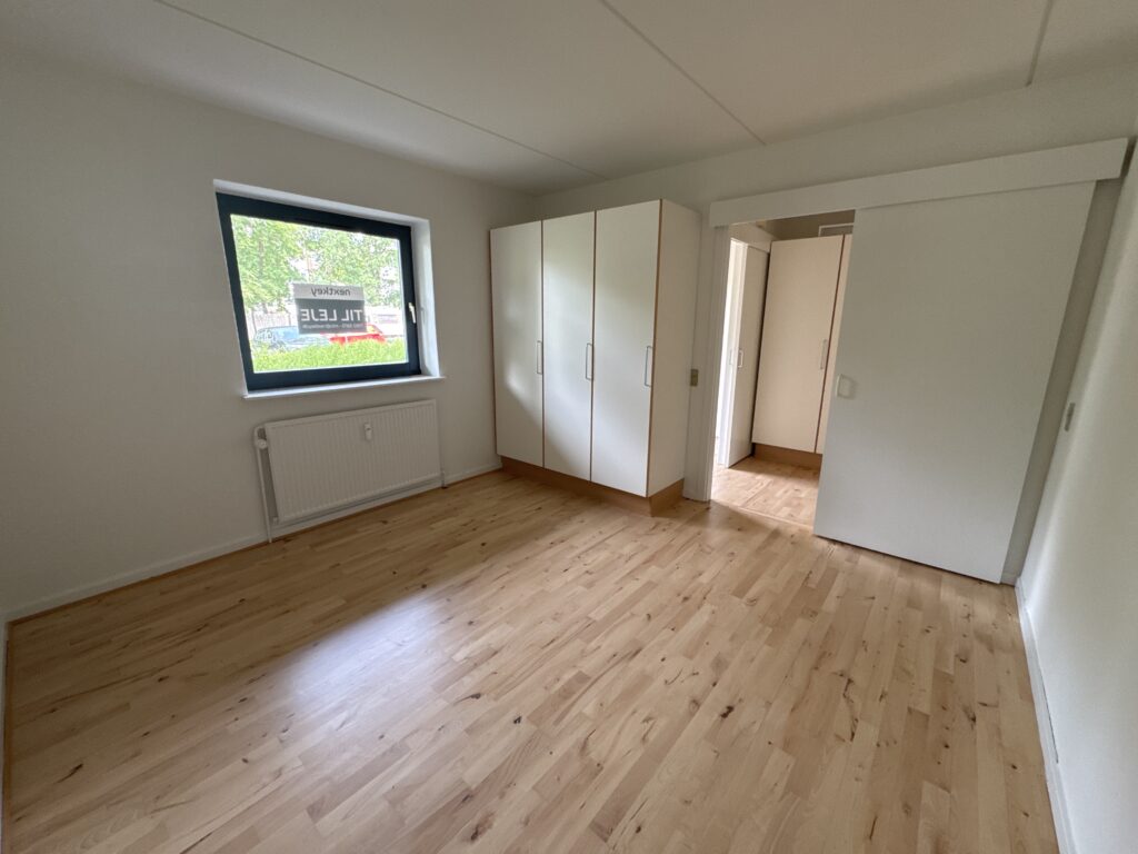 Du træder ind i en entré med adgang til resten af boligen. Lejligheden rummer et godt soveværelse med indbyggede skabe og plads til både seng og opbevaring.