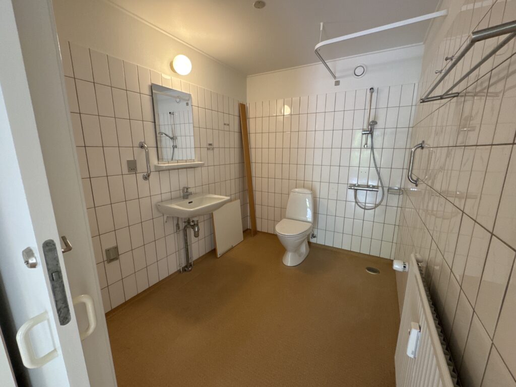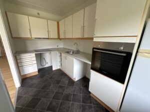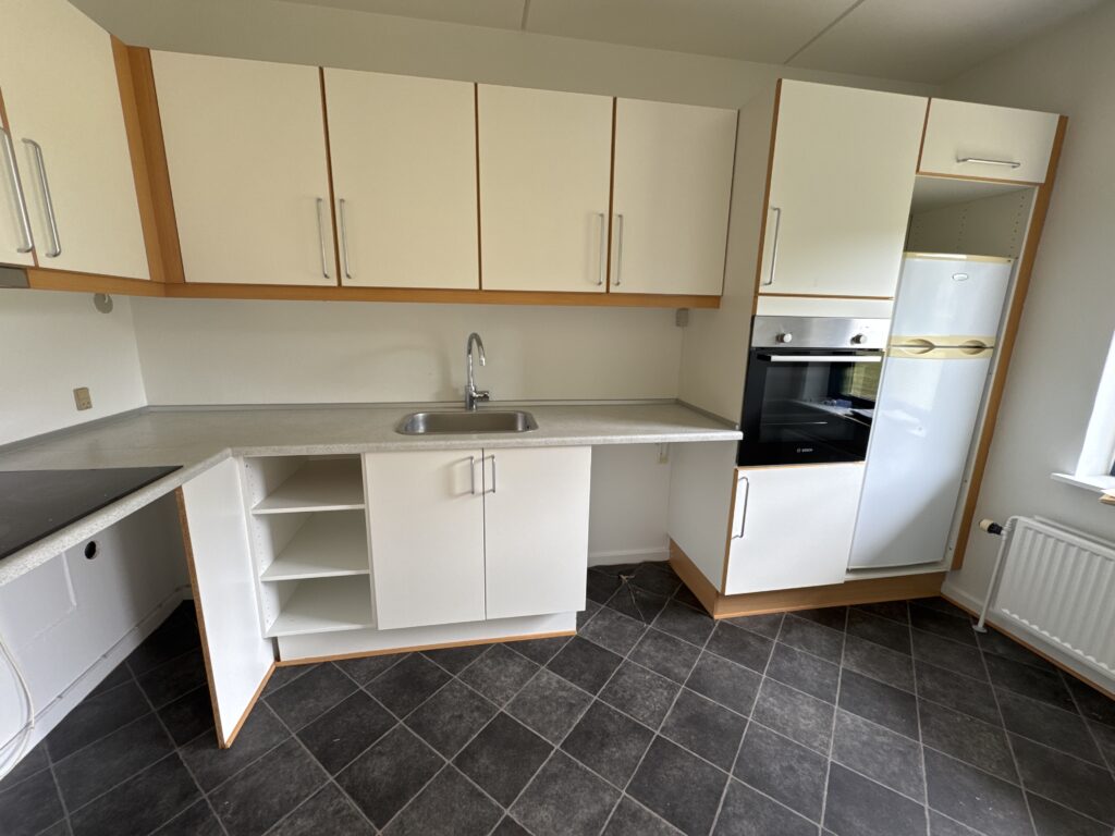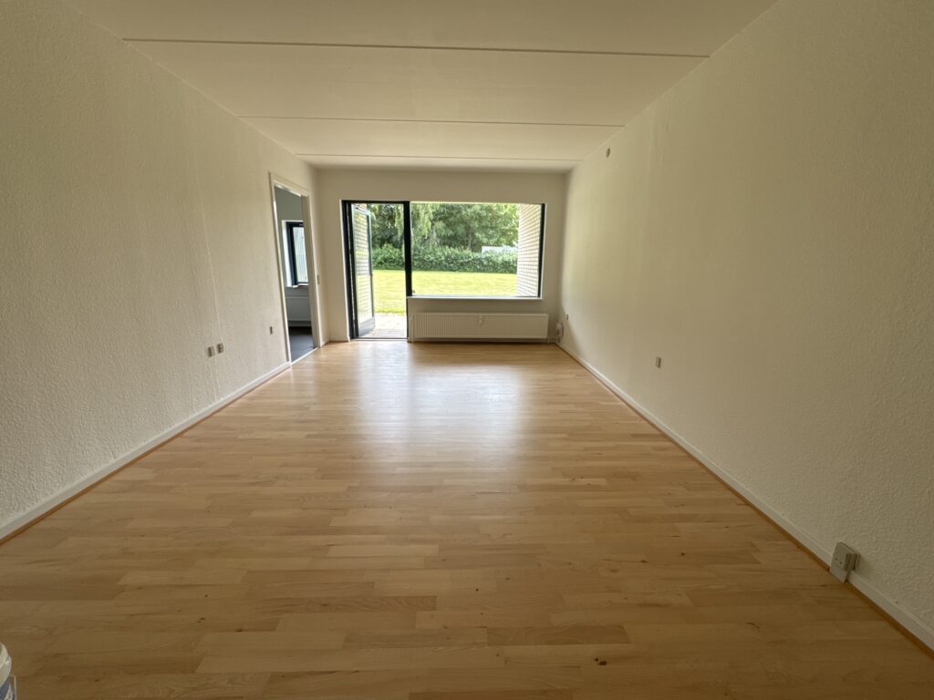 Stuen er lys og indbydende og har direkte udgang til en privat terrasse – perfekt til afslapning eller en kop kaffe i det fri. Køkkenet ligger i åben forbindelse med stuen og har mulighed for installation af opvaskemaskine.