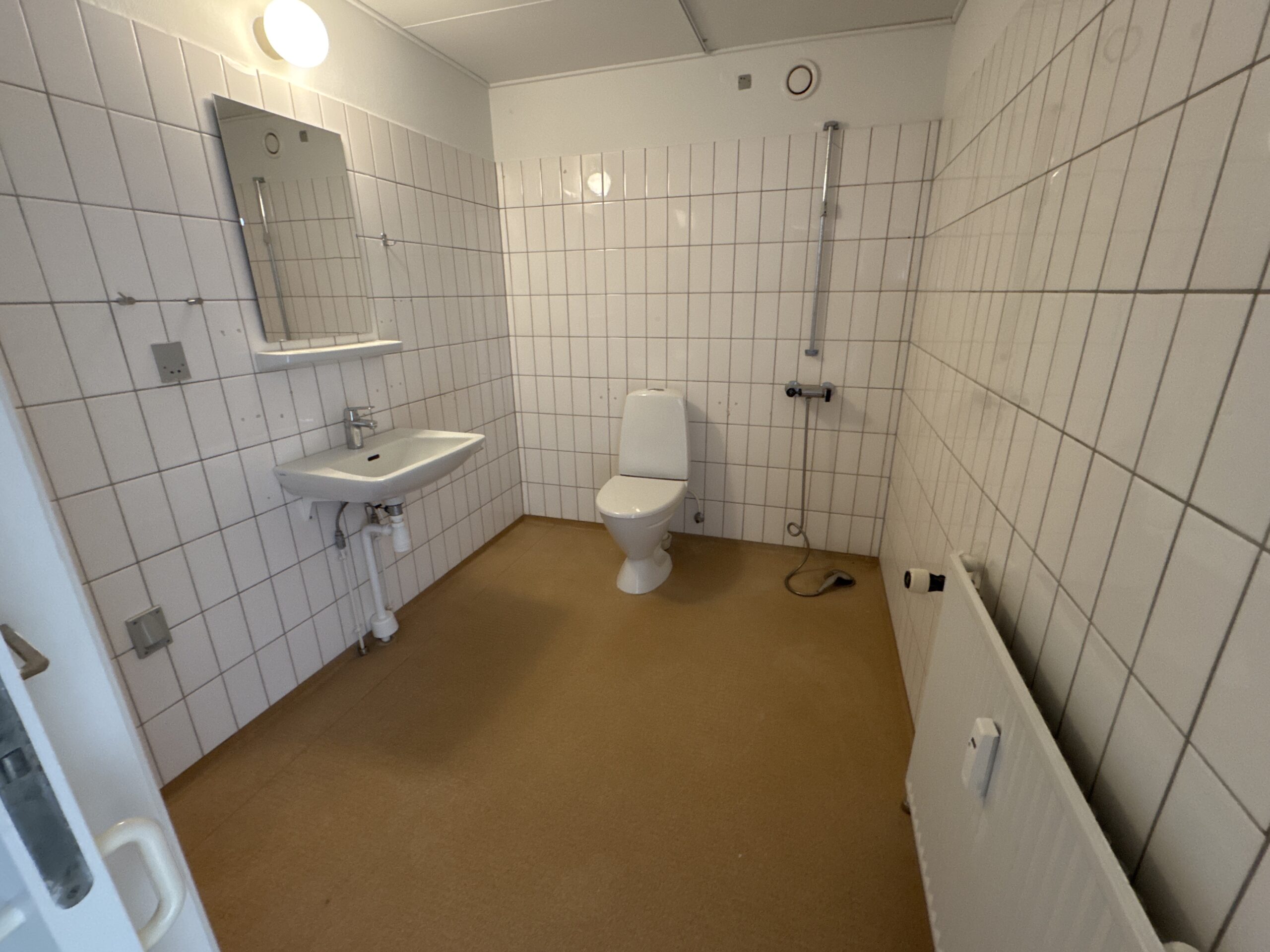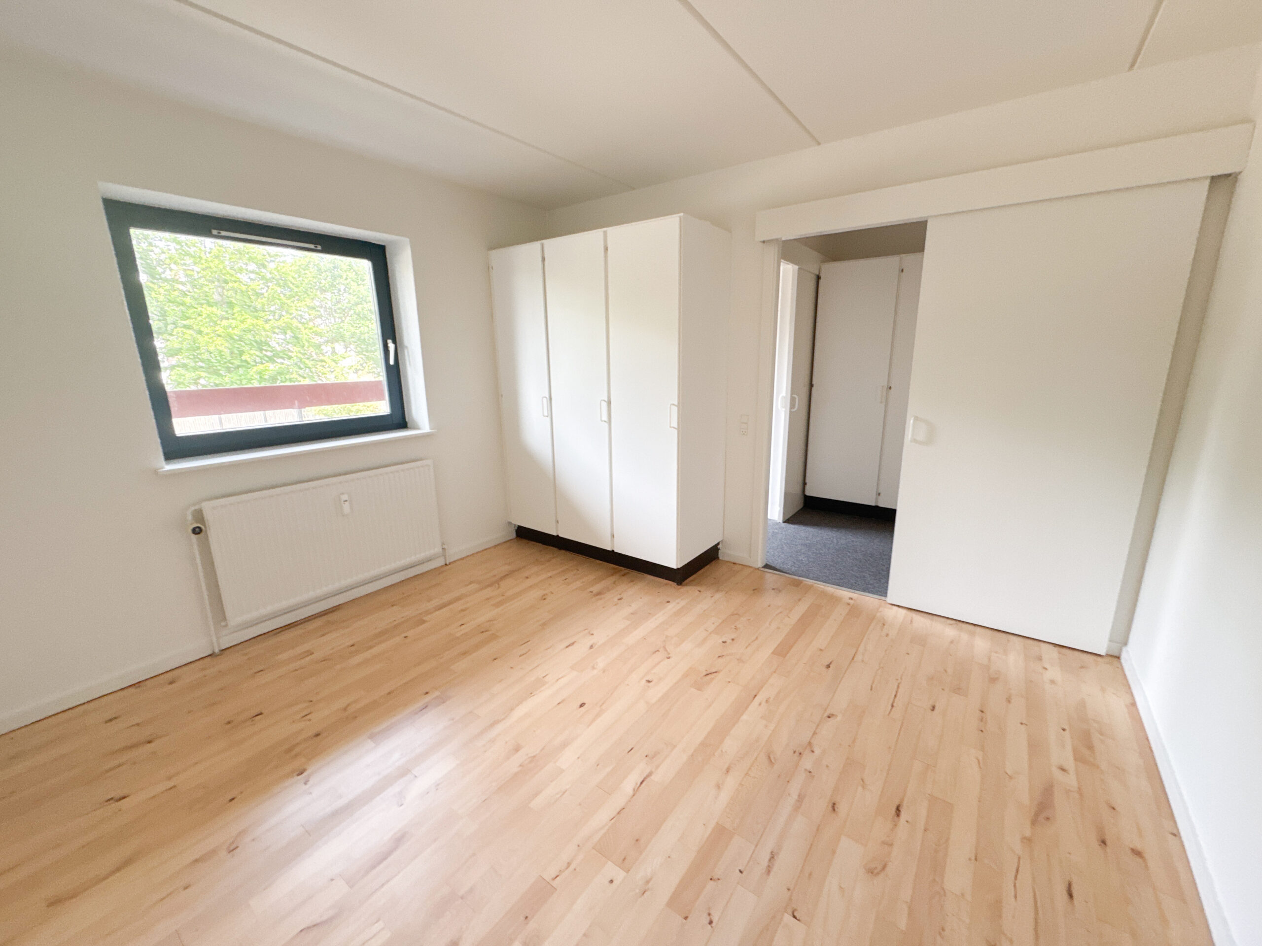 Fra entréen er der direkte udgang til en fordelingsgang med en god gang klædeskabe. Herfra er der adgang til lejlighedens soveværelse, der har indbygget skab og plads til en stor seng – et perfekt rum til ro og afslapning. For enden af entréen finder du det rummelige badeværelse, hvor der er gjort klar til installation af vaskemaskine, hvilket giver ekstra bekvemmelighed i hverdagen.