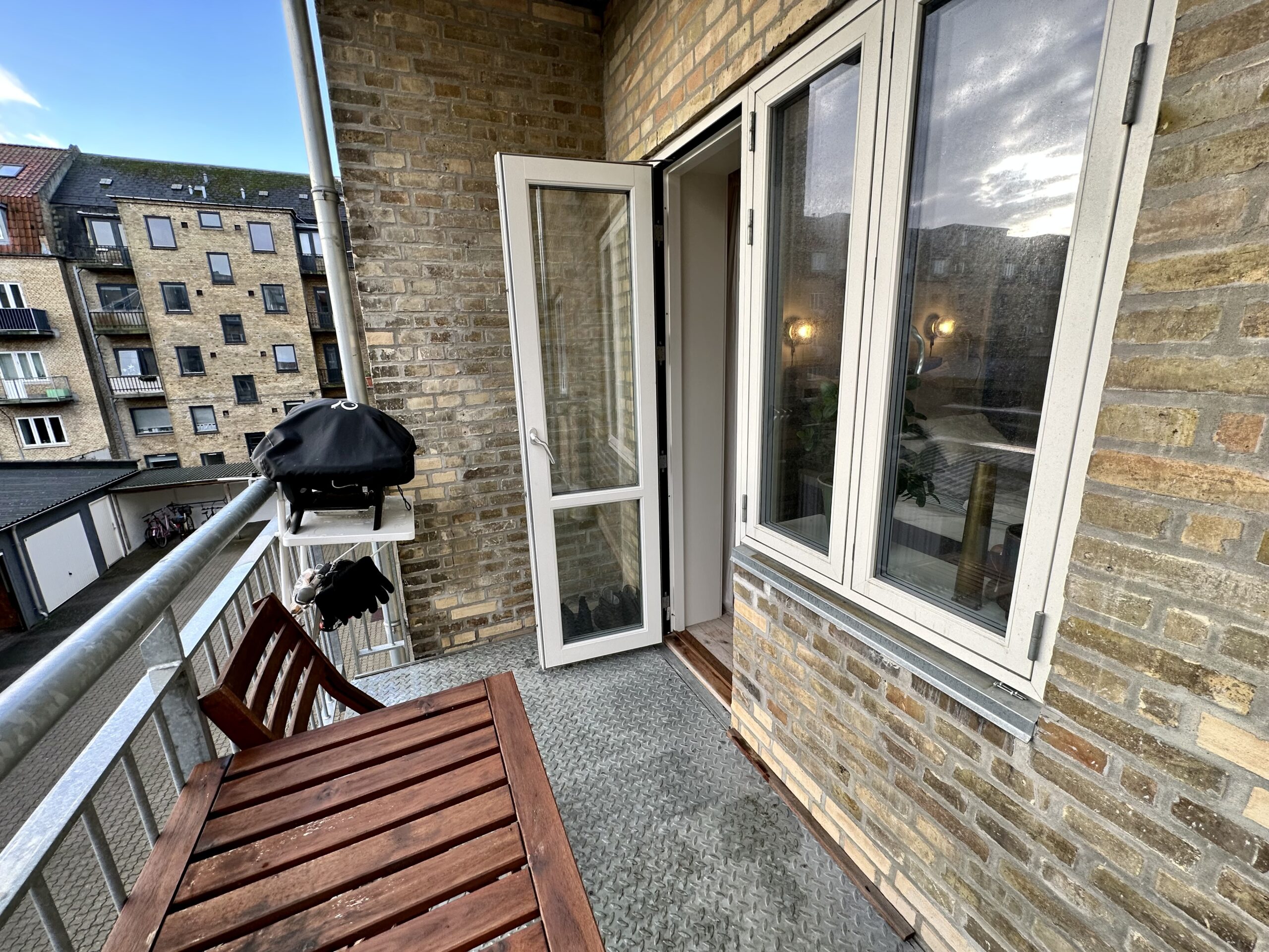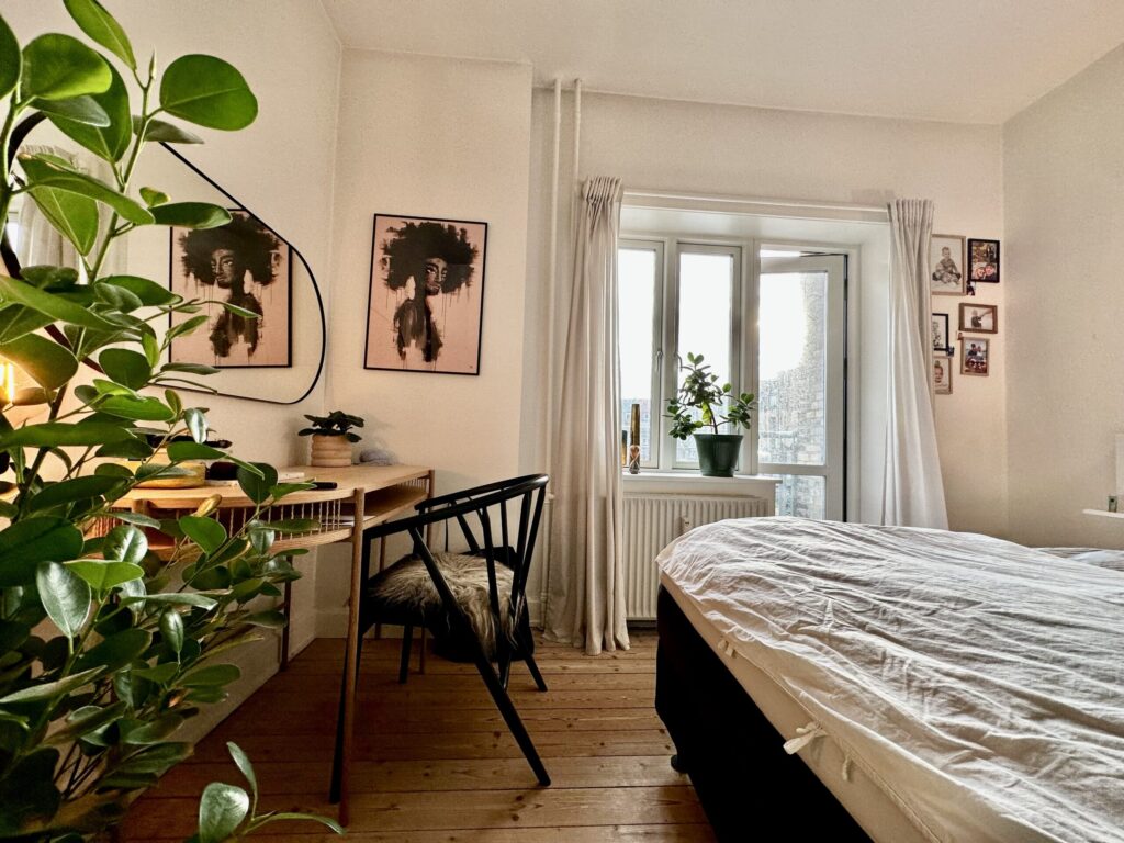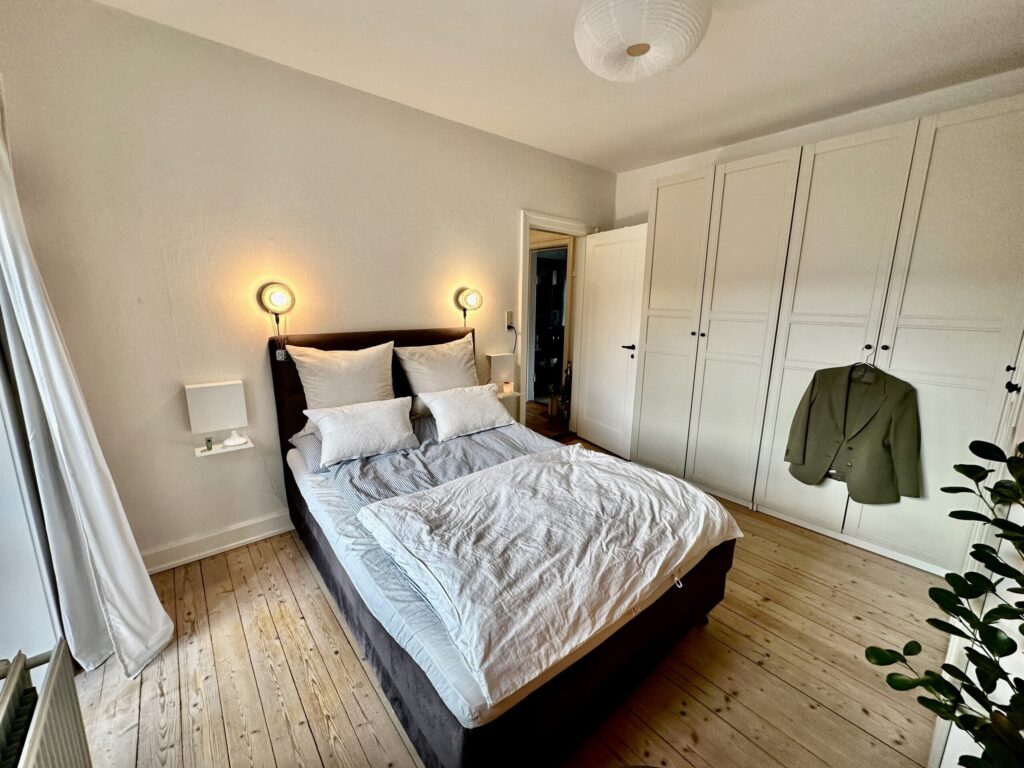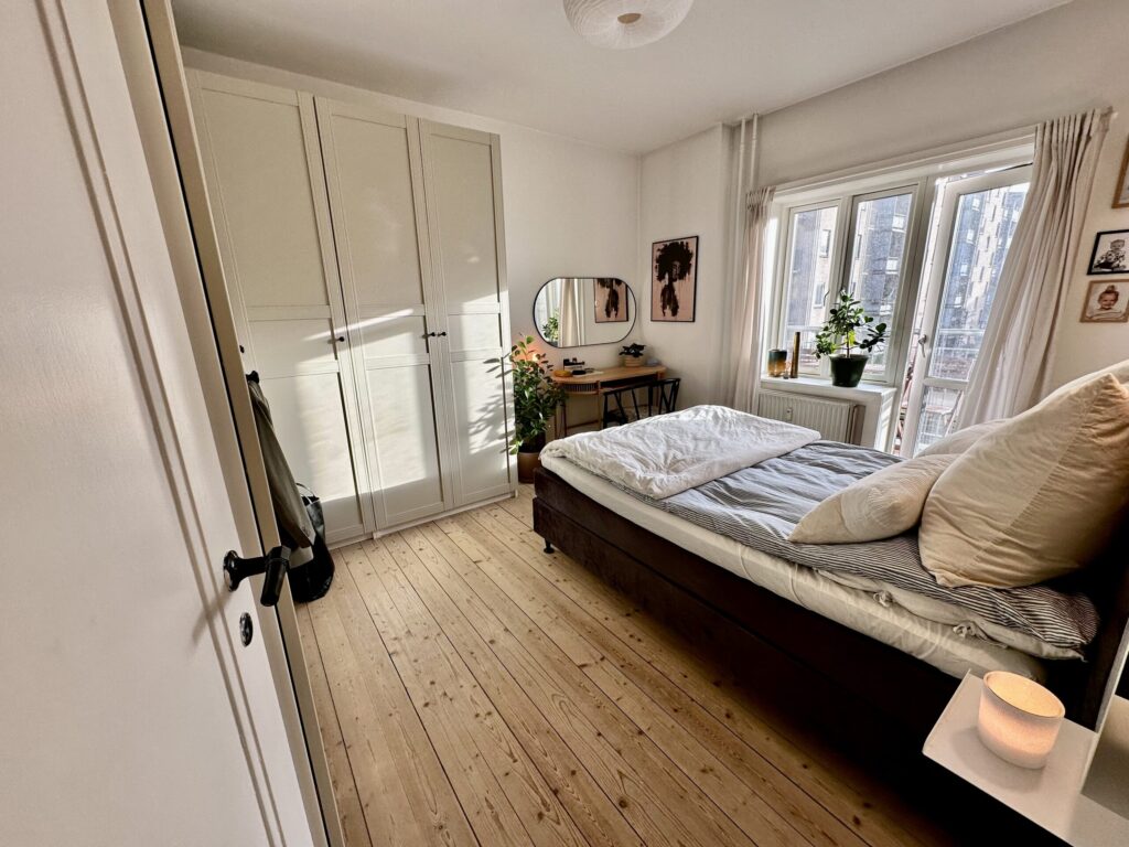 Soveværelset er en oase af ro med plads til et godt klædeskab til opbevaring og en fortryllende altandør, der inviterer solens stråler og frisk luft ind.