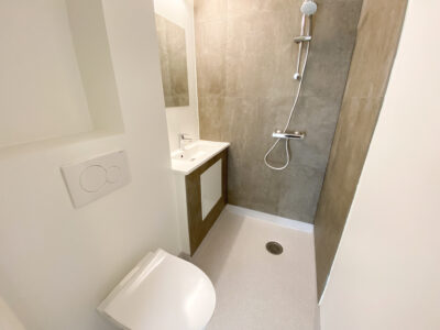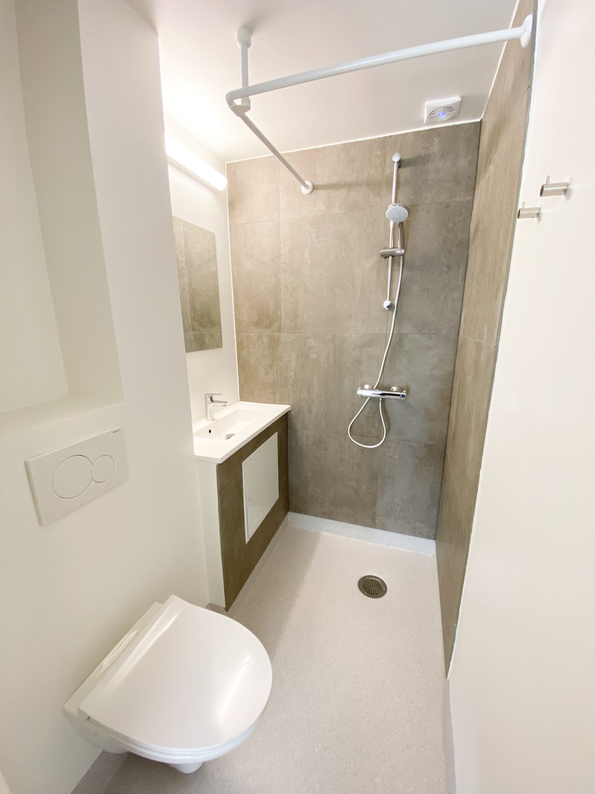 Badeværelset er netop totalrenoveret og er lavet i nogle gode praktiske elementer og der er prioriteret plads til et separat brusespot.