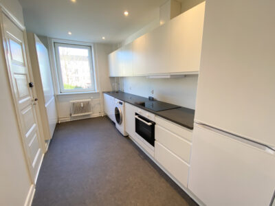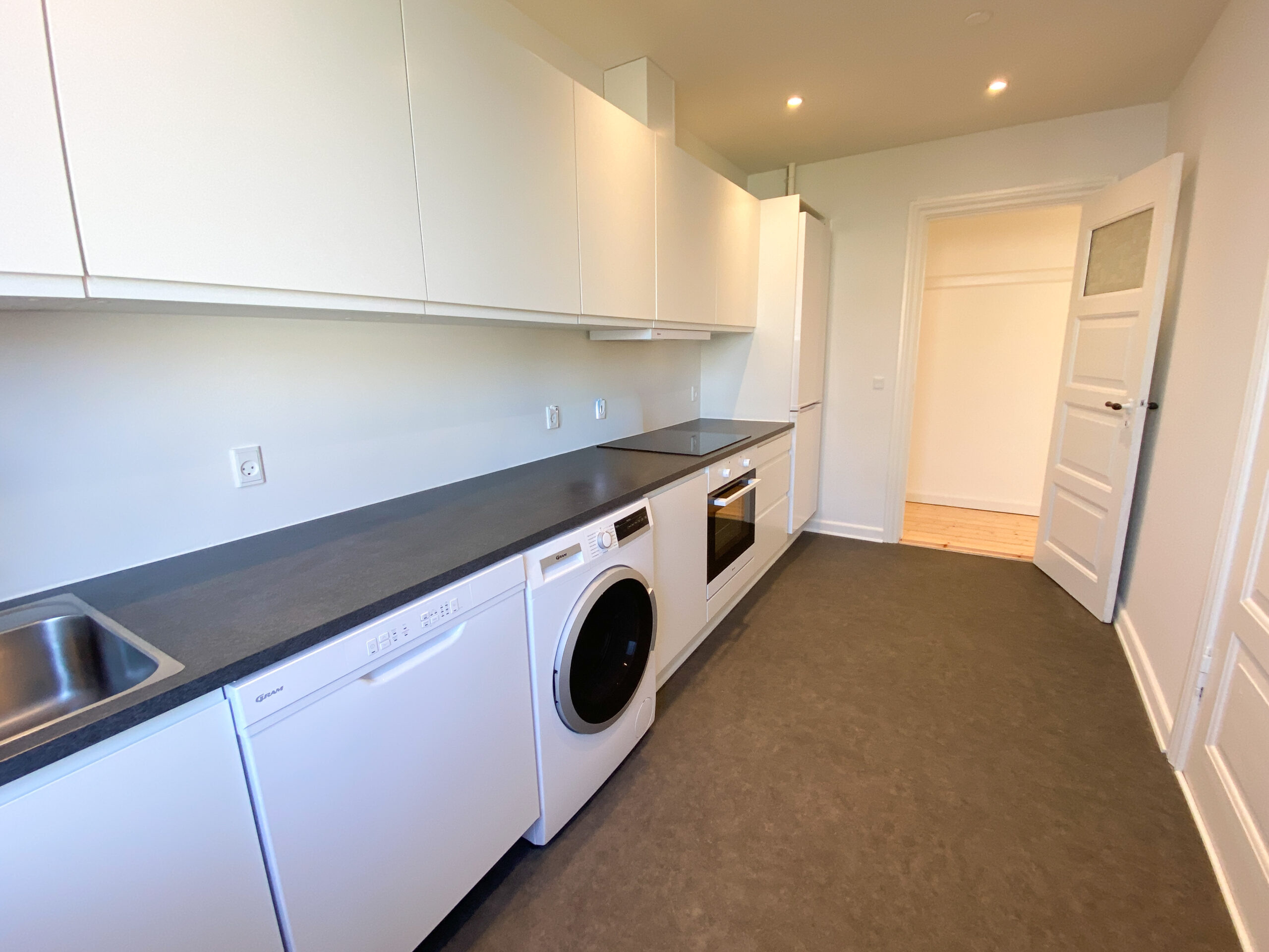 Køkkenet er ligeledes totalrenoveret, har masser af plads og er moderne med både opvaskemaskine vaskemaskine installeret.