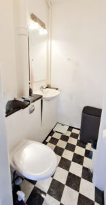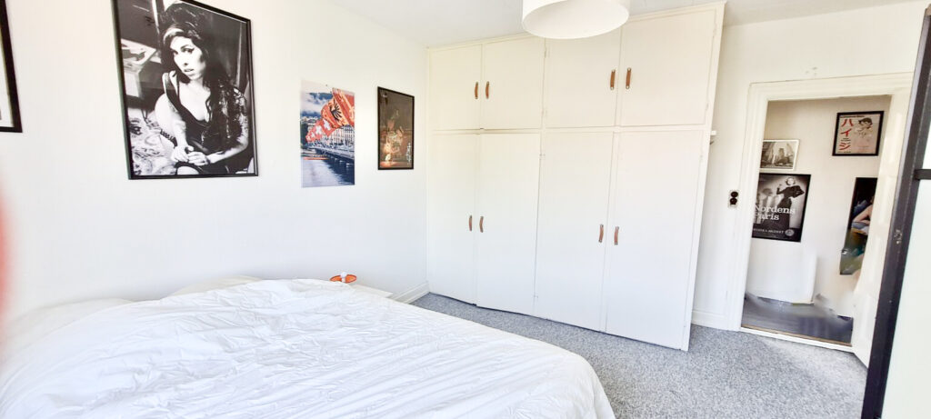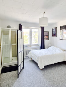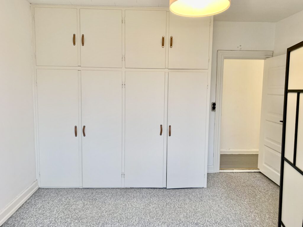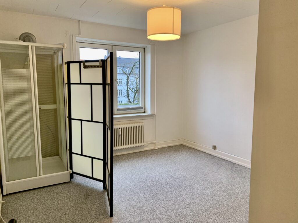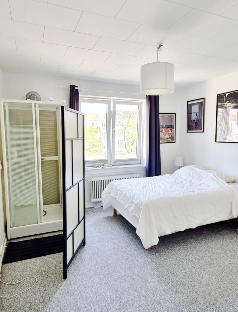 Det nyere toilet tilføjer en moderne touch til lejligheden og gør dagligdagen lettere. For dem, der foretrækker bad, er der en praktisk brusekabine installeret i soveværelset, hvilket giver en ekstra bekvemmelighed. Soveværelset imponerer med sine indbyggede skabe og plads til en stor seng, hvilket giver masser af opbevaringsmuligheder og komfort.