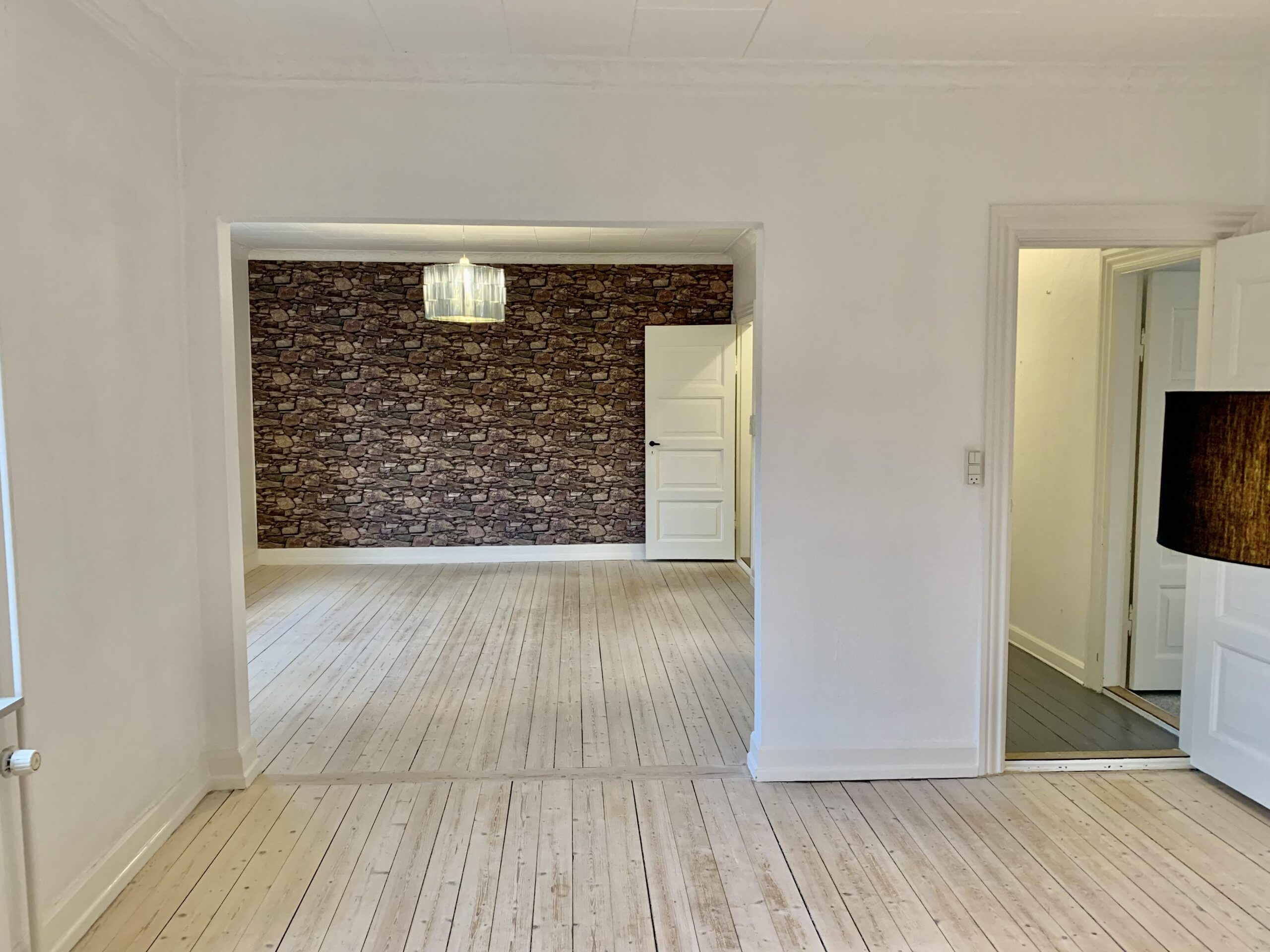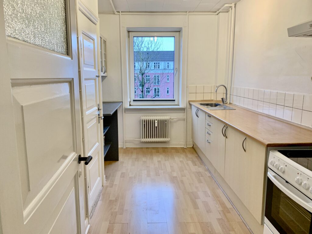 Gangen og køkkenet har fået nyt gulv, der giver et friskt og stilfuldt udseende til disse områder. Dette skaber en harmonisk overgang i hele lejligheden og tilføjer et moderne touch.