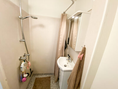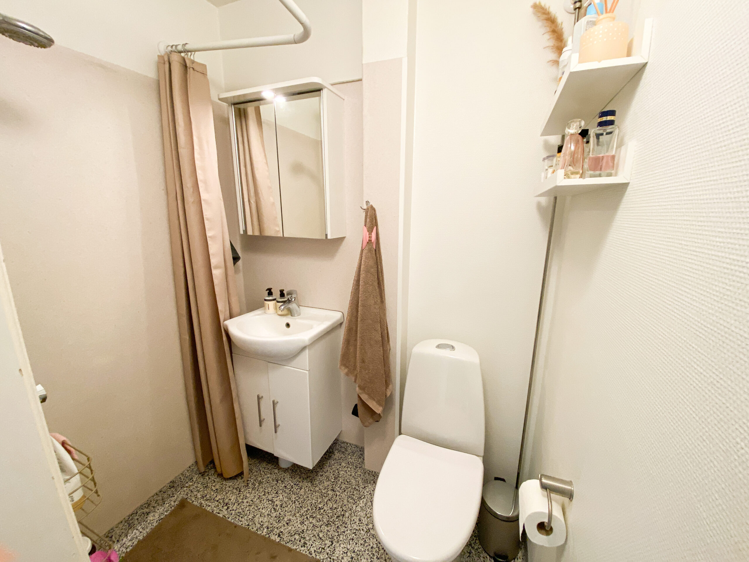 Til højre finder du det funktionelle badeværelse, som er smart opdelt. Lige ved indgangen er toilettet, mens håndvasken og bruseområdet er placeret separat, så det føles rummeligt og praktisk.